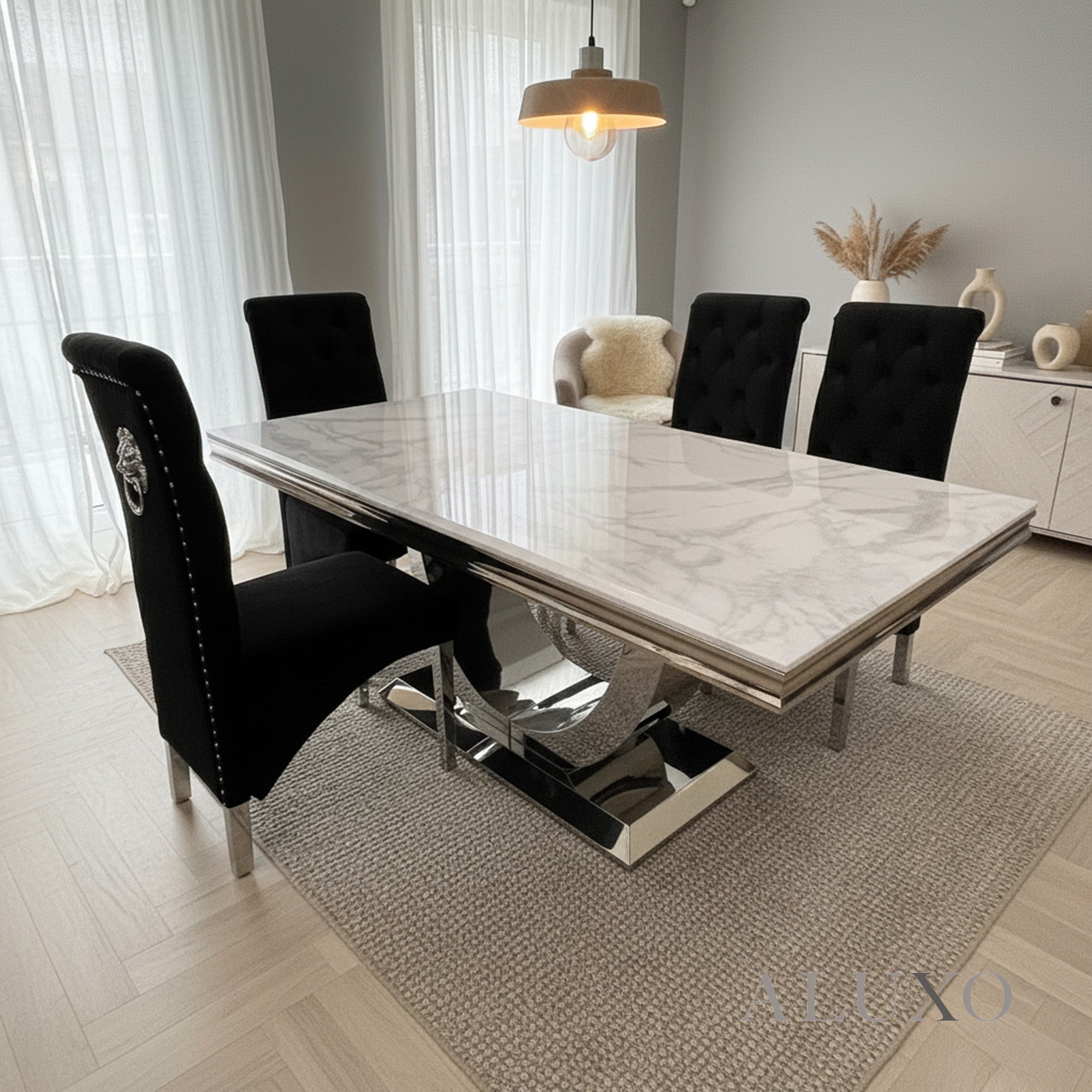 The Urban 1.8m White Marble Dining Table is perfect for large families, seating up to 10 comfortably. Featuring a high-quality white marble laminate top (15–25mm) with subtle mid-grey veining and a polished chrome U-shaped pedestal base, this table combines luxury with practicality. Complete your dining space with Einar Black Velvet Chairs, showcasing quilted stitching, button stud detailing, scroll top and chrome legs for a sophisticated, timeless look.