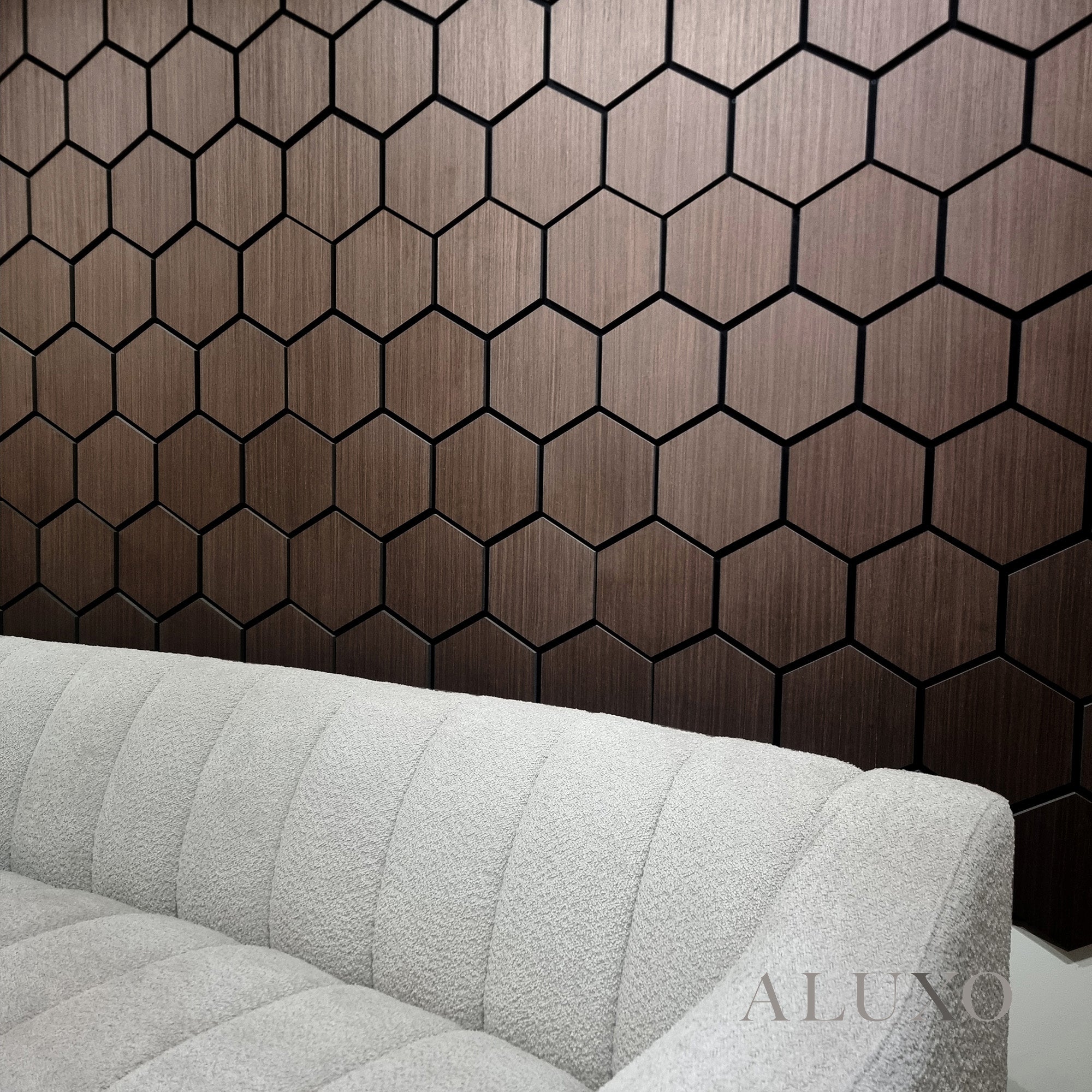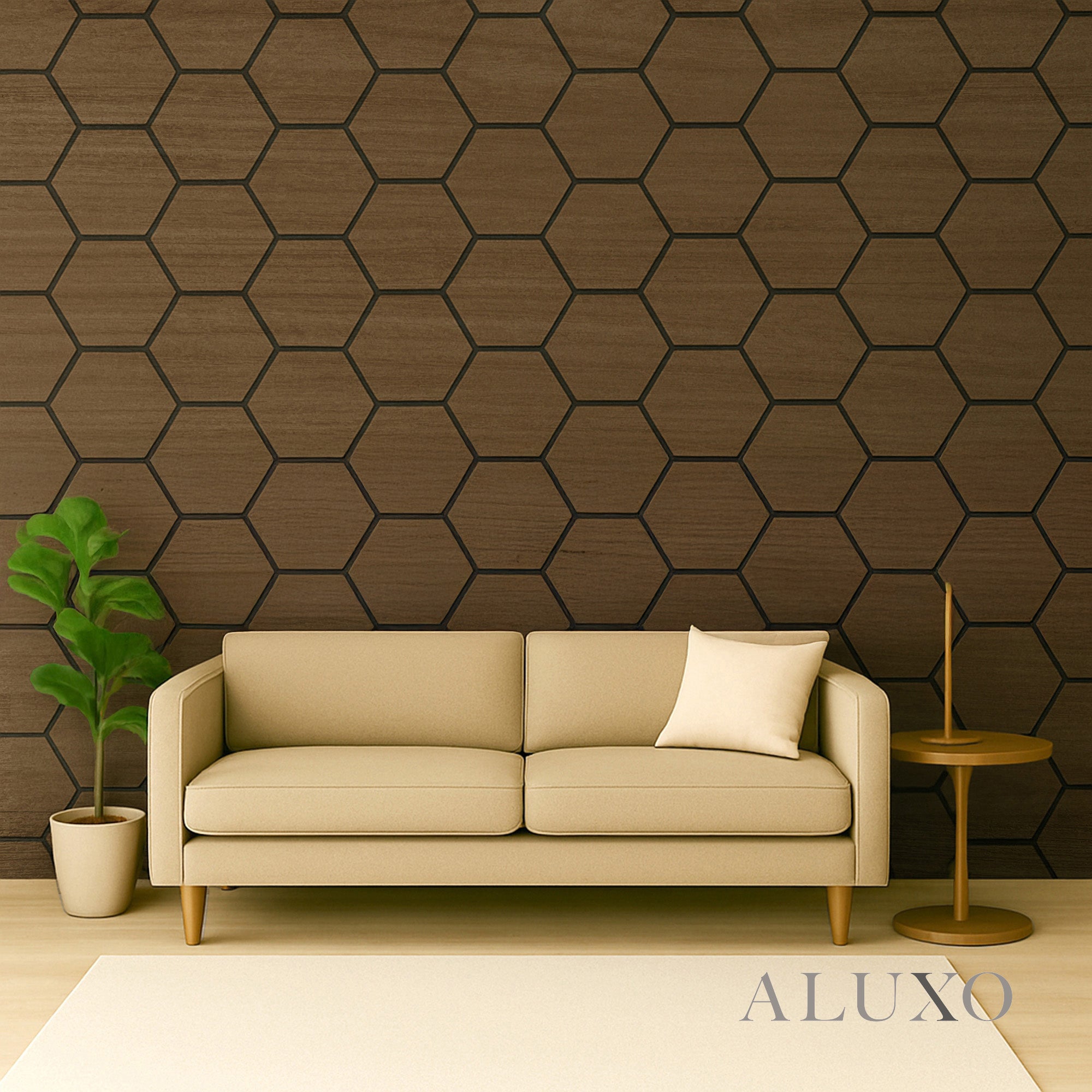 Introduce depth and luxury to your space with the Walnut (Dark Oak) Hexagon Acoustic Wall Panel. Its rich wood grain and geometric form add warmth and sophistication to interiors, while also absorbing excess sound. This panel brings modern, tactile contrast into minimalist or classic environments. Aluxo-Track Aluxo-TrackCopy
