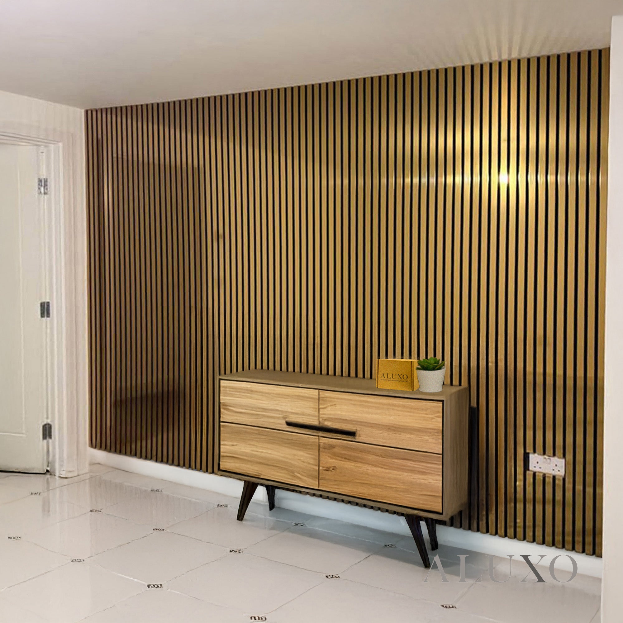 Transform your interiors with stunning slatted wall and ceiling panels designed to combine form and function. Each piece is crafted with a solid wood core and backed with sound-absorbing PET felt to reduce echo and improve ambient acoustics. These panels require no oiling—simply wipe clean with a vacuum or damp cloth.