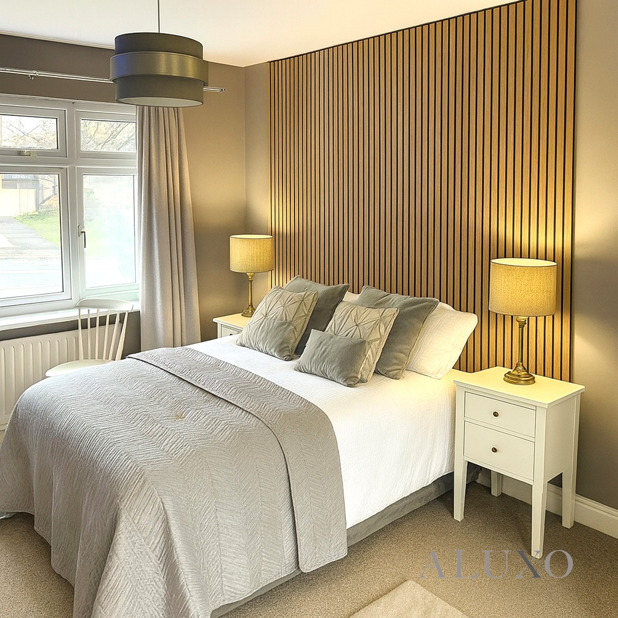 Each panel features real oak-finished slats over a 10mm recycled felt base. The result is a statement design piece that also reduces ambient noise by up to 25% – ideal for home offices, lounges, studios, or bedrooms.