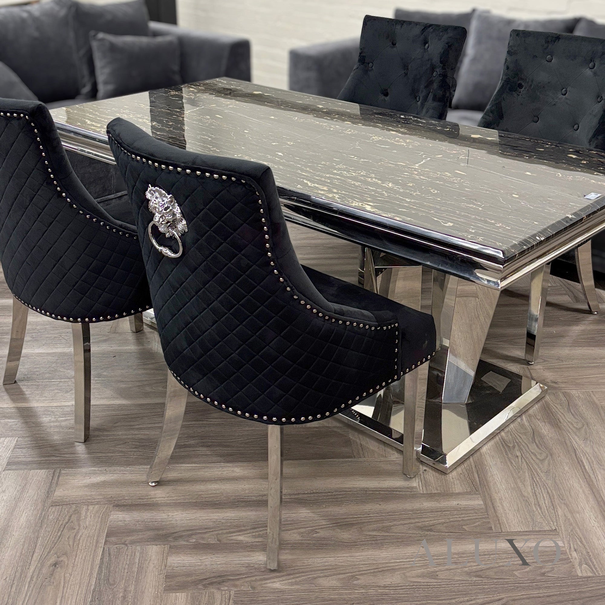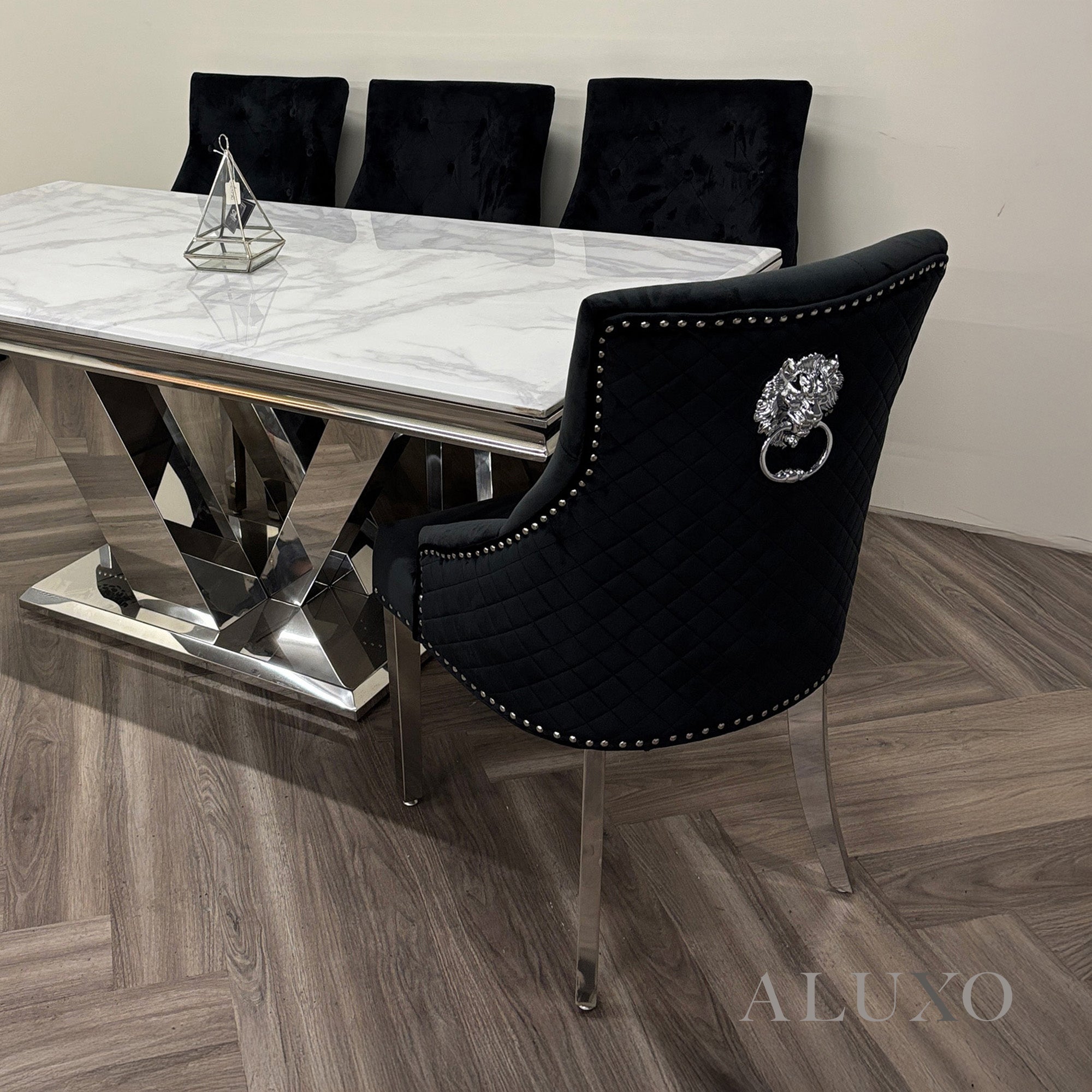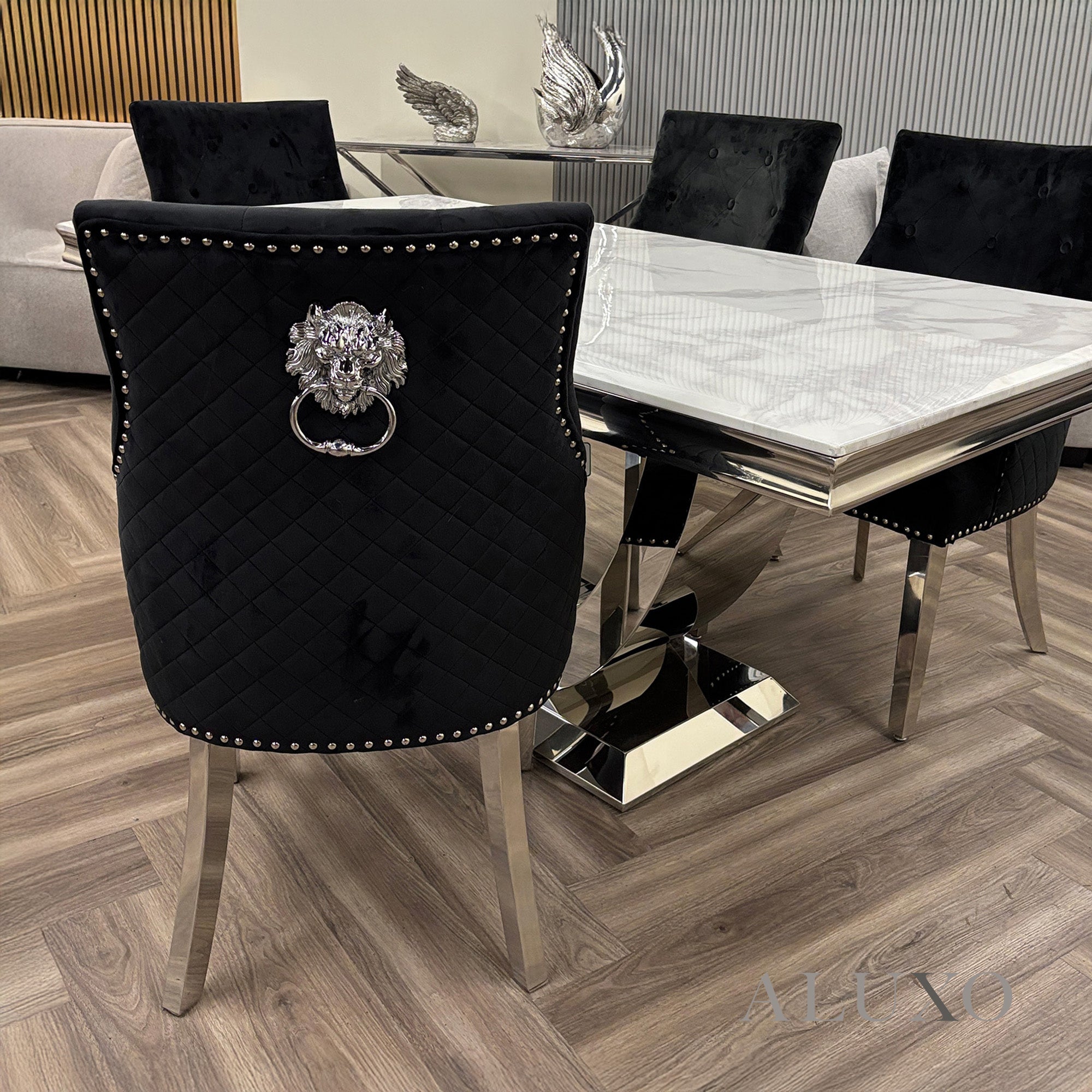 Featuring a striking quilted back design, a polished chrome lion knocker, and studded detailing along the edges, the Henrik chair blends modern luxury with timeless sophistication. Its high-quality chrome legs, subtly curved at the back, deliver stability without compromising style.Aluxo-Key Aluxo-KeyCopy