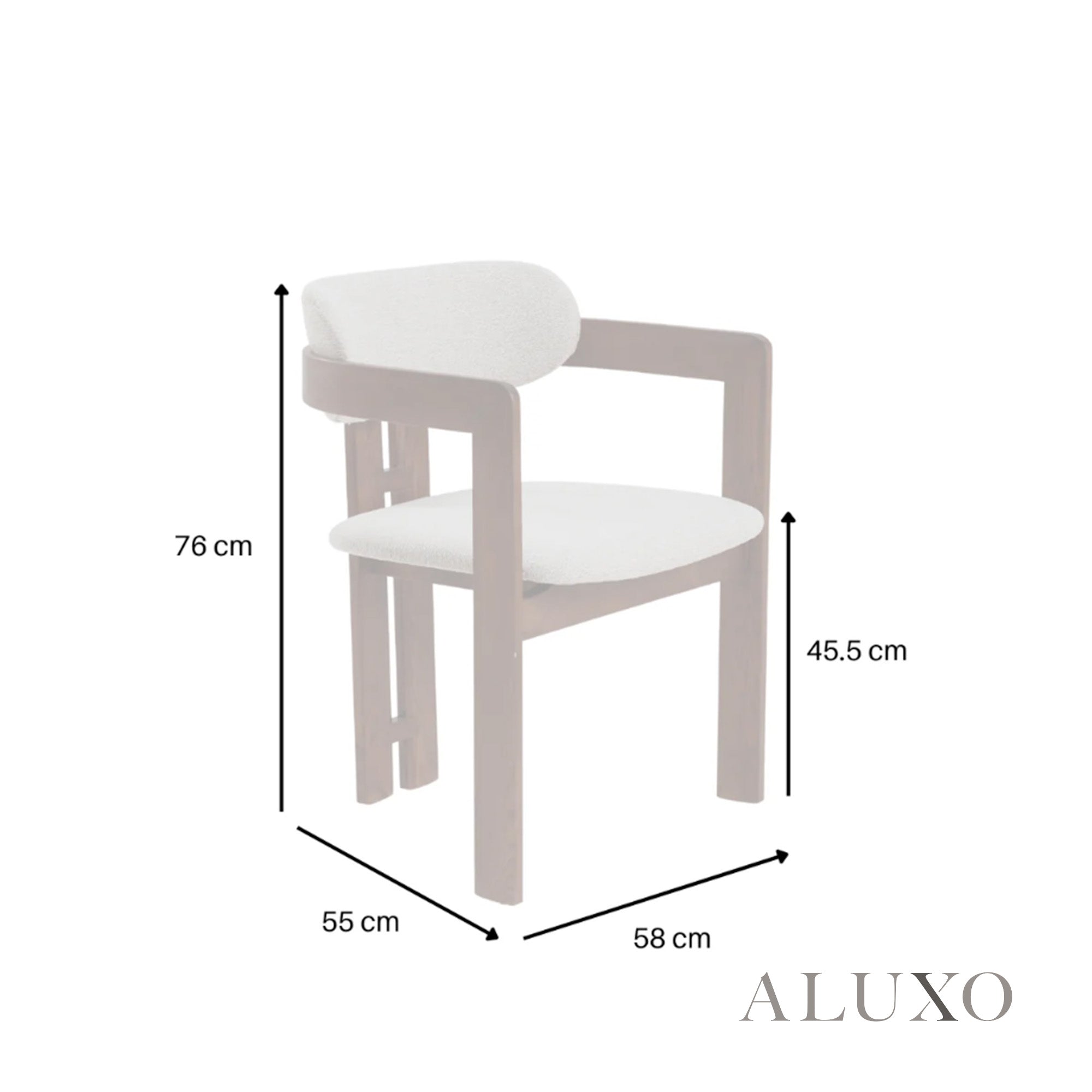 The ALUXO Clara dining chair set of 2 features a walnut-coloured frame paired with oatmeal bouclé upholstery across both seat and back. Combining comfort-focused padding with a softly contoured silhouette, it brings refined style and ease to any dining setting. Aluxo-Track Aluxo-TrackCopy