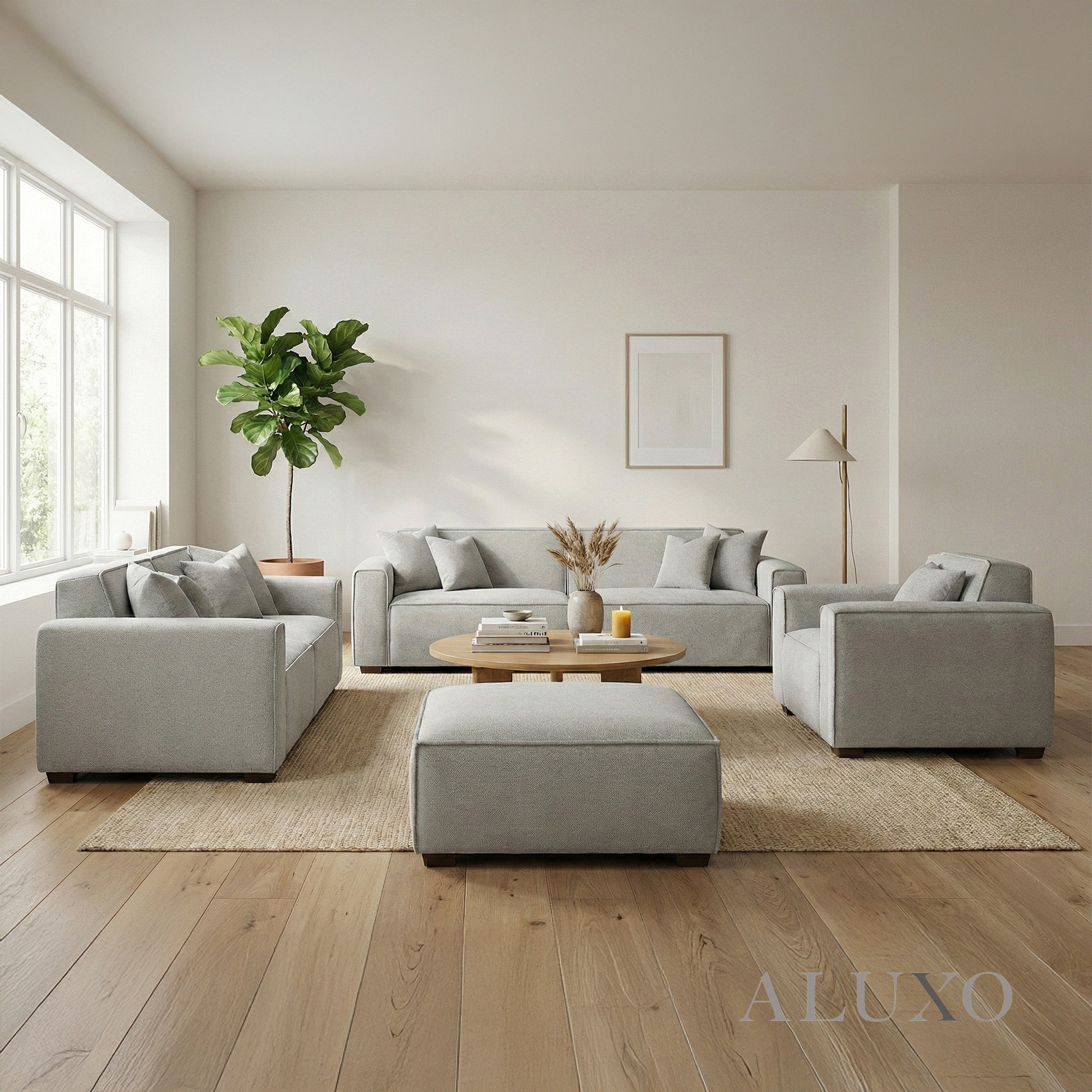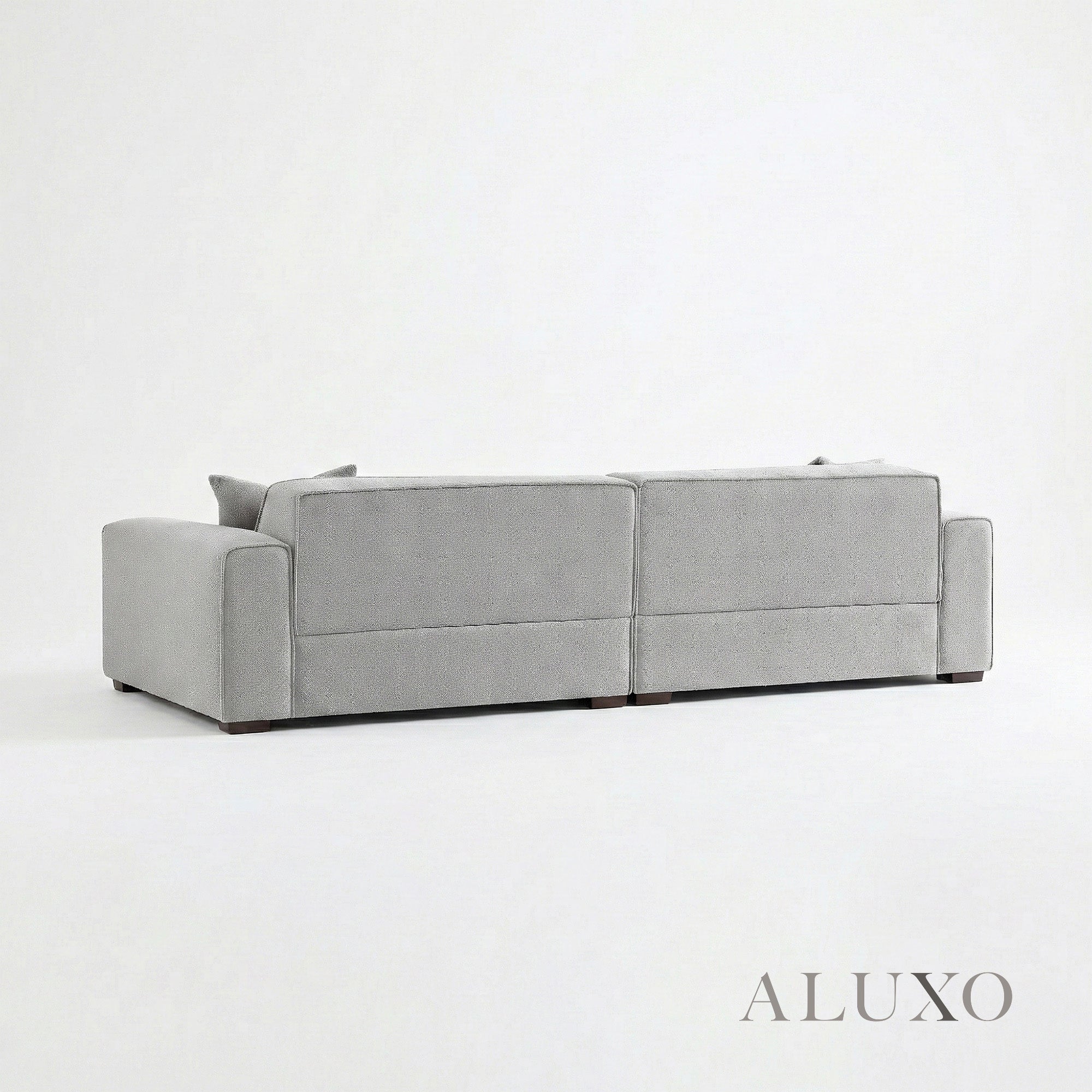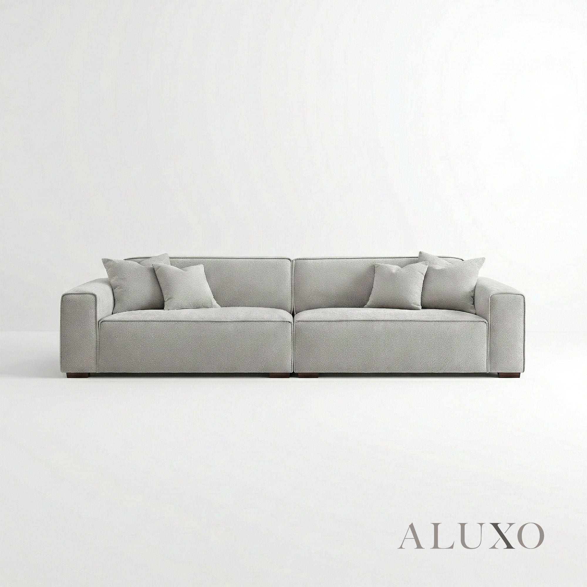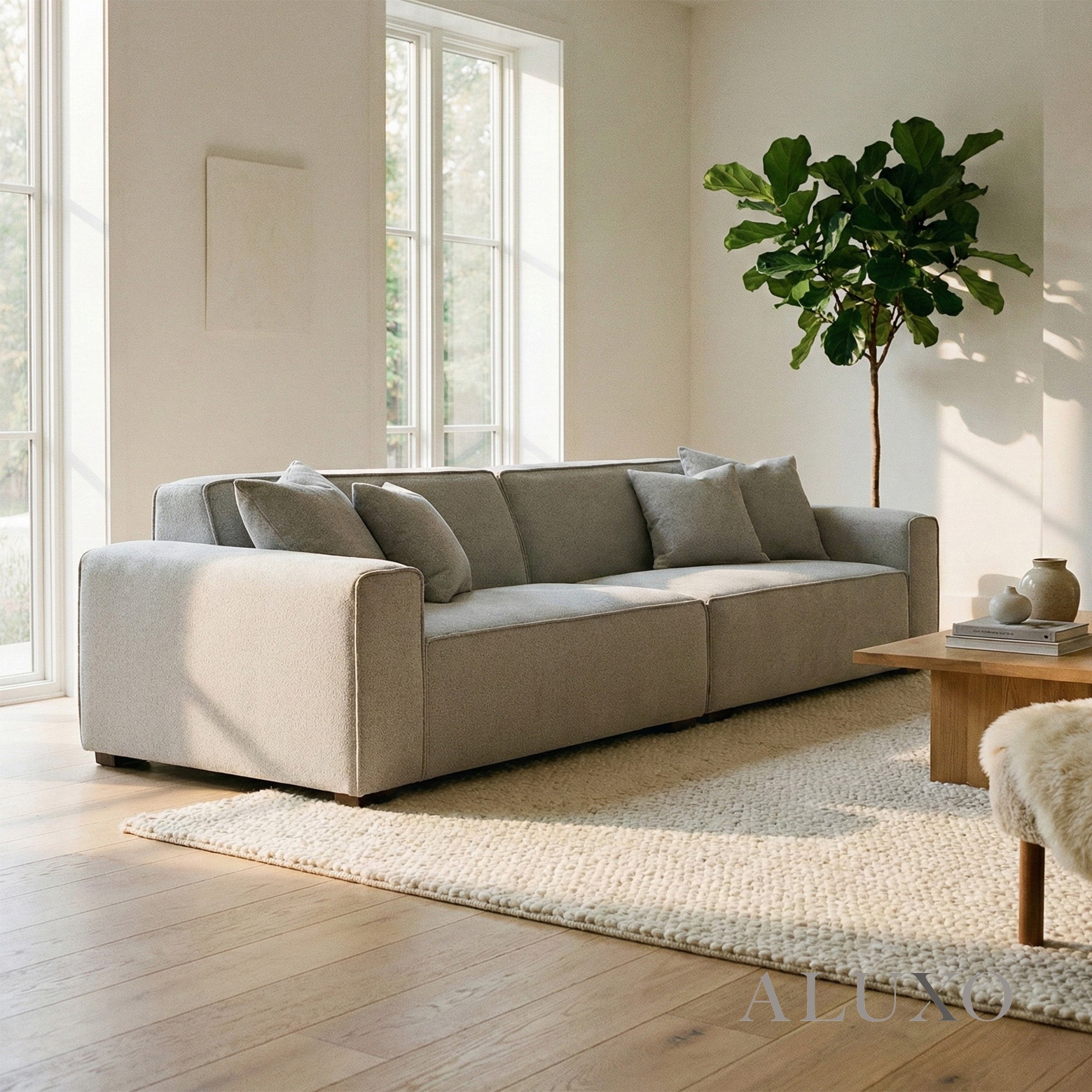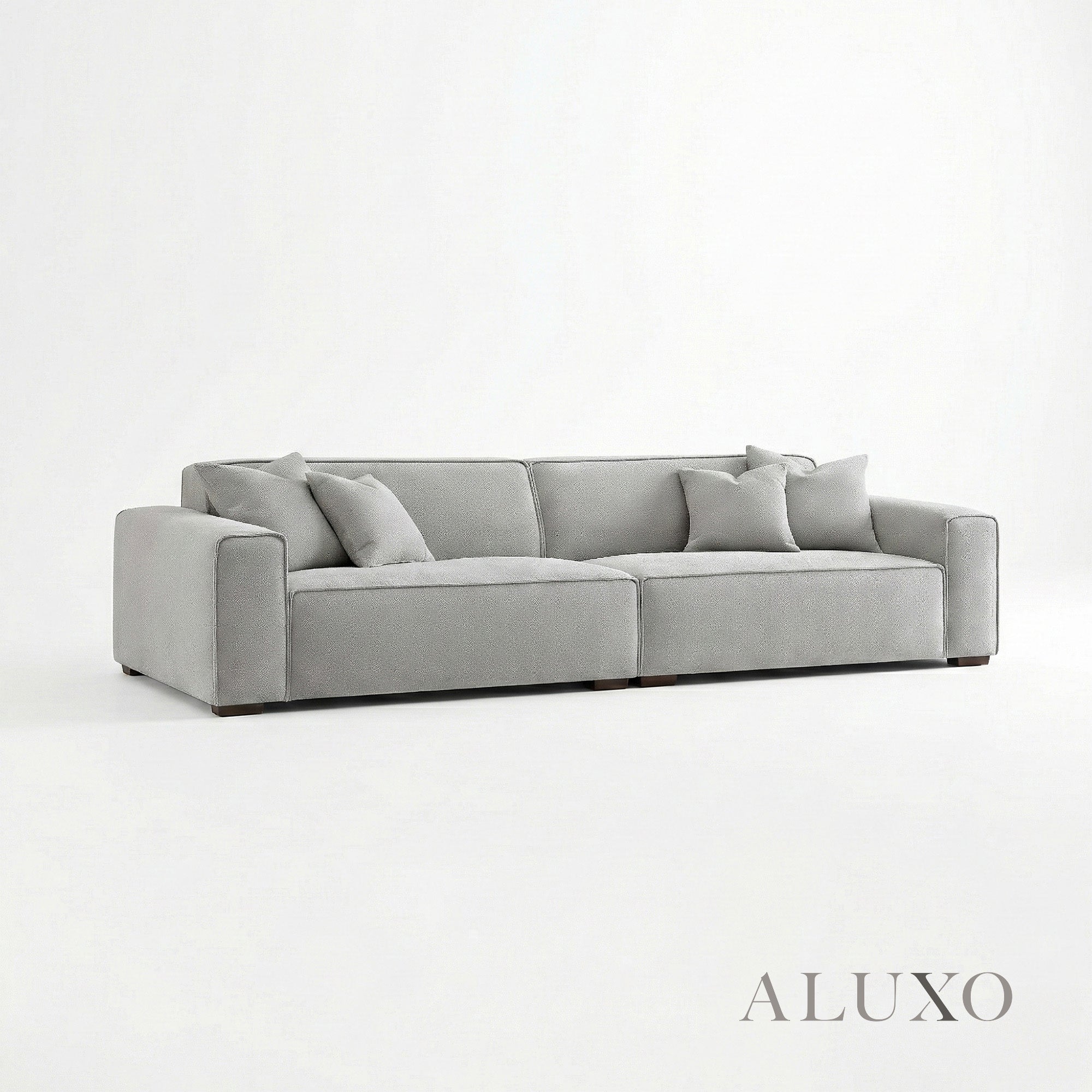 The ALUXO® Dakota 4-Seater Sofa in Pebble Grey Bouclé brings a unified sense of understated sophistication and tactile warmth to large-scale living spaces. Generously filled with natural duck feathers across the seating, arms, and fixed back, it delivers a refined balance of visual weight and indulgent, sink-in comfort. Aluxo-Track Aluxo-TrackCopy