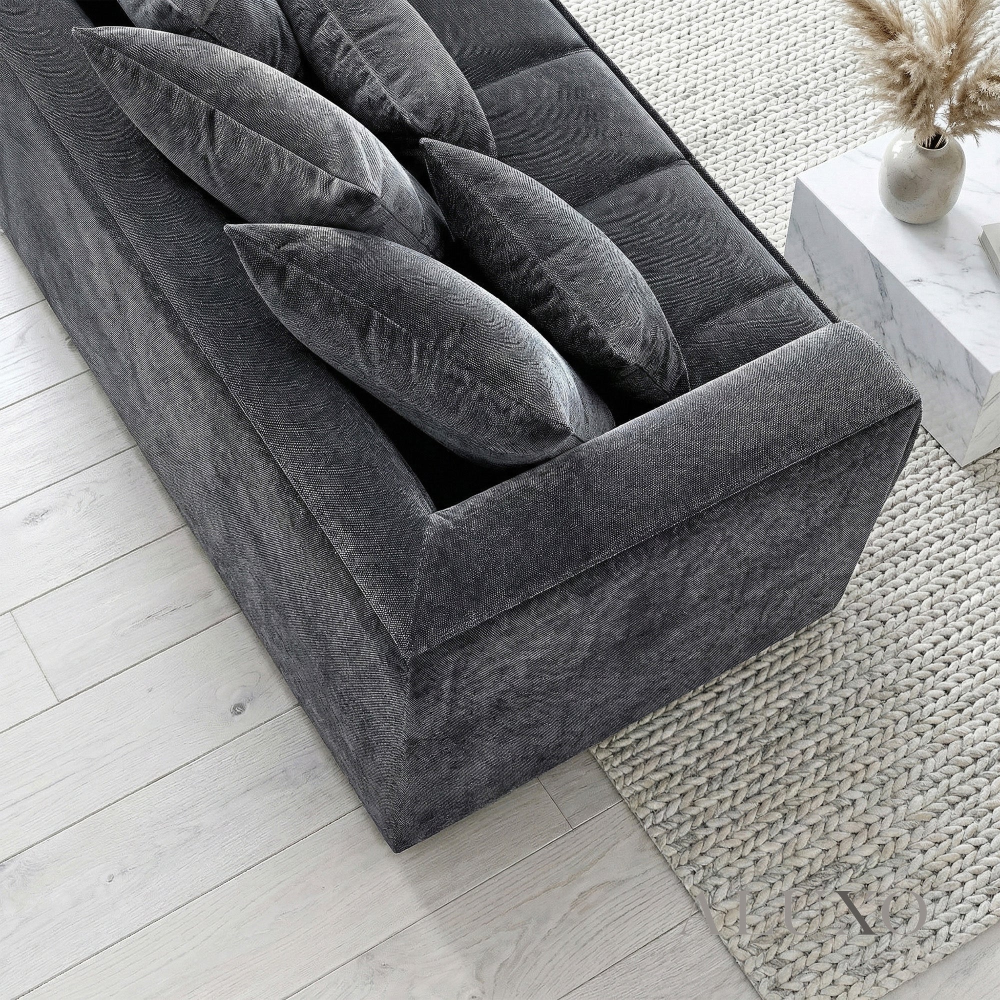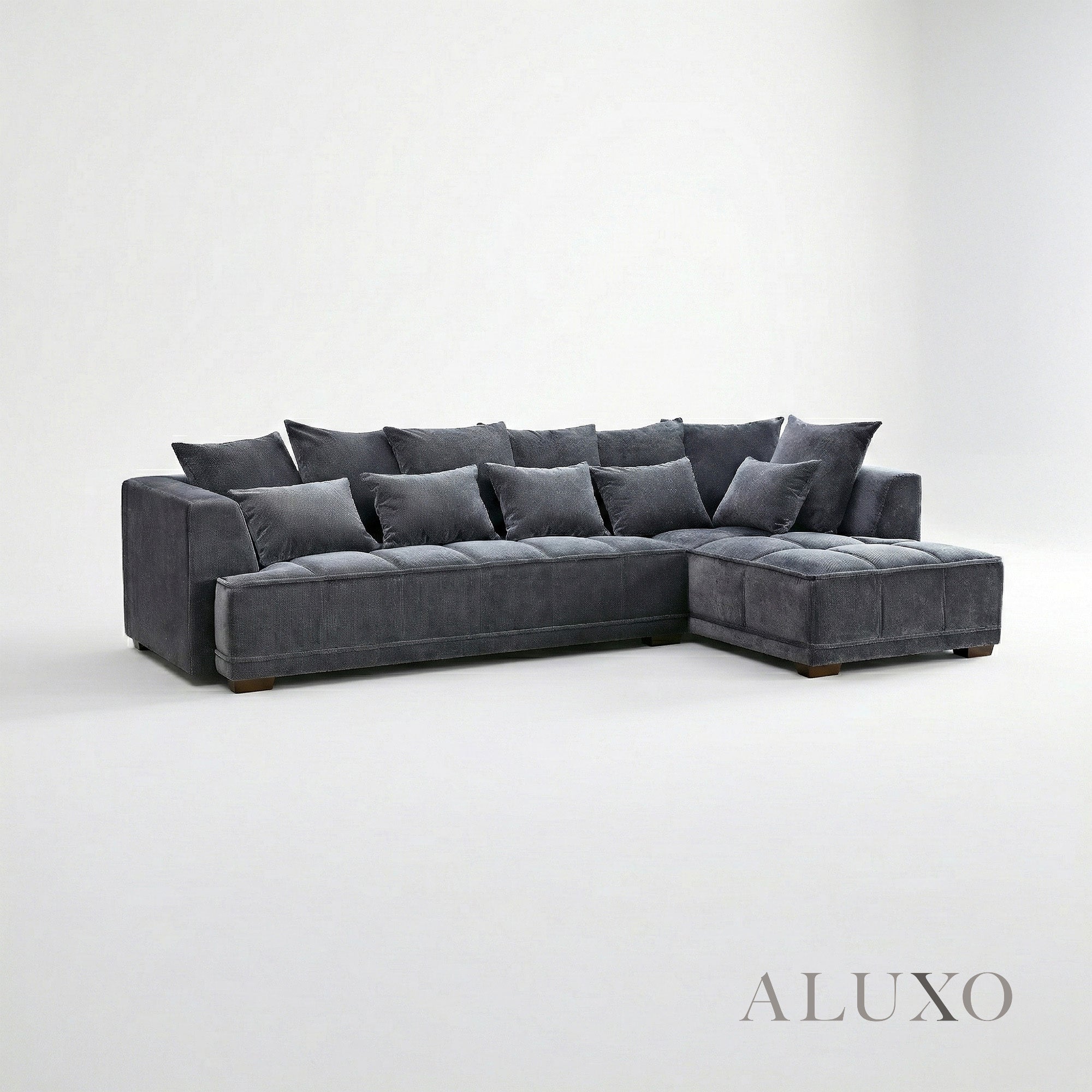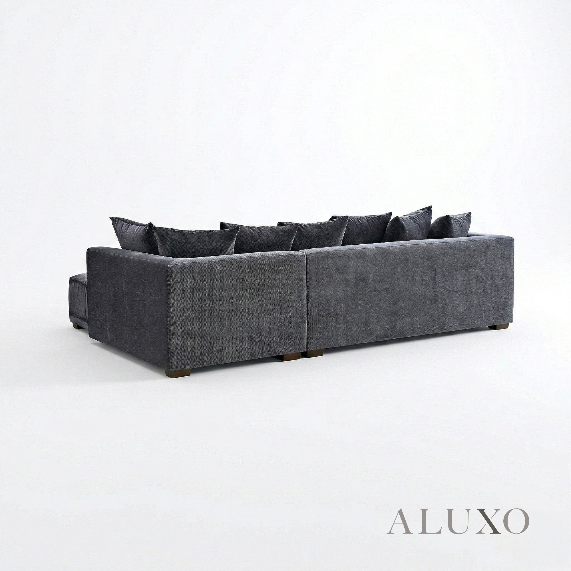 The ALUXO® Gramercy Corner Sofa in Steel Grey Velvet offers a bold, architectural silhouette softened by rich textures and shimmering depth. Crafted with block-stitched seat cushions and finished in a luxuriously reflective mermaid fabric, this Right-Hand Facing (RHF) design blends modern character with inviting comfort. Aluxo-Track Aluxo-TrackCopy