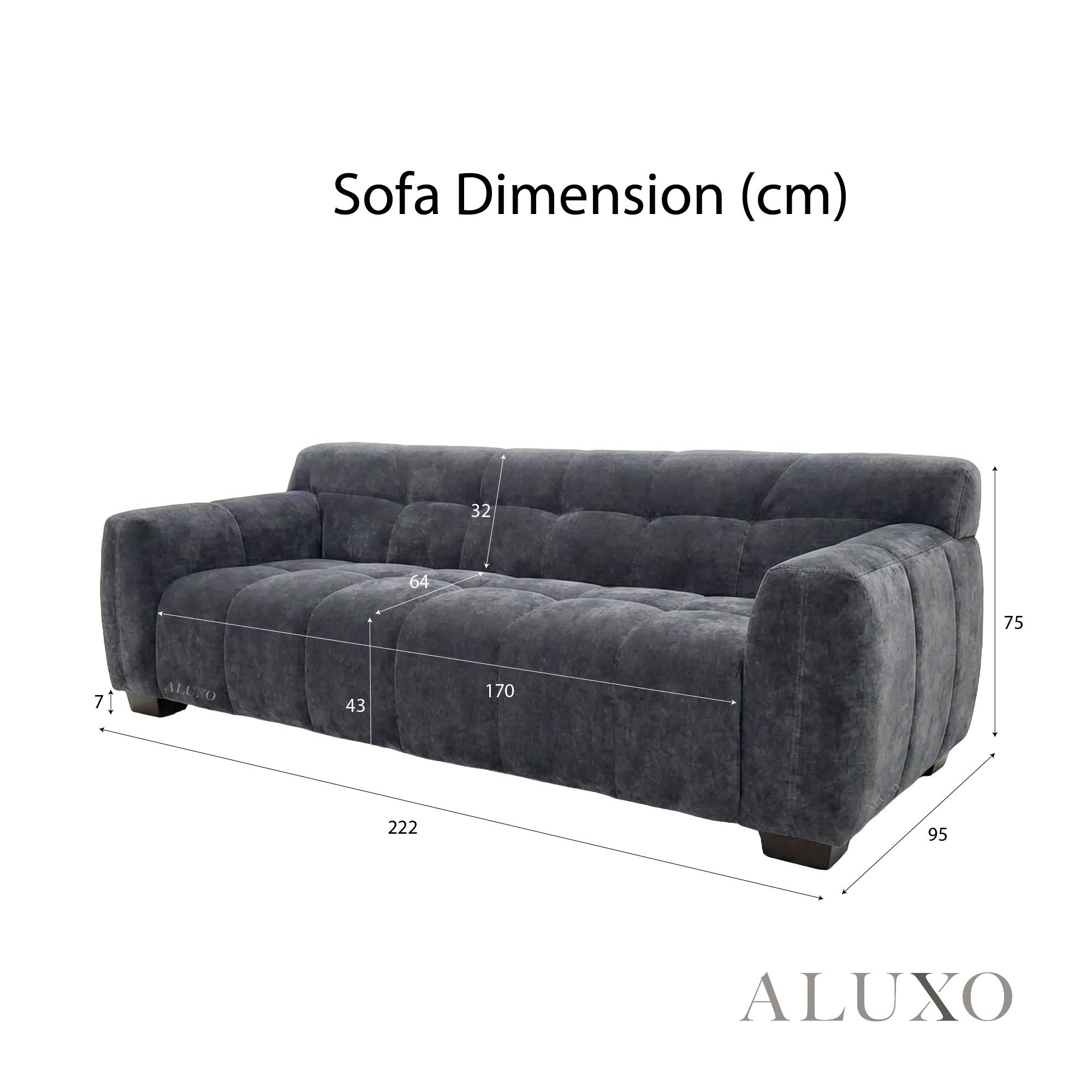 • 3 Seater: 222cm (L) x 95cm (D) x 75cm (H)