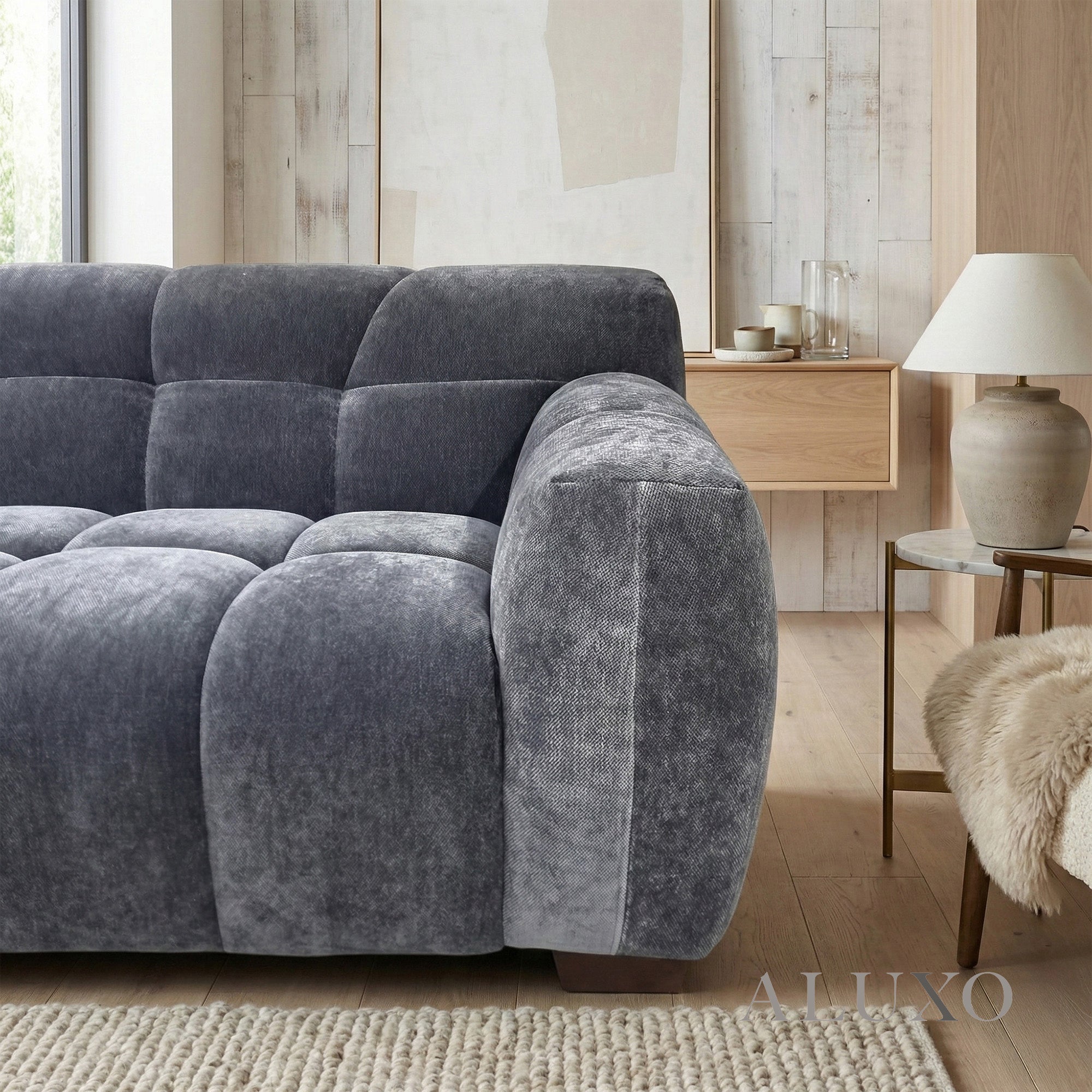 The ALUXO® Harlem Grand Furniture Set is the ultimate expression of dramatic elegance and coordinated design. This curated collection brings together the complete Harlem range in sophisticated Steel Grey Mermaid Velvet, featuring its iconic deep channel stitching and soft organic curves across every piece. The shimmering soft-touch fabric reflects light beautifully, creating a sophisticated atmosphere that anchors any modern living space. Aluxo-Track Aluxo-TrackCopy
