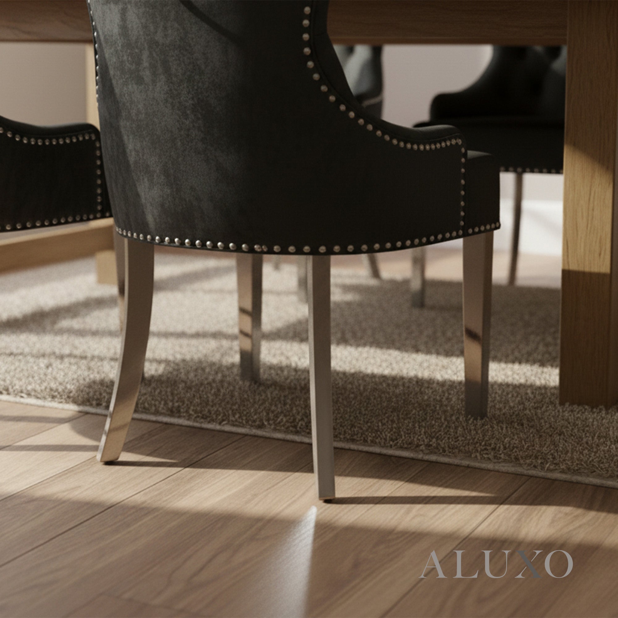 The ALUXO® Megan Ring Knocker Dining Chair combines modern elegance with timeless sophistication. Featuring a luxurious velvet finish, a polished chrome ring knocker, and refined studded detailing, this chair brings a touch of luxury to any dining space. Aluxo-Track Aluxo-TrackCopy