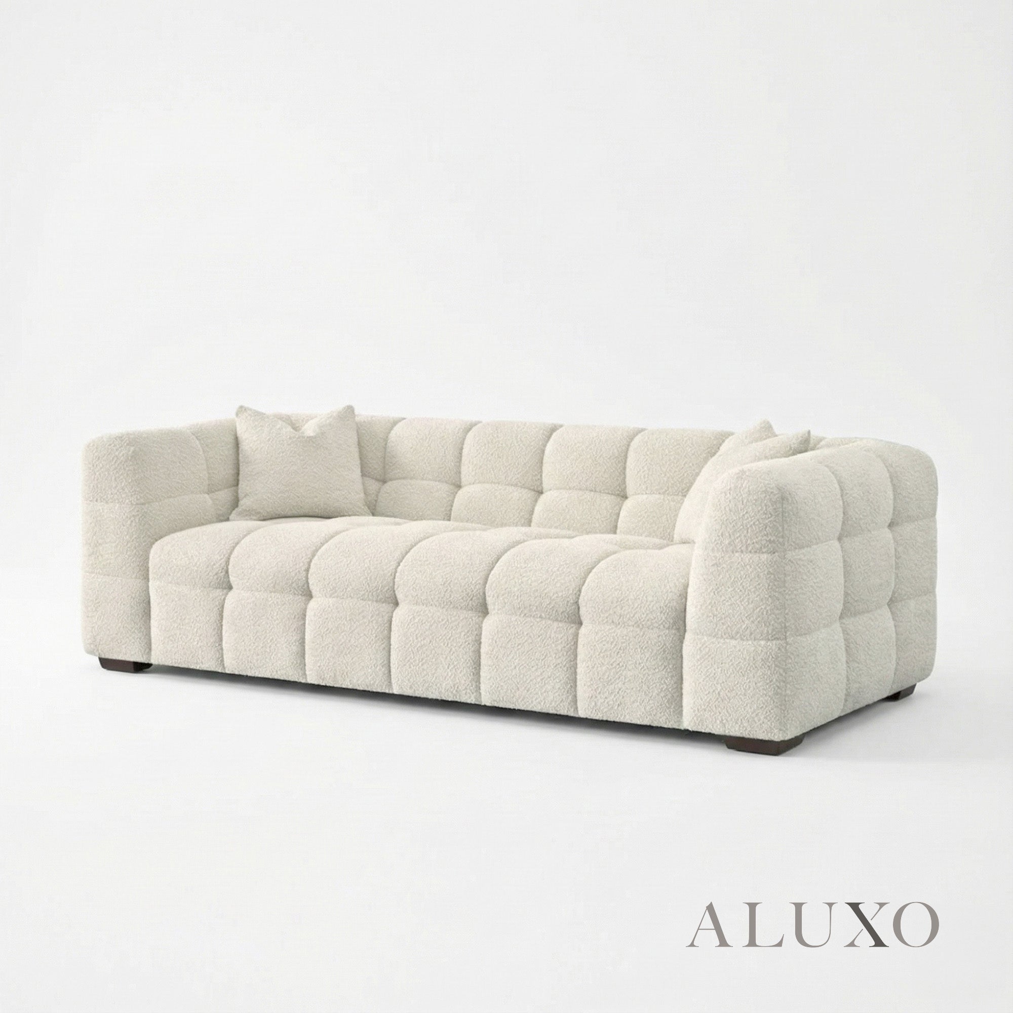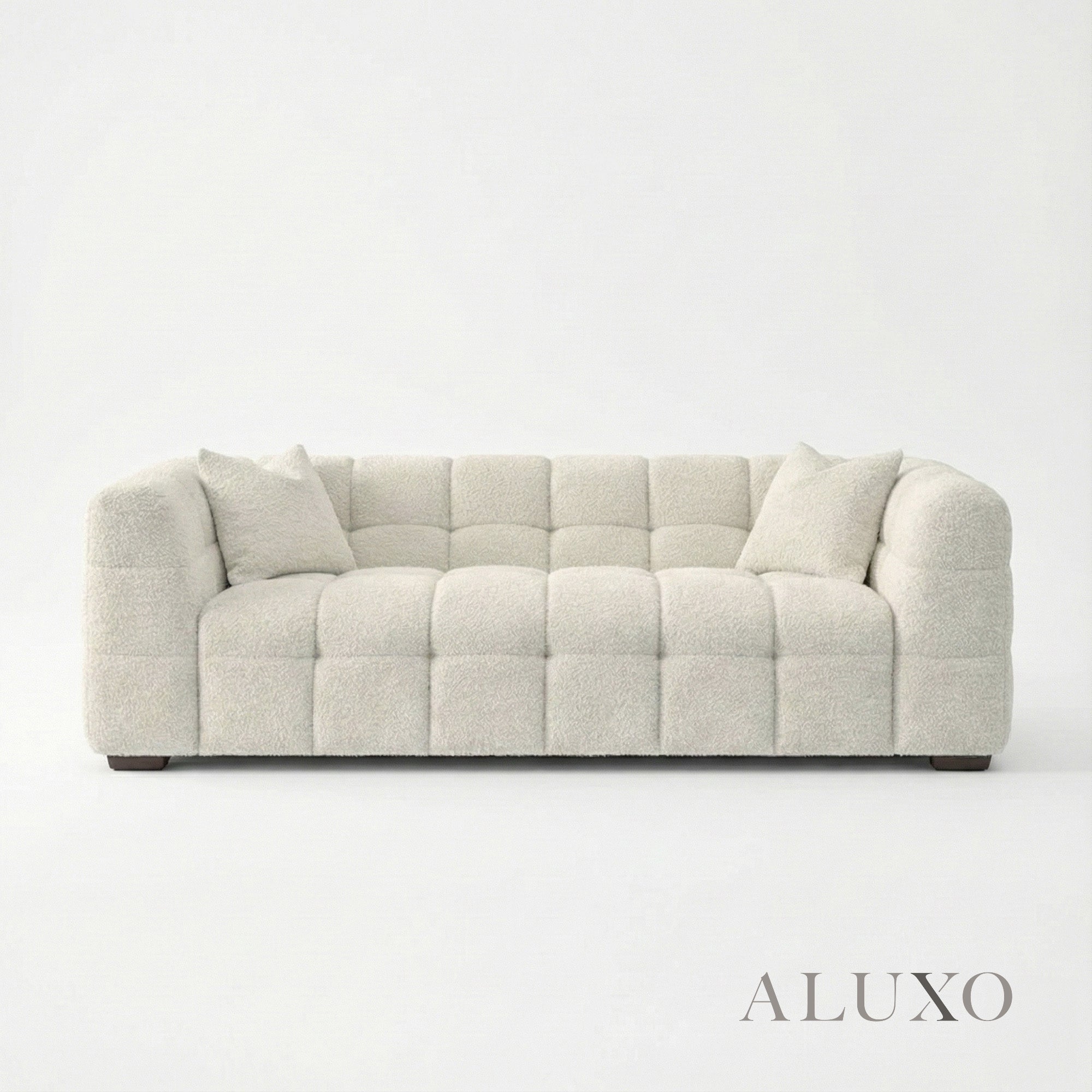 Create a space of subtle sophistication with the Tribeca 3-Seater Sofa. Wrapped in a tactile oatmeal-toned bouclé fabric, this piece merges gentle curves with sculptural form and deep channel stitching. Aluxo-Track Aluxo-TrackCopy Designed to offer both texture and refinement, it serves as an elegant focal point for the modern British home.