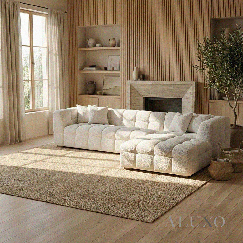 Designed as a striking centrepiece, the Tribeca Right Hand Corner Sofa introduces a refined sense of modern luxury to the home. Upholstered in soft oatmeal beige bouclé, its sculptural form and deep channel stitching echo a contemporary reinterpretation of classic Chesterfield elegance. Aluxo-Track Aluxo-TrackCopy