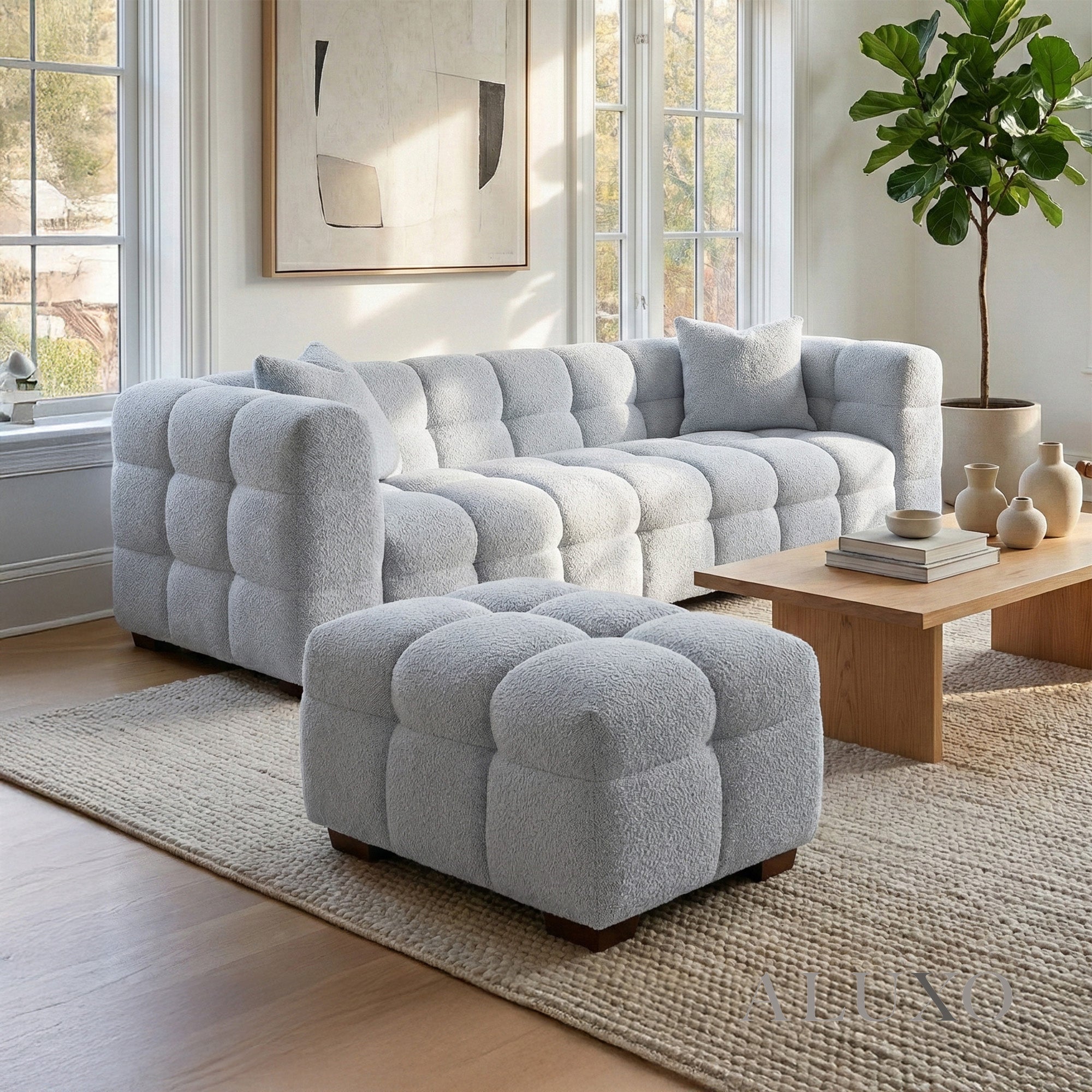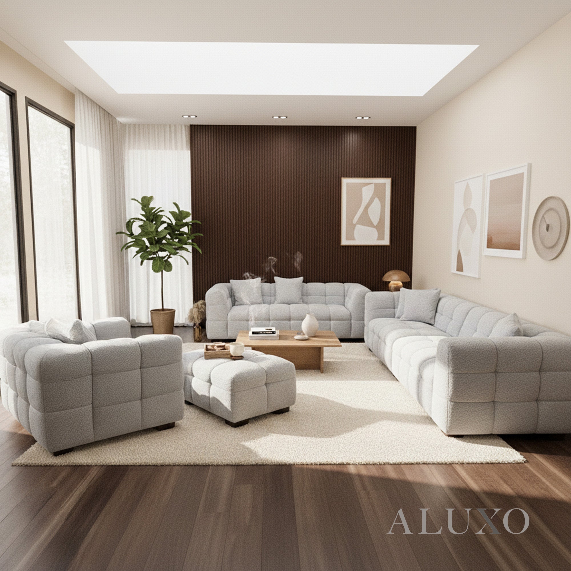 The perfect companion to the Tribeca collection, this Footstool adds both functionality and a refined finishing touch to your living space. Wrapped in high-calibre pearl-toned bouclé fabric, its clean lines and soft texture echo the sculptural elegance of the entire range. Aluxo-Track Aluxo-TrackCopy