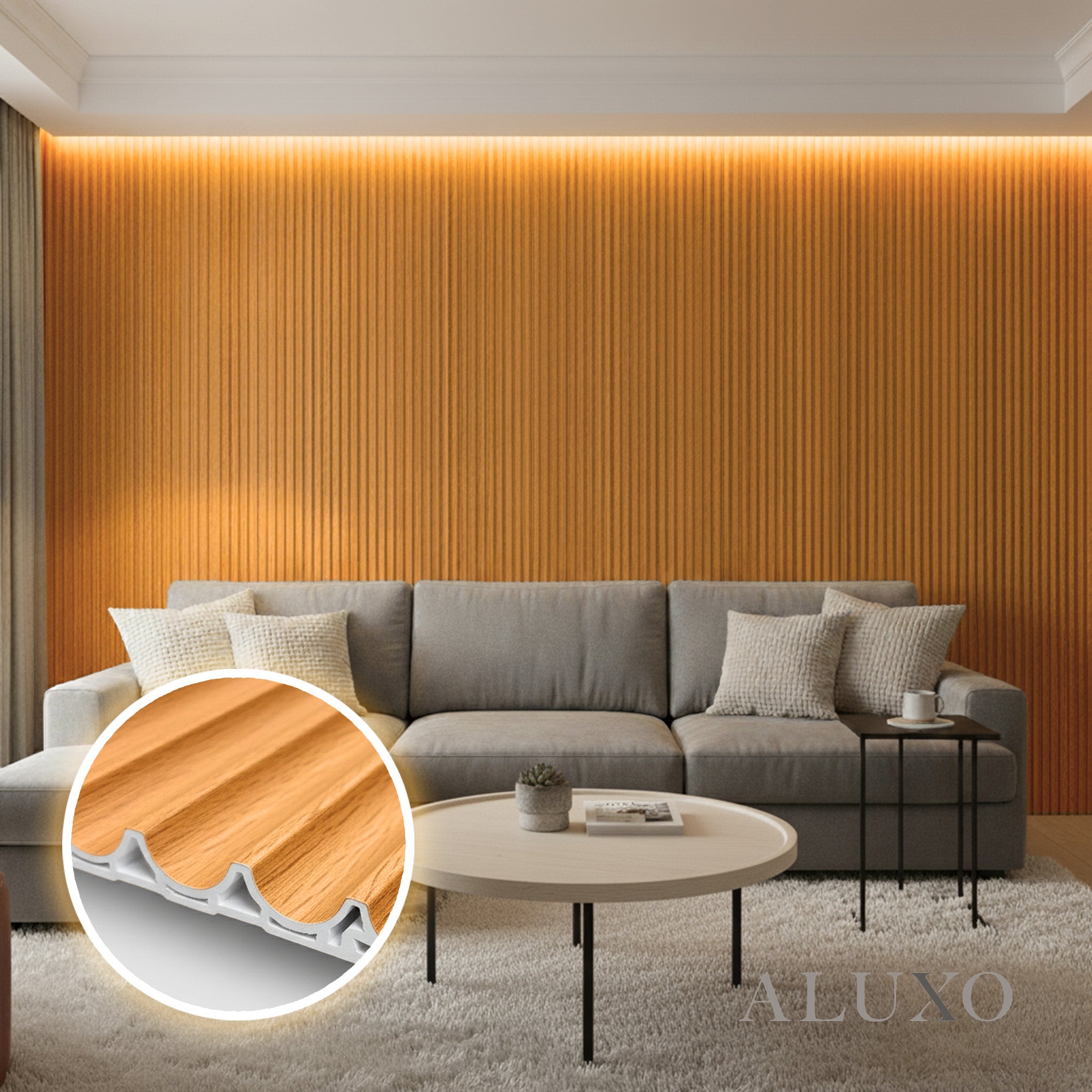 Aluxo-Wave-LightOakFeaturing a flowing concave wave design, these panels combine timeless wood warmth with contemporary elegance, enhancing walls with depth, texture, and dynamic light effects. Perfectly complements our Flat Style Wood Effect Wall Panels and End Trims.