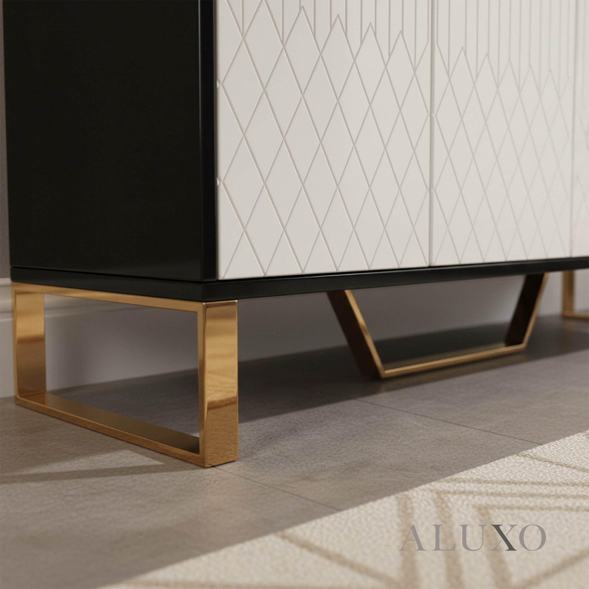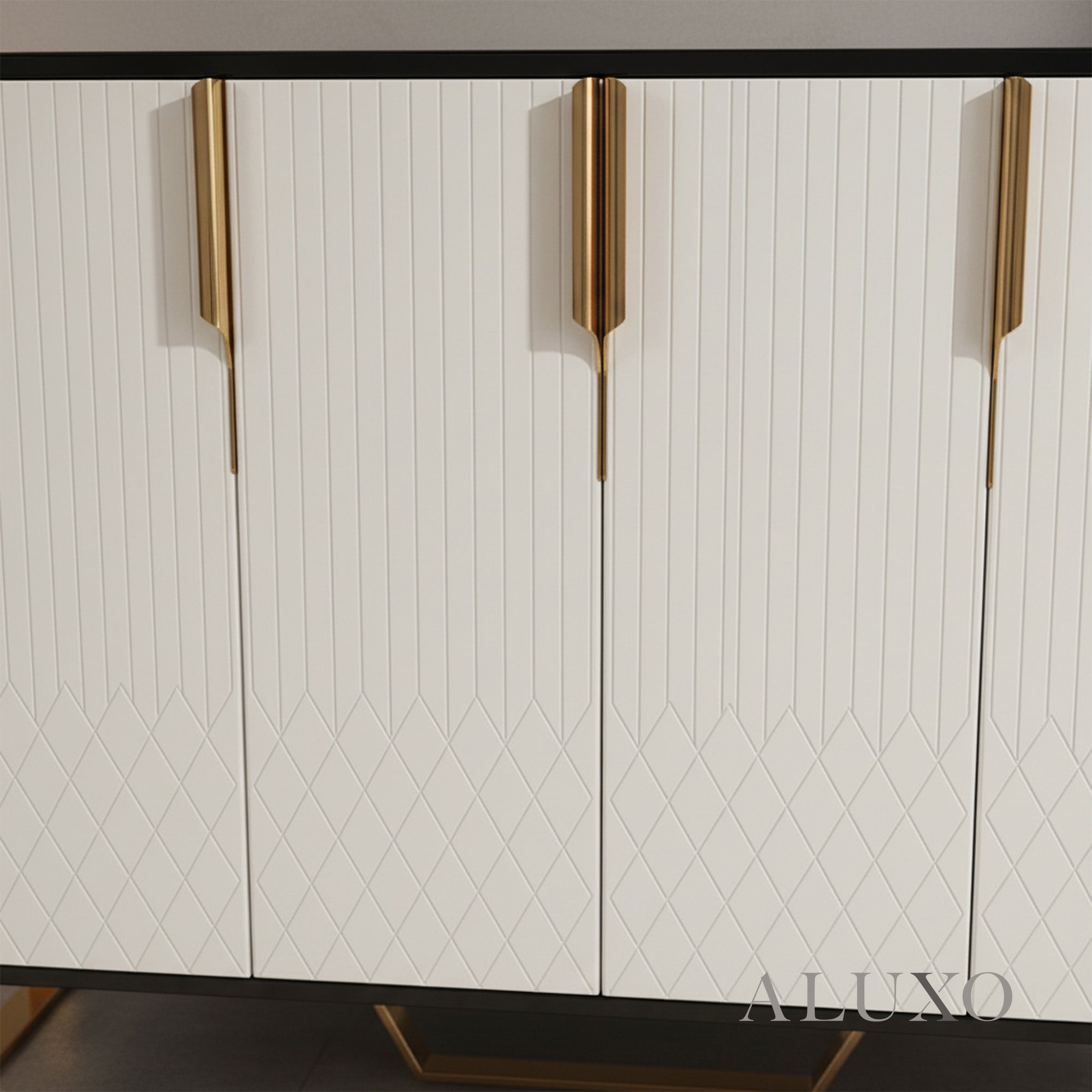 Crafted with painted MDF ribbed panels, a 6mm black tempered glass top, and gold accent handles and legs, this premium sideboard is perfect for modern interiors seeking elegance and practicality. Aluxo-Key:LuxuryBlackGlassSideboard