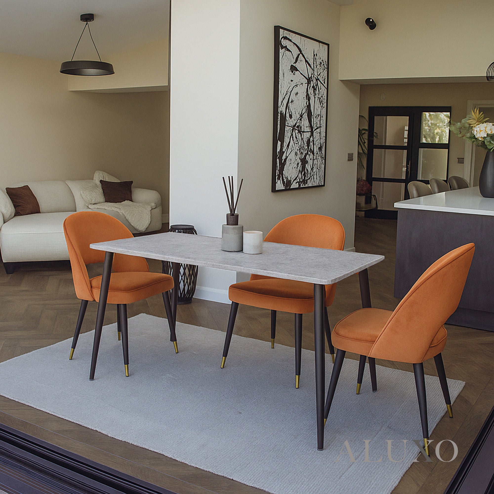 Experience Scandinavian elegance with the Anders 1.4m Dining Set, featuring a sleek 10mm grey sintered stone tabletop, minimalist black tapered legs, and luxurious Bjorn velvet chairs. Compact yet stylish, this set is perfect for modern couples and small family dining spaces.Aluxo-Track