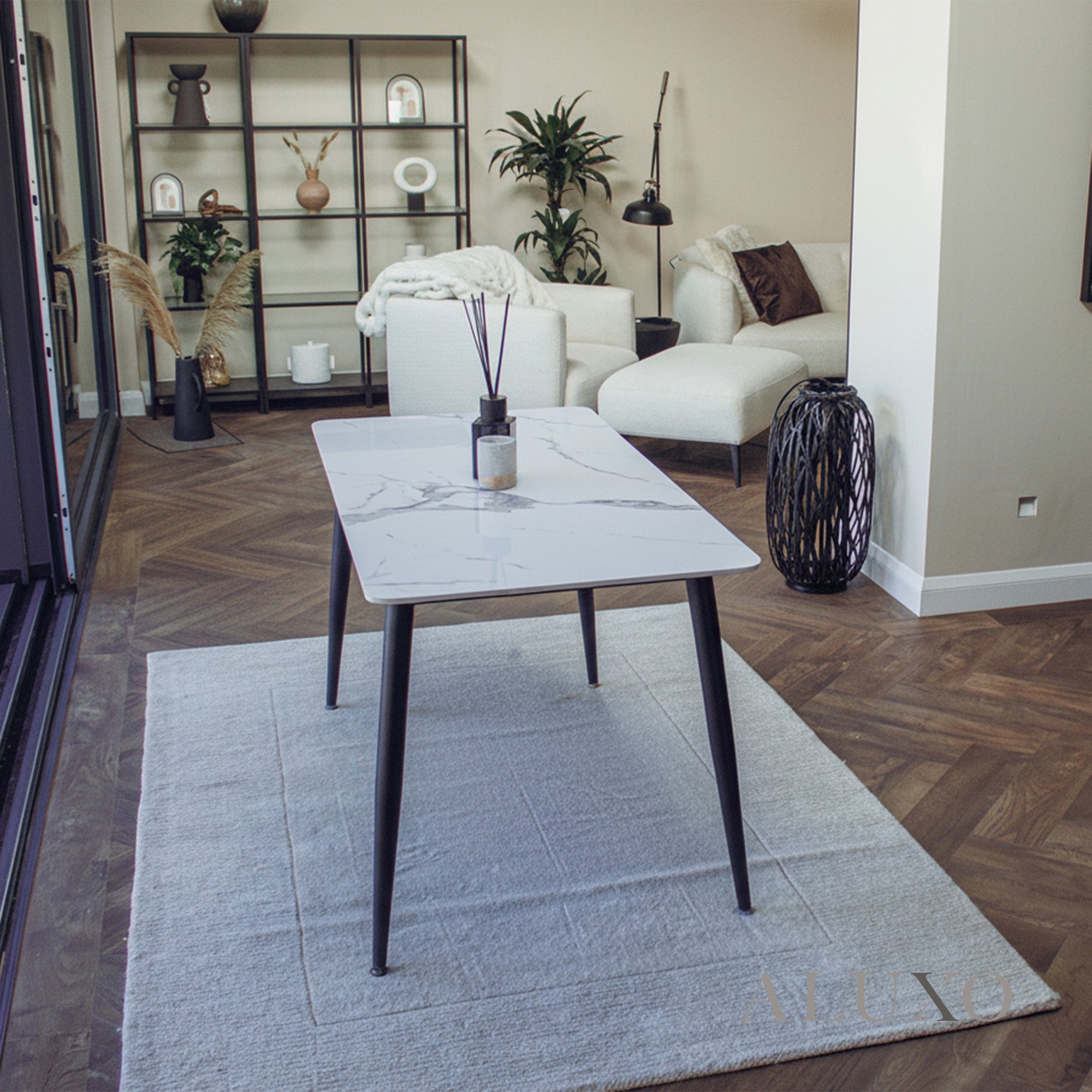 Compact and minimalist, the Anders Dining Table features a durable 10mm white sintered stone top and sleek black metal legs—a Scandi-inspired piece perfect for modern apartments and small dining areas.