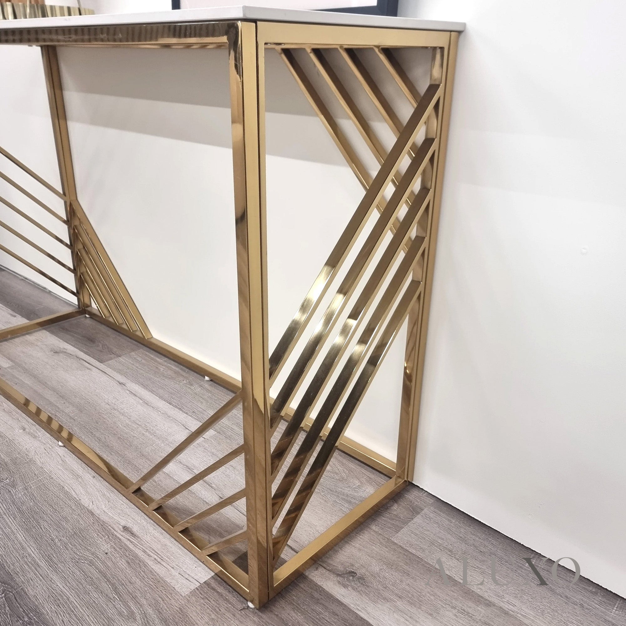 The Asuka Gold Console Table combines a polar white sintered stone top with an elegant polished gold base, offering a minimalist silhouette with luxurious appeal. Its slimline profile and modern aesthetics make it a perfect fit for hallways, living rooms, and dining spaces.Aluxo-Track:AS1201