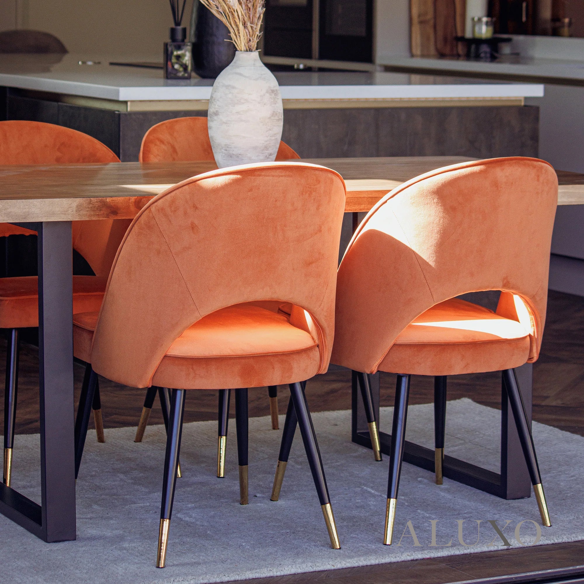 Designed for comfort and style, the Bjorn Rust Orange Velvet Dining Chair features plush velvet upholstery and sleek Scandinavian-inspired legs with elegant gold tipsAluxo-Track Aluxo-TrackCopy. Its modern silhouette adds warmth and sophistication to any dining space.