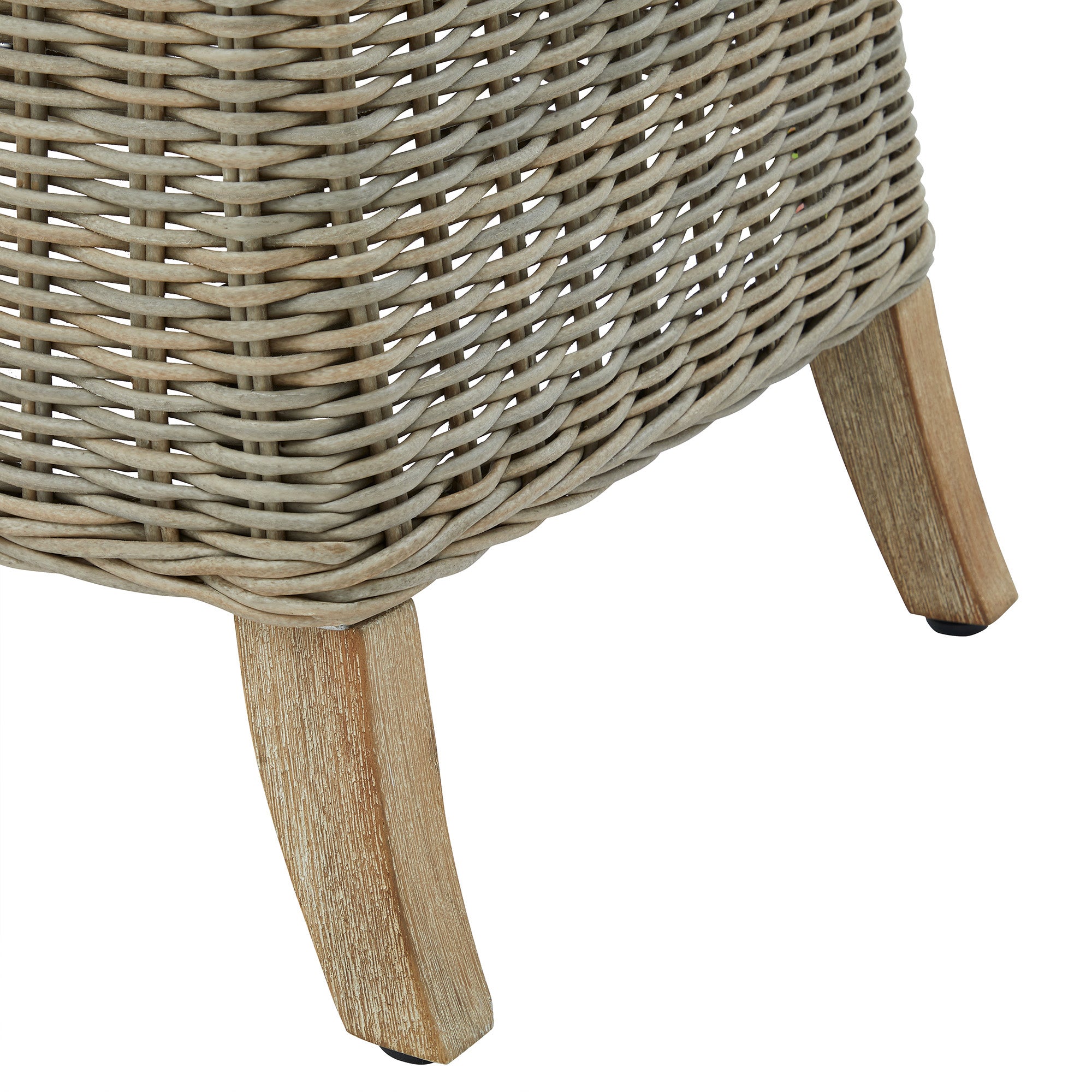 The chair is crafted from a 5mm half-round HDPE wicker, woven over a rust-resistant powder-coated aluminium frame for lightweight strength. It stands on solid acacia wood feet, sustainably sourced and sealed for long-term outdoor use.
