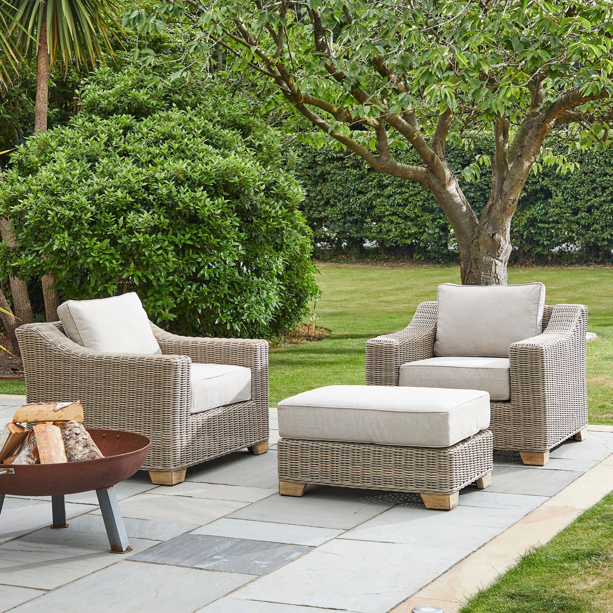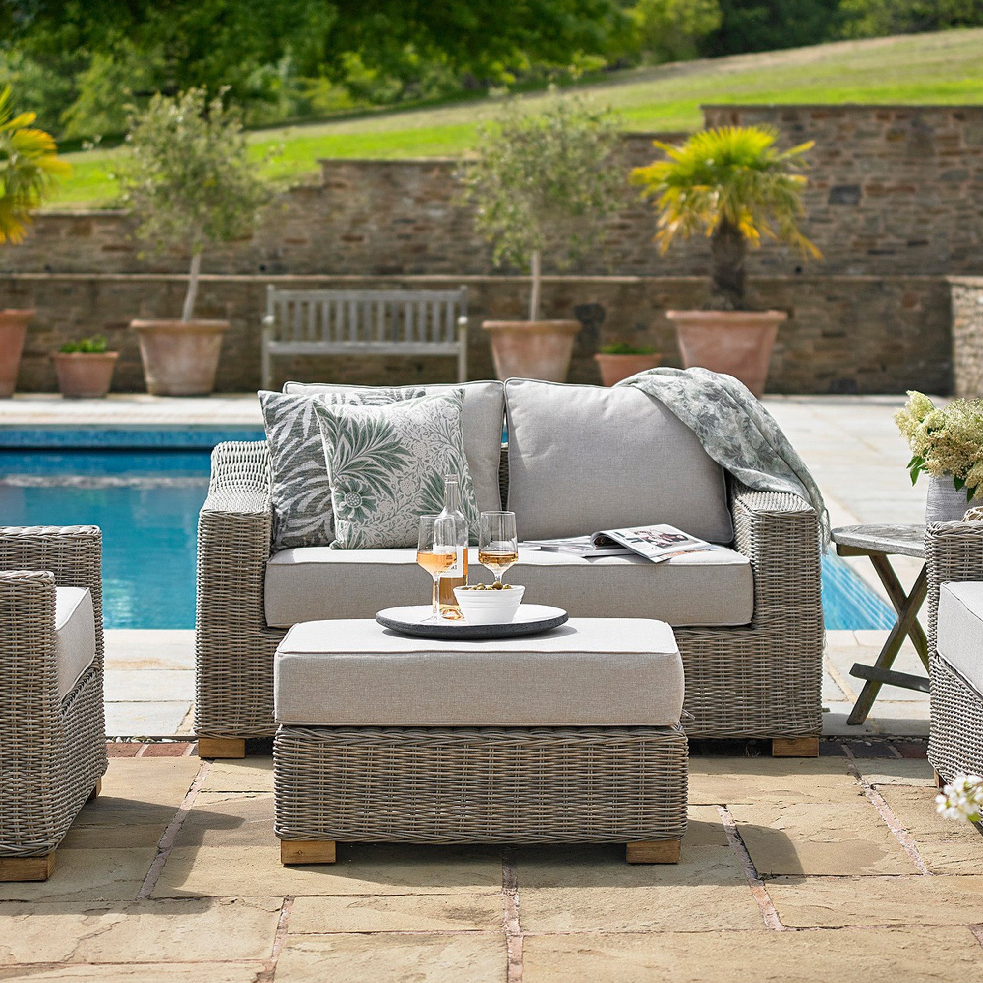 Pair with a matching outdoor armchair for laid-back lounging. Enhance evening atmosphere with oversized wicker lanterns, wax-effect LED candles, and mirrored wall décor to reflect light and amplify your outdoor sanctuary.