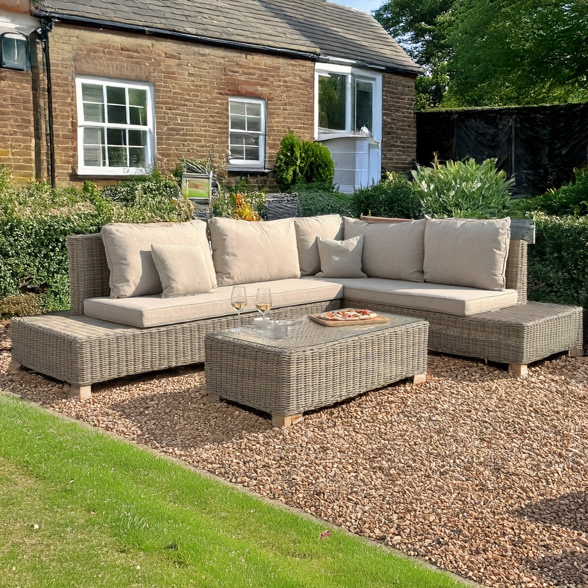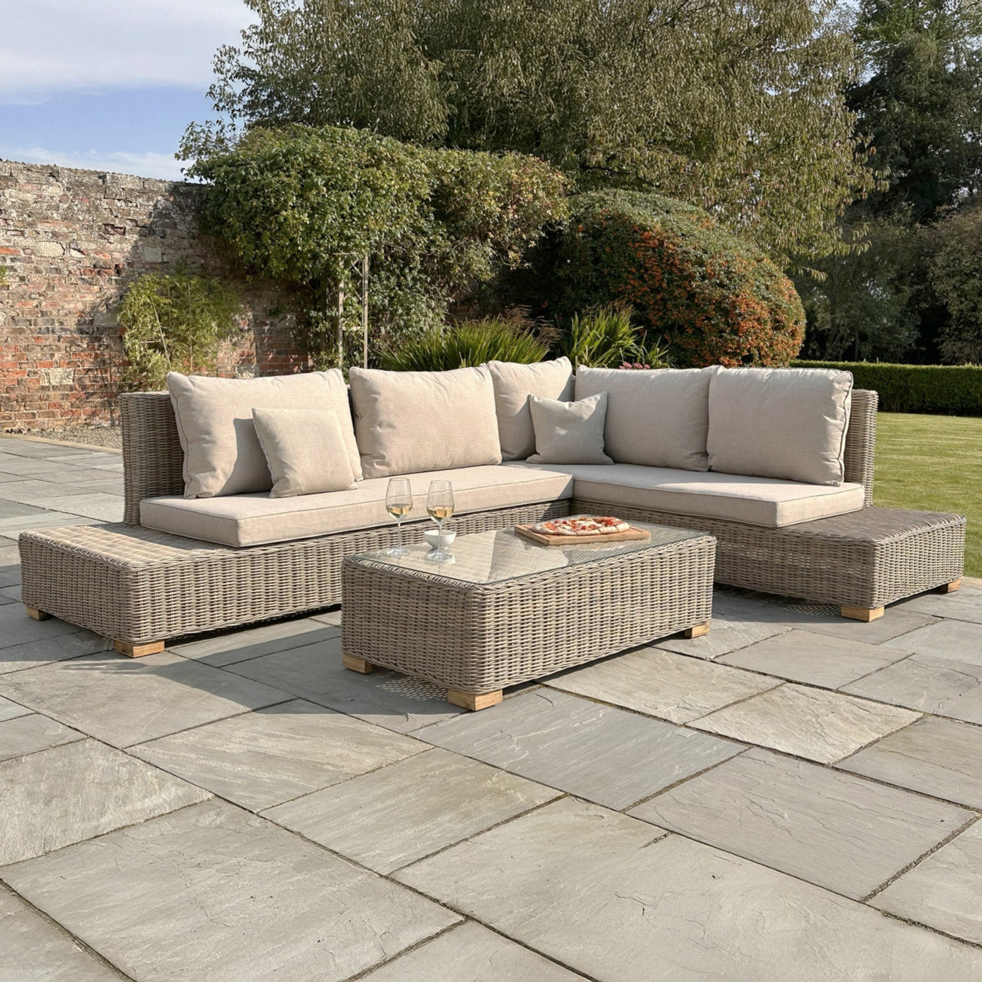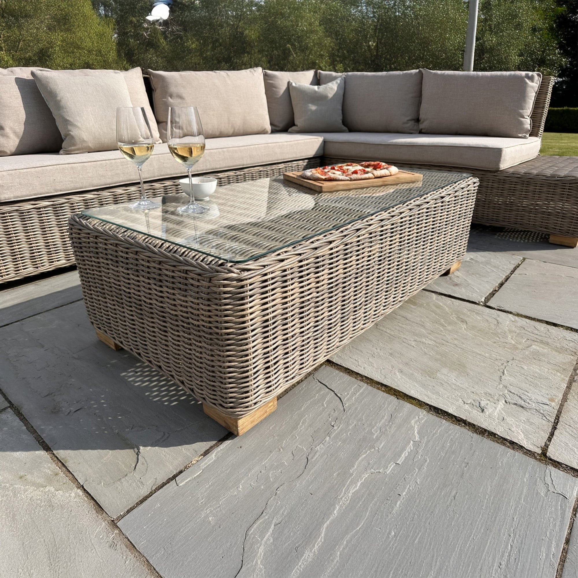 Experience the perfect harmony of form and function with the Capri Collection Outdoor Large Corner and Coffee Table Set. Showcasing a refined 5mm half-round HDPE wicker weave in a versatile beige tone, this contemporary set brings elegance and resilience to any outdoor setting.