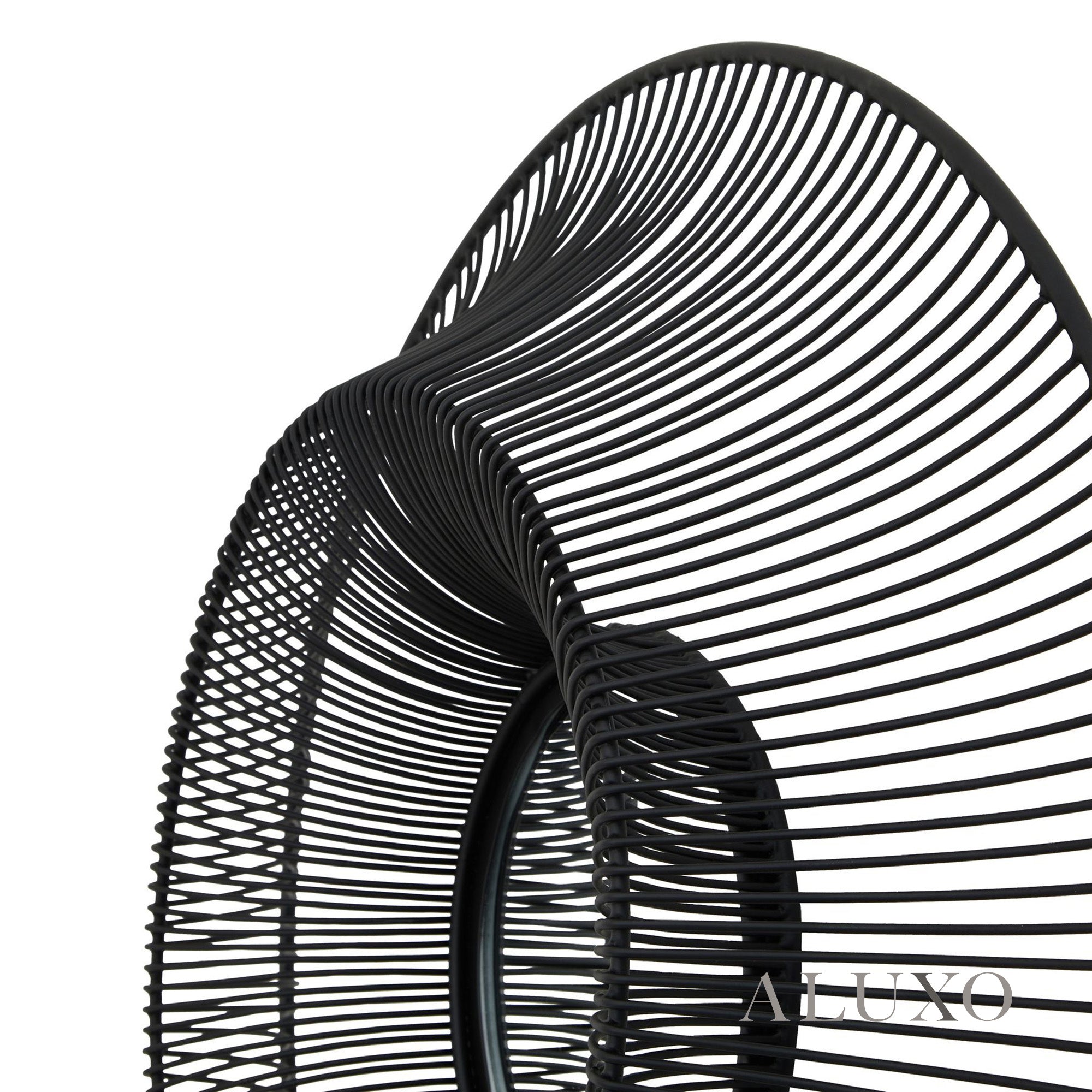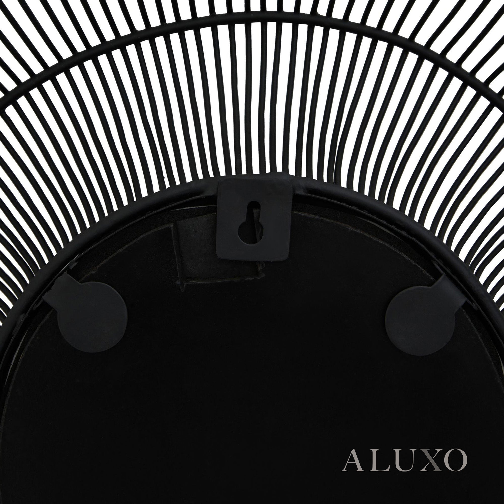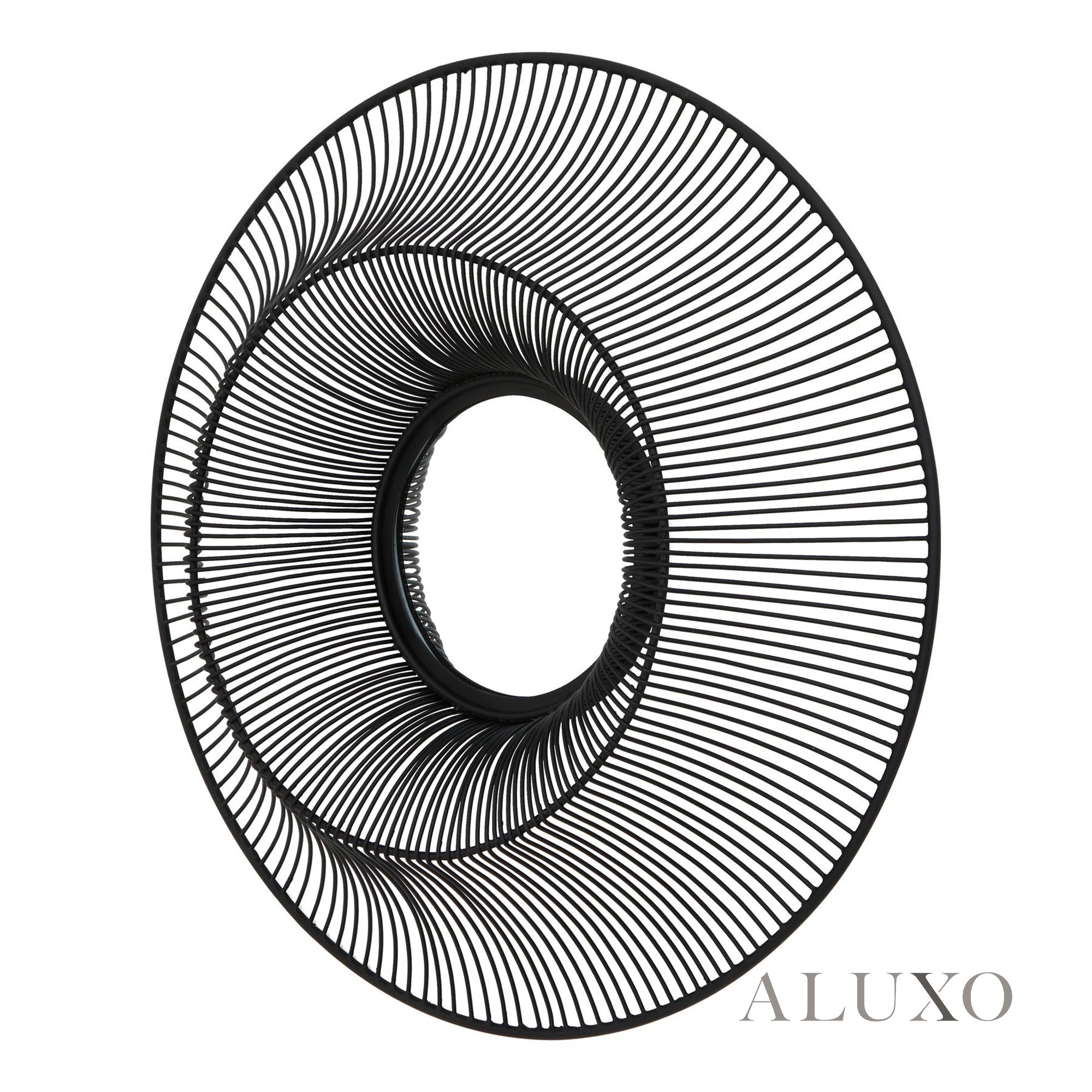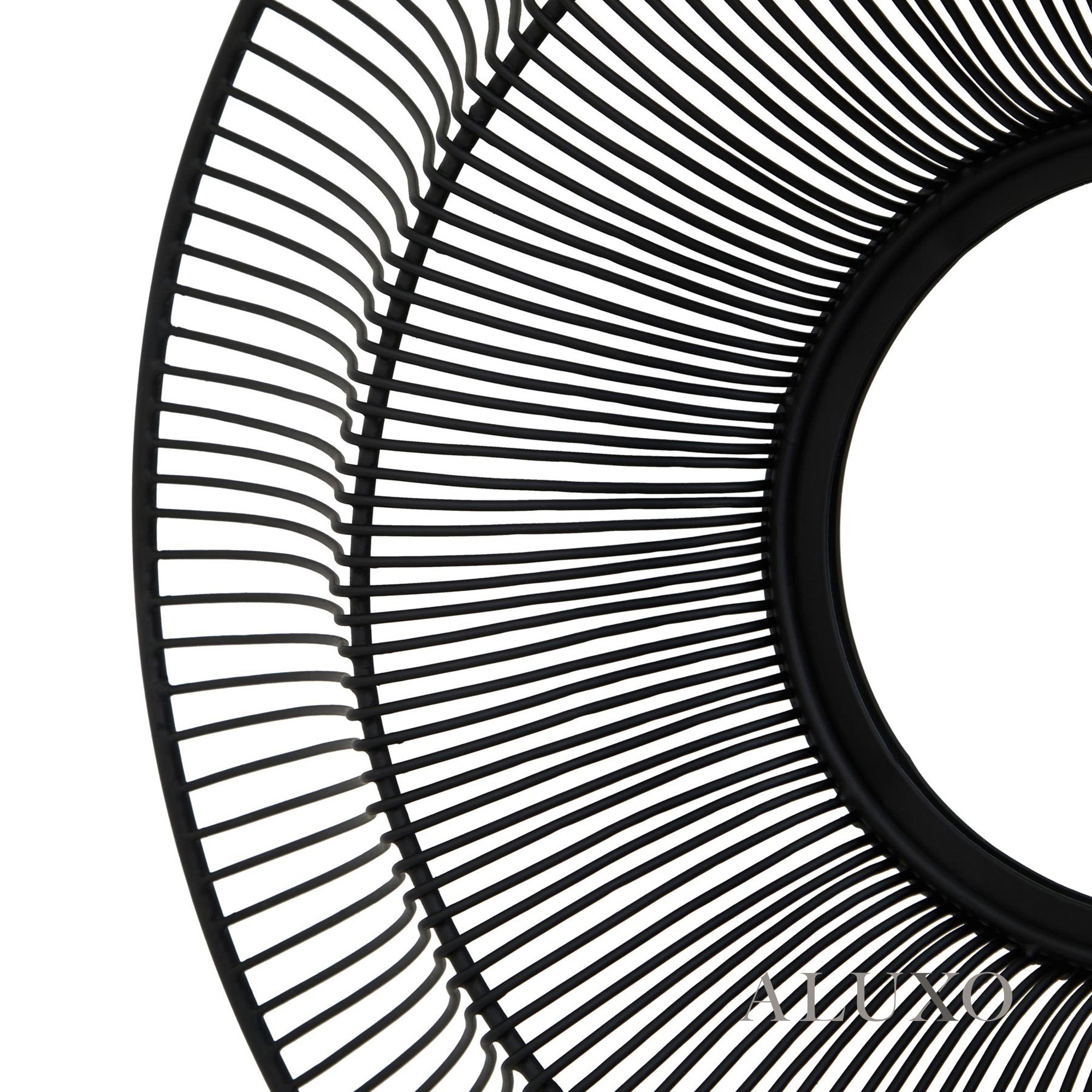 This unique wall feature is composed of dozens of delicate black wire spokes that twist and overlap into a mesmerizing wave pattern. The frame sits at a significant 10cm depth, creating a dimensional shadow play on the wall as natural light shifts throughout the day. The central mirror glass provides a crisp reflection, perfectly balanced against the textured complexity of the surrounding framework. Aluxo-Key Aluxo-KeyCopy