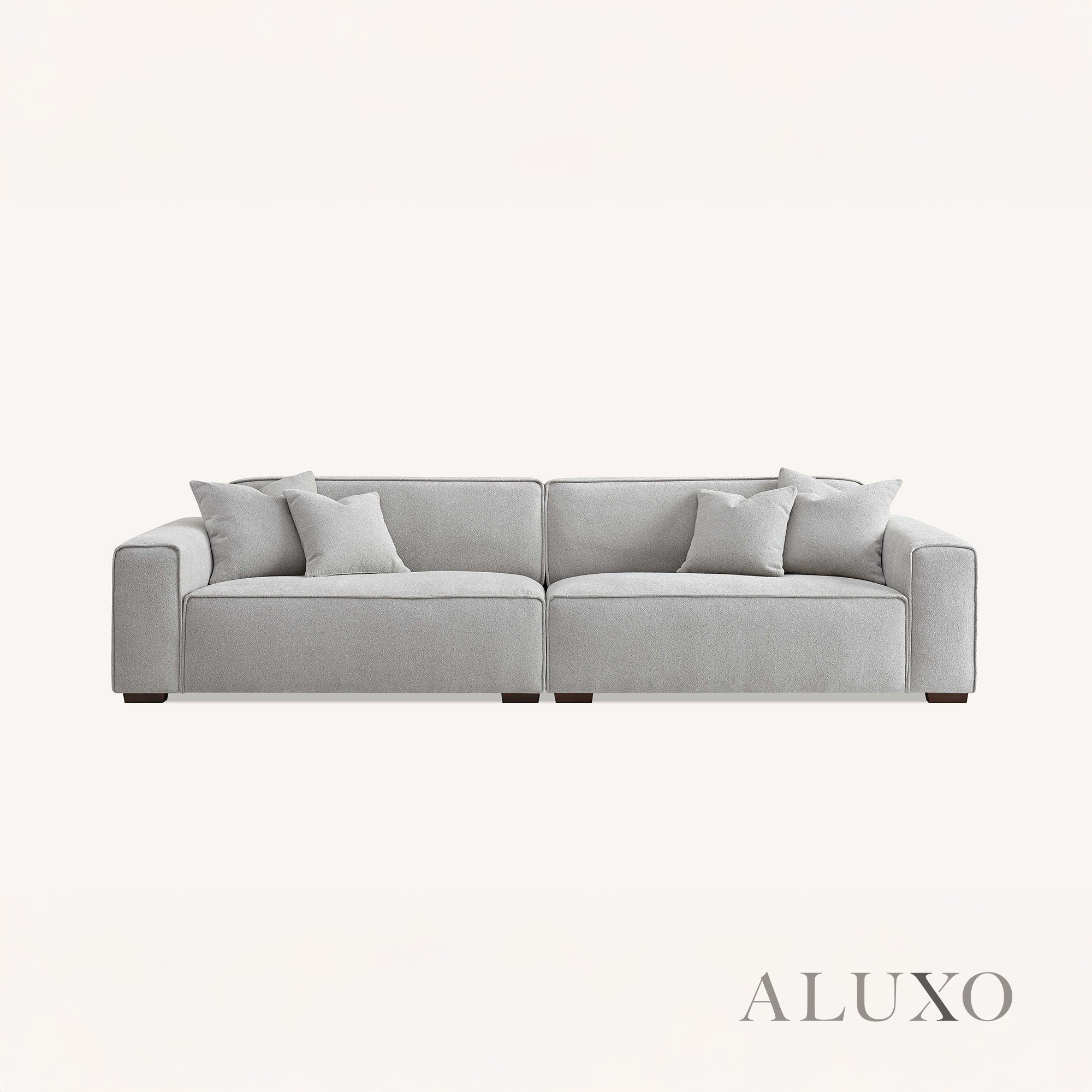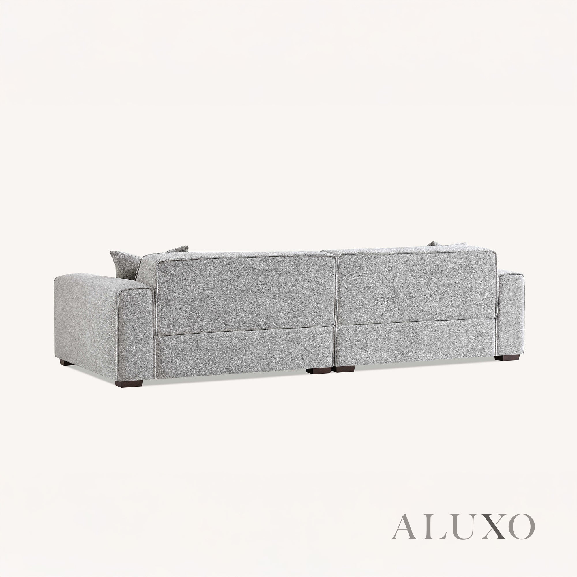 The Dakota 4-Seater Sofa with Footstool in Pebble Grey Bouclé offers a calming neutral palette with sculptural appeal. Wrapped in soft grey bouclé and generously padded with feather-filled arms, seats, and a fixed back, this sofa invites daily indulgence. Aluxo-Track Aluxo-TrackCopy