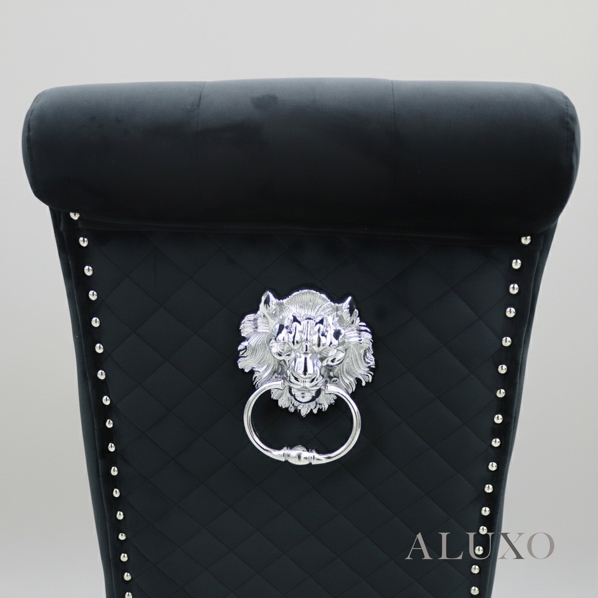 The Einar Dining Chair exudes class and sophistication, with its luxurious soft velvet finish. A striking chrome lion knocker adorns the quilted stitched back, making Einar a centrepiece for elegant dining spacesAluxo-Track Aluxo-TrackCopy.