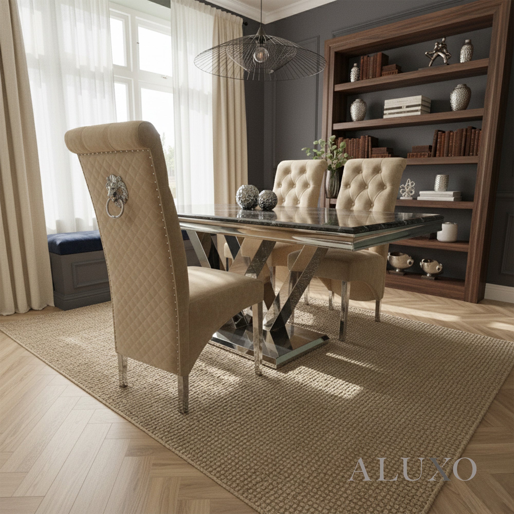 The Einar Dining Chair in cream plush velvet radiates elegance and sophistication. Its luxurious finish is complemented by a stunning chrome lion knocker on a quilted stitched back, making it a refined addition to any dining spaceAluxo-Track Aluxo-TrackCopy.