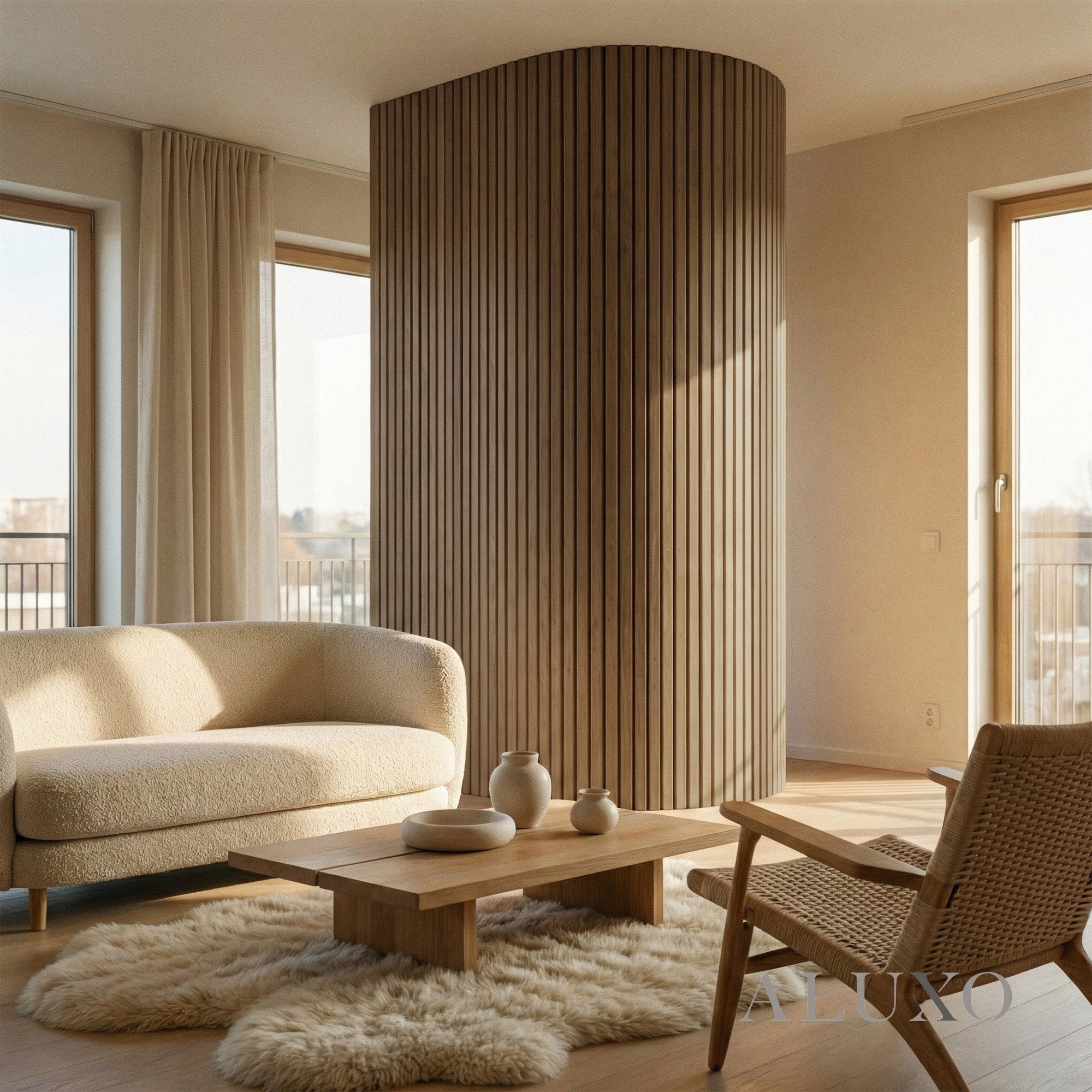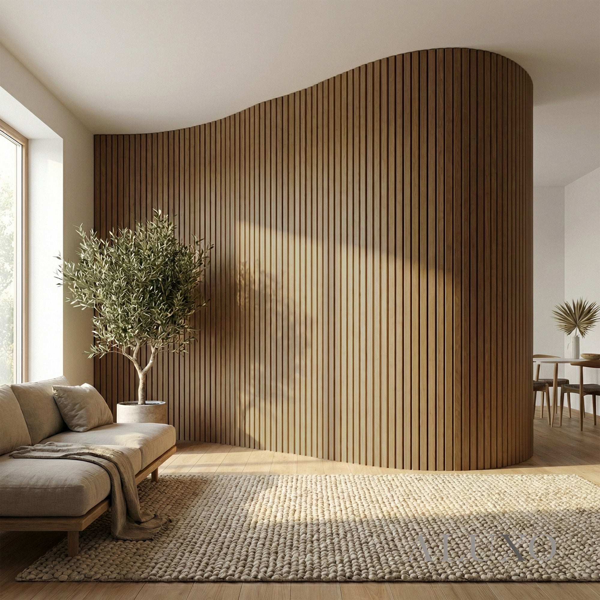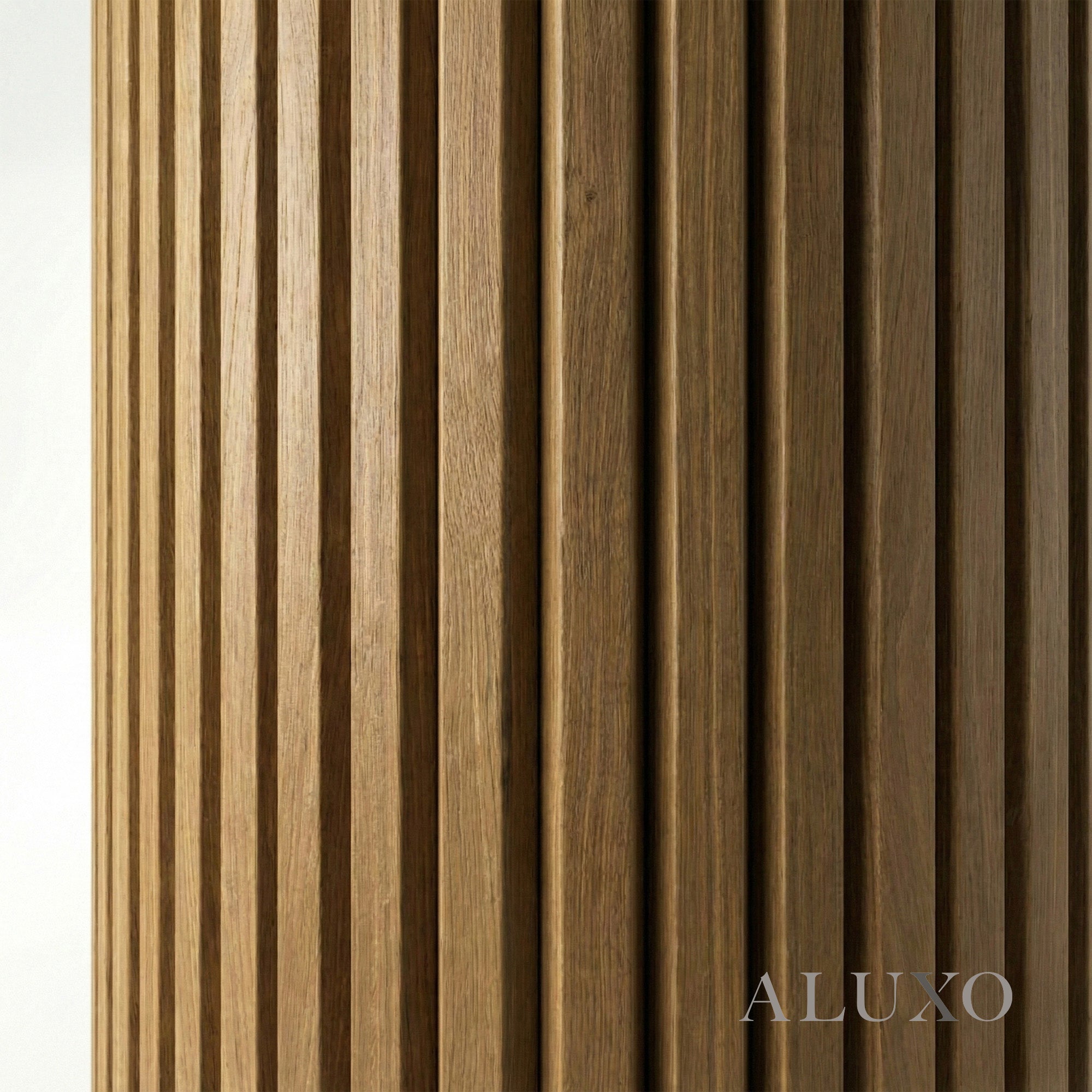 As the original flexible wall panel system, this collection is purpose-built for architectural versatility. Each panel features a high-performance flexible backing, allowing the deep walnut slats to wrap around curved walls and bespoke features with a seamless, continuous flow across walls and ceilings. Aluxo-Key Aluxo-KeyCopy