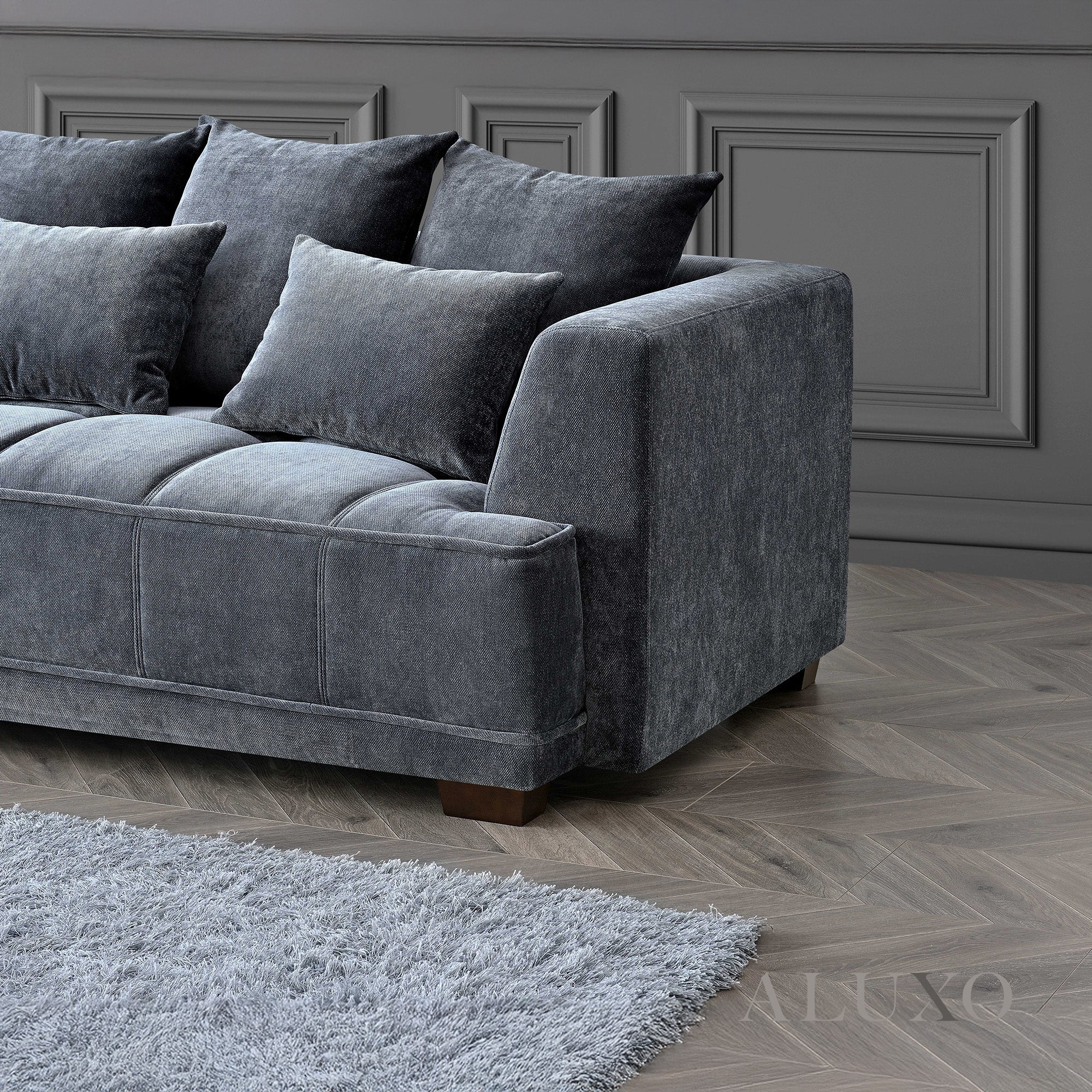 The Gramercy sofa has been crafted with block stitched seat cushions and upholstered in a gorgeous steel grey mermaid fabric which delicately reflects and plays with light, making the sofa not only an eye-catching feature to any home, but a lavishly comfortable place to sit back and relax.Aluxo-Track Aluxo-TrackCopy