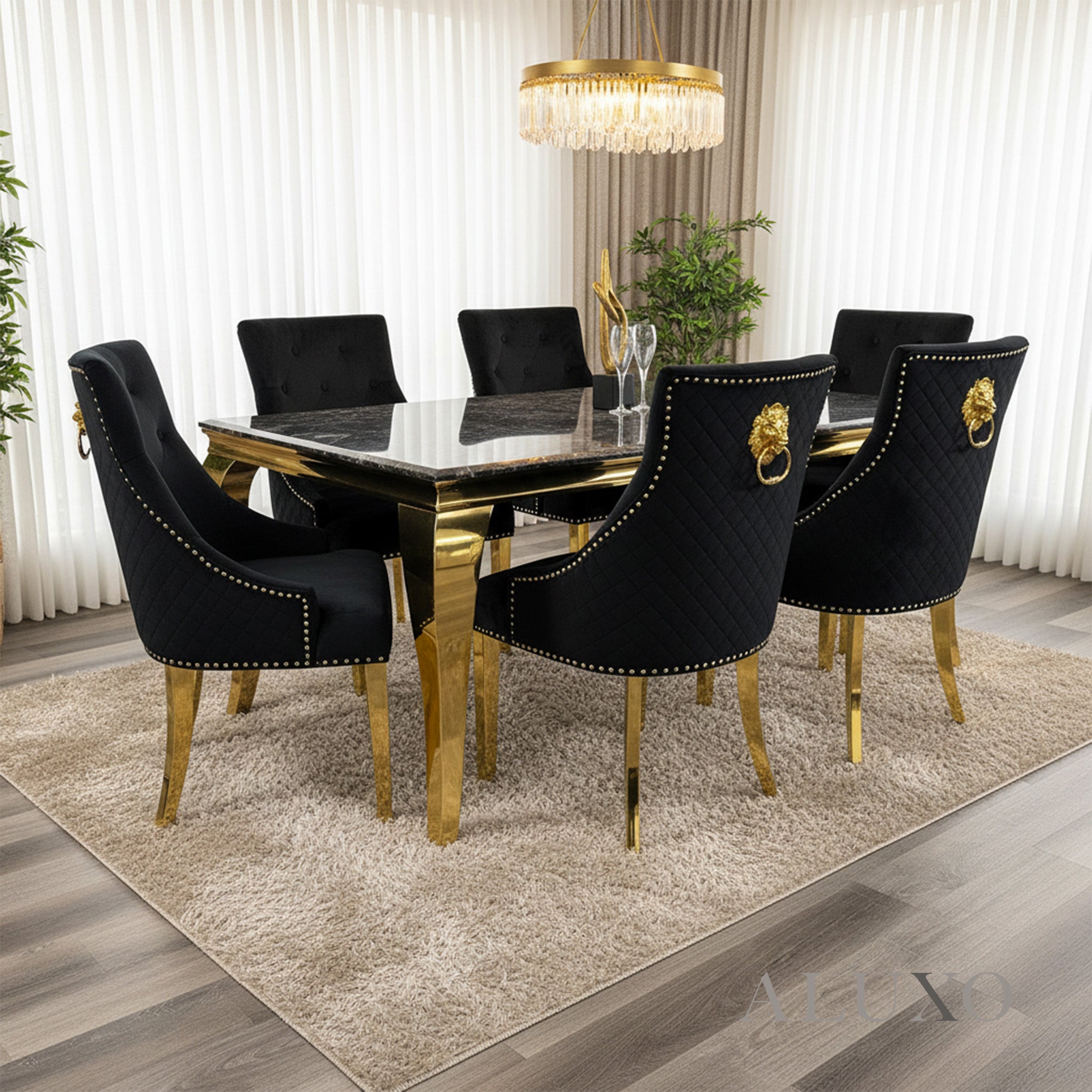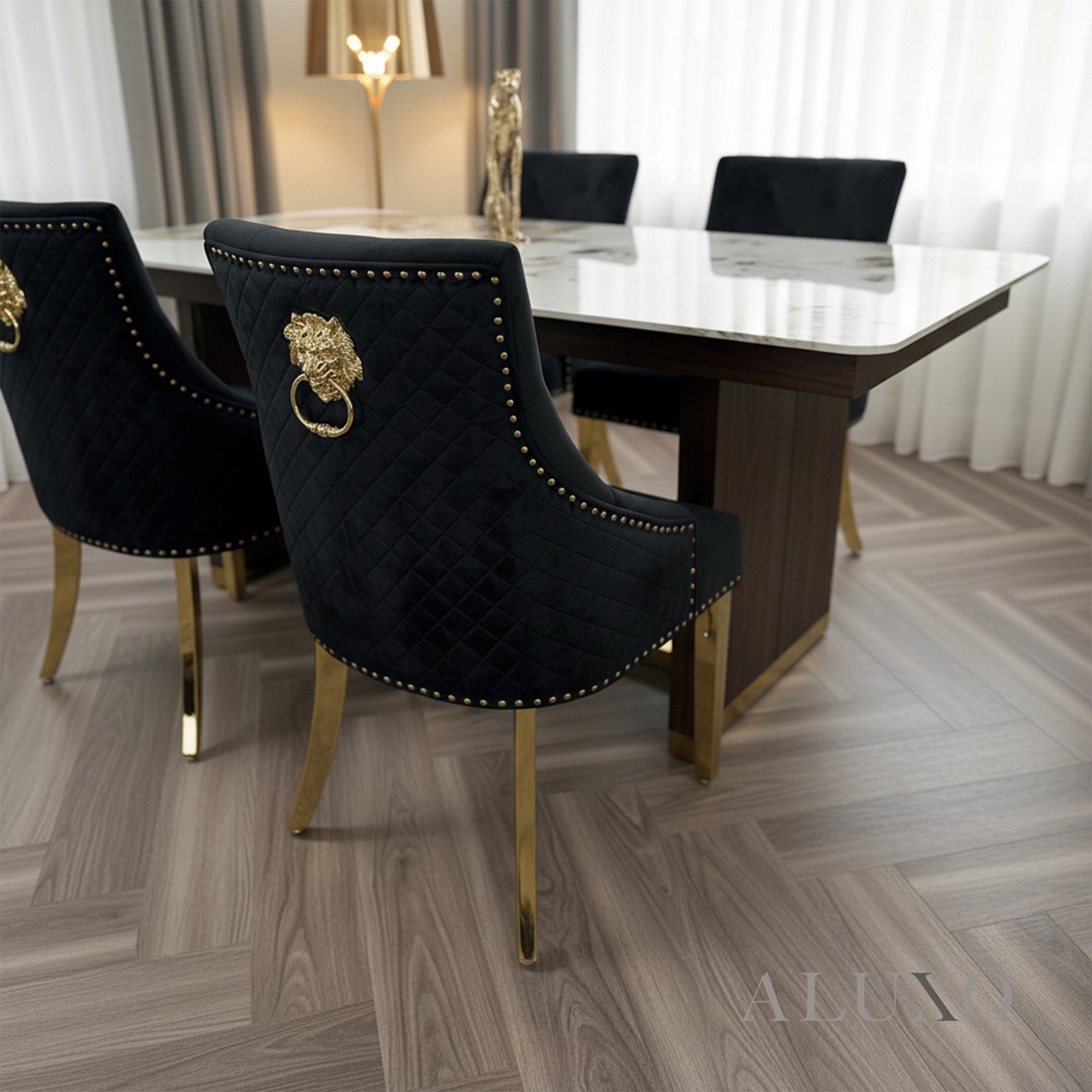 The Henrik Gold Dining Chair brings a perfect blend of elegance, comfort, and sophistication. Featuring a luxurious black velvet finish, a polished gold detailed lion knocker, and quilted stitching on the backrest, Henrik is designed to elevate your dining space Aluxo-Track Aluxo-TrackCopy.