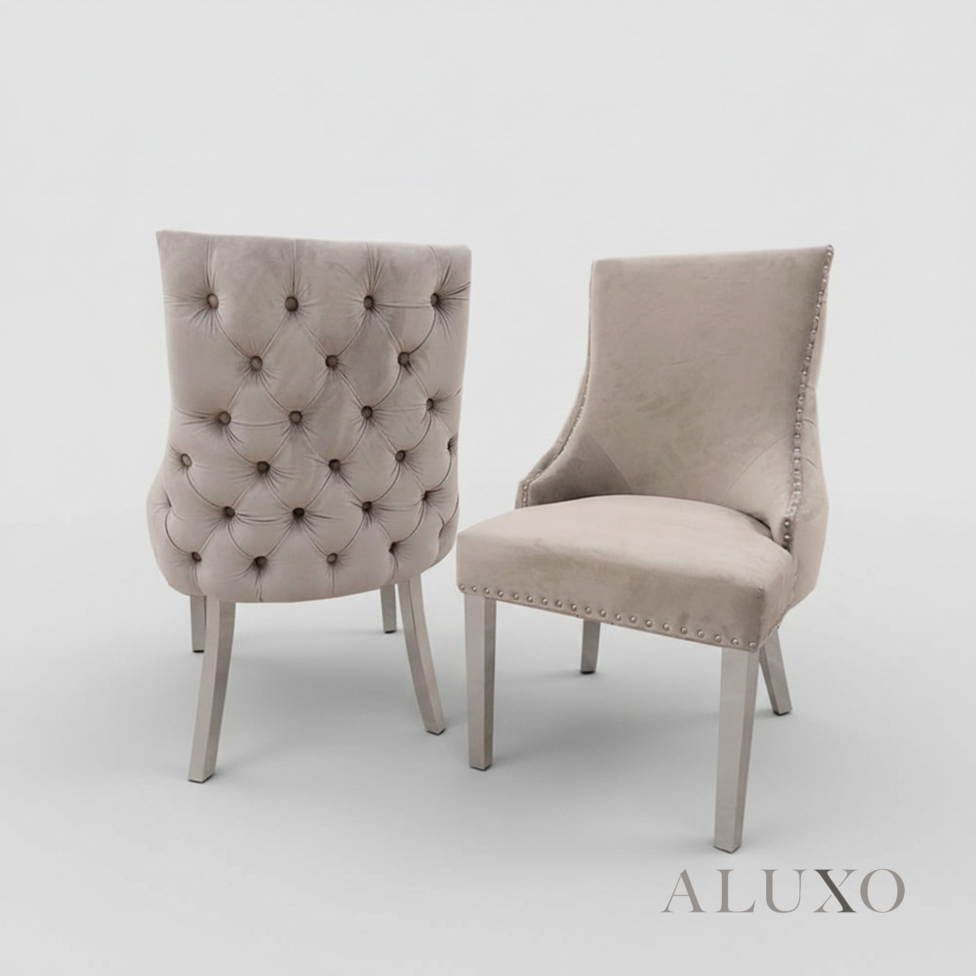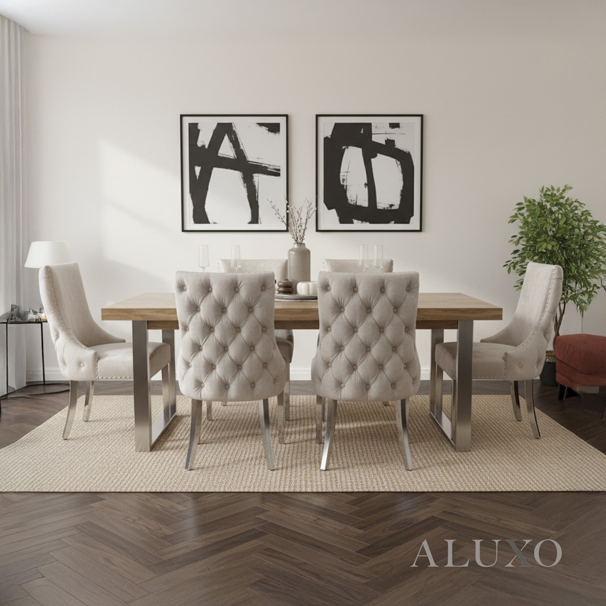 The Ivar 1.8m Light Pine Wood Dining Table features a subtly curved rectangular-wave tabletop, crafted from durable 5cm solid light pine wood with square chrome legs. Perfectly paired with Oskar Beige Velvet Chairs with button back design and stud detailing, this set combines a warm natural aesthetic with modern sophistication, ideal for 4–6 diners.