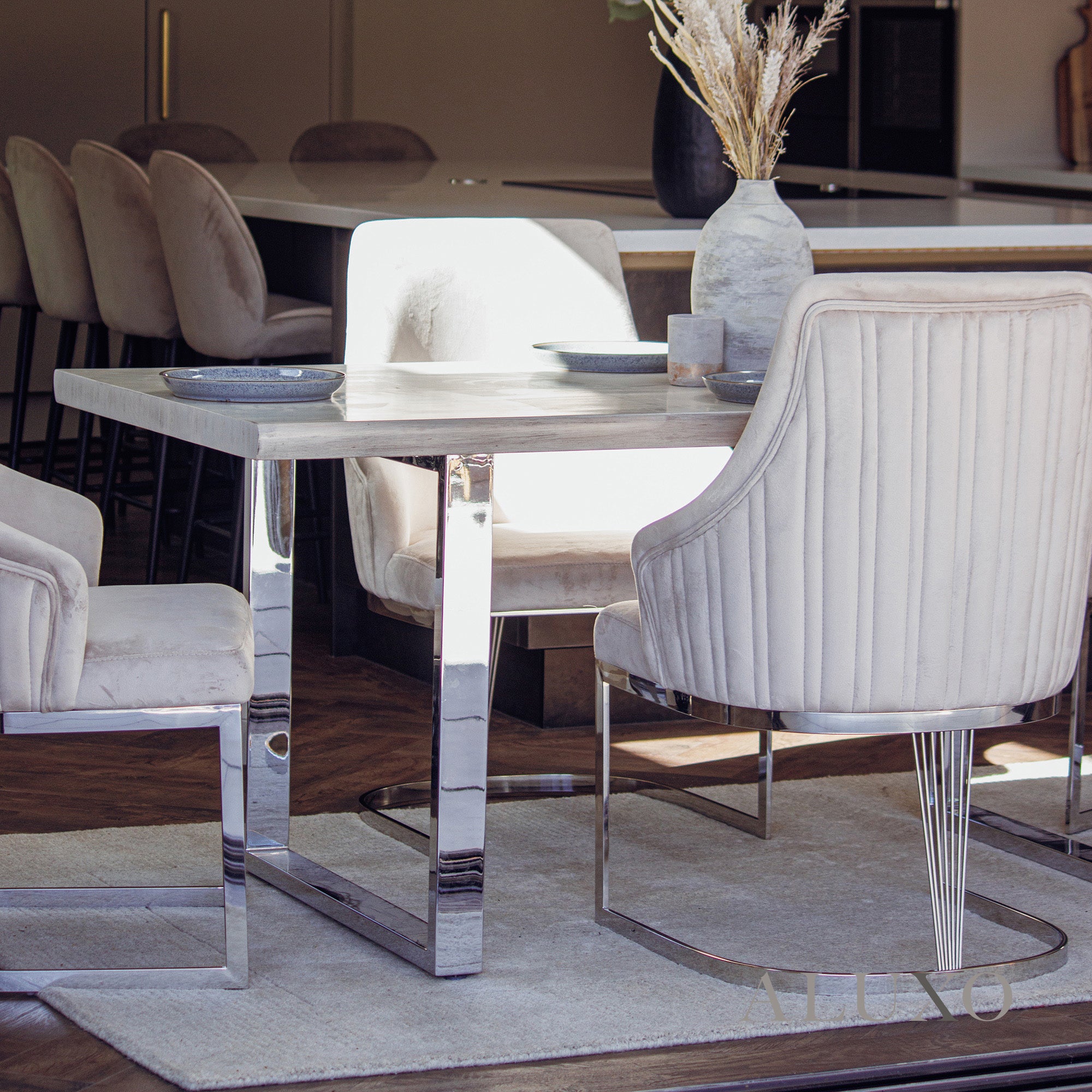 Discover the Ivar 1.8m Slimline Dining Set, featuring a beautifully crafted 5cm solid pine wood tabletop paired with sleek chrome square legs and luxurious Olivia velvet dining chairs. Designed for both everyday living and elegant entertaining, this modern set offers a perfect balance of durability, comfort, and timeless style.Aluxo-Track