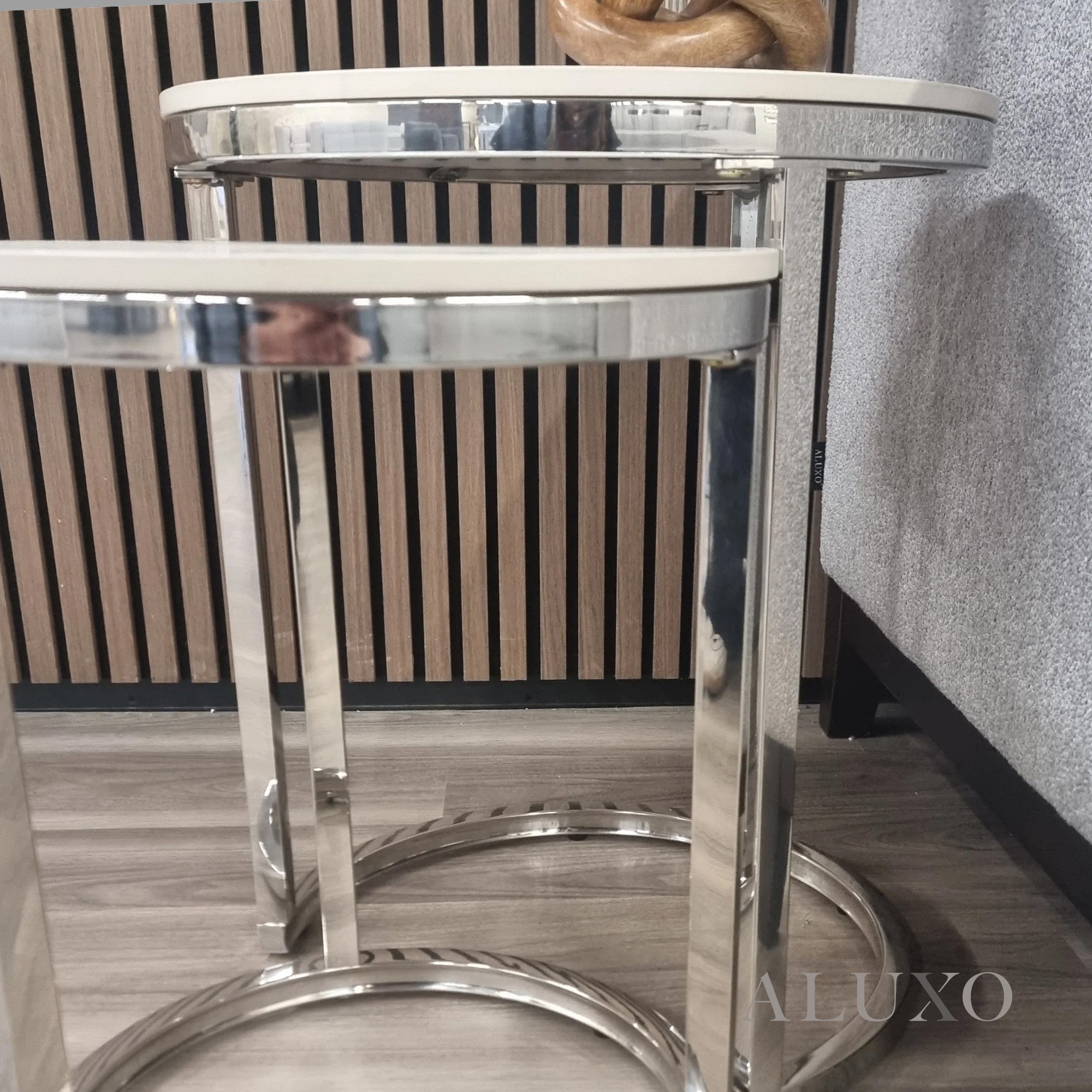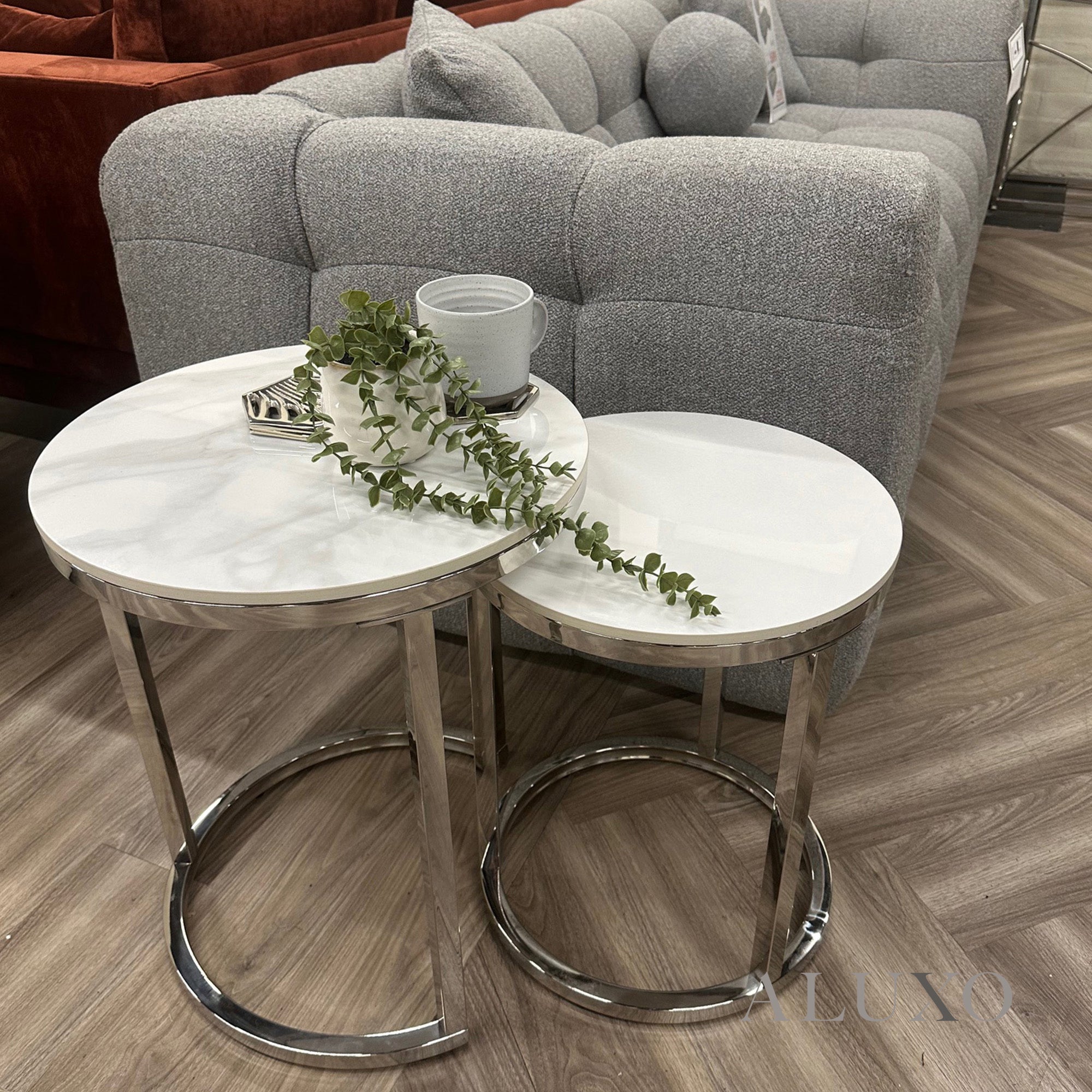 The Kaito Nest of 2 Round Side Tables combines sleek chrome metal legs with durable white sintered stone tops, offering modern elegance and versatile functionality. Perfect for small spaces, these nesting tables provide a stylish centrepiece for lounges, living rooms, or side areas.Aluxo-Track:KA452