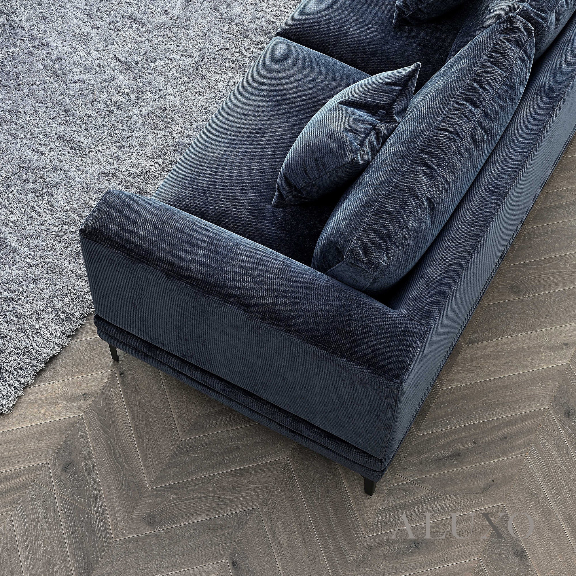 Upholstered in a light-reflective velvet-effect mermaid fabric, Lenox catches the eye in natural light and feels luxurious to the touch. The plush, generously padded soft cushions provide deep seating comfort with a medium-soft firmness rating.