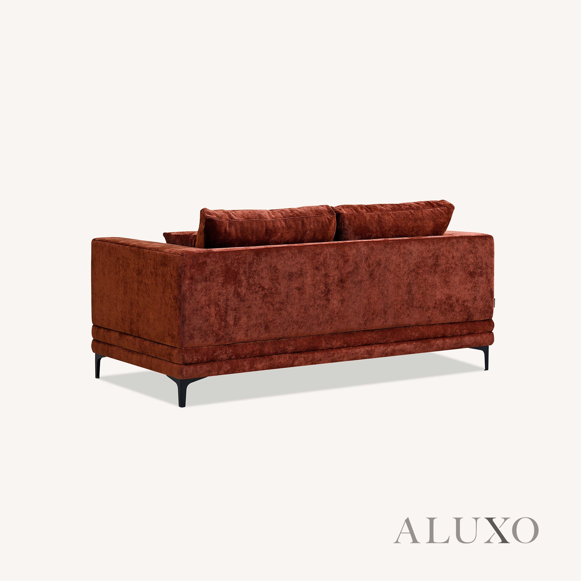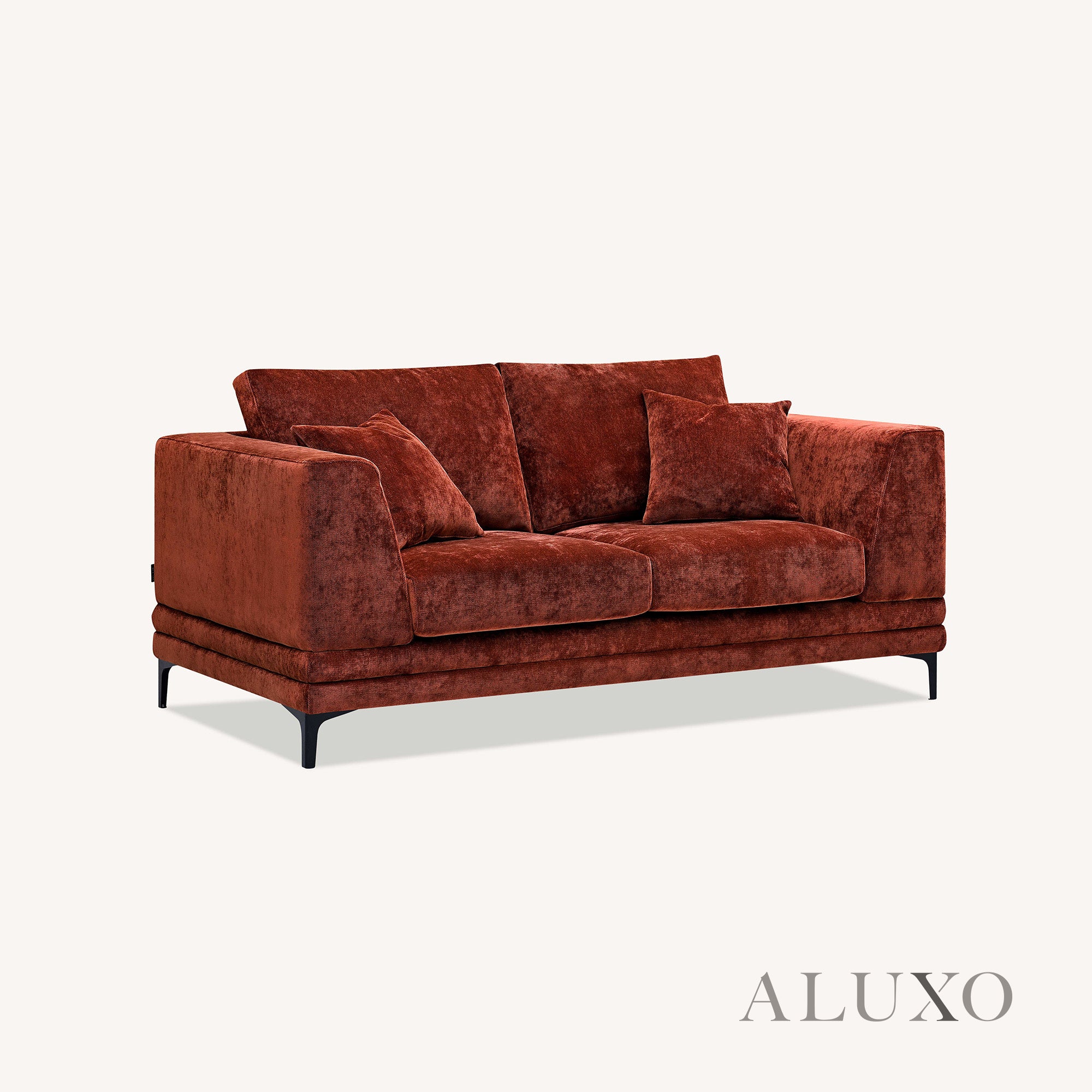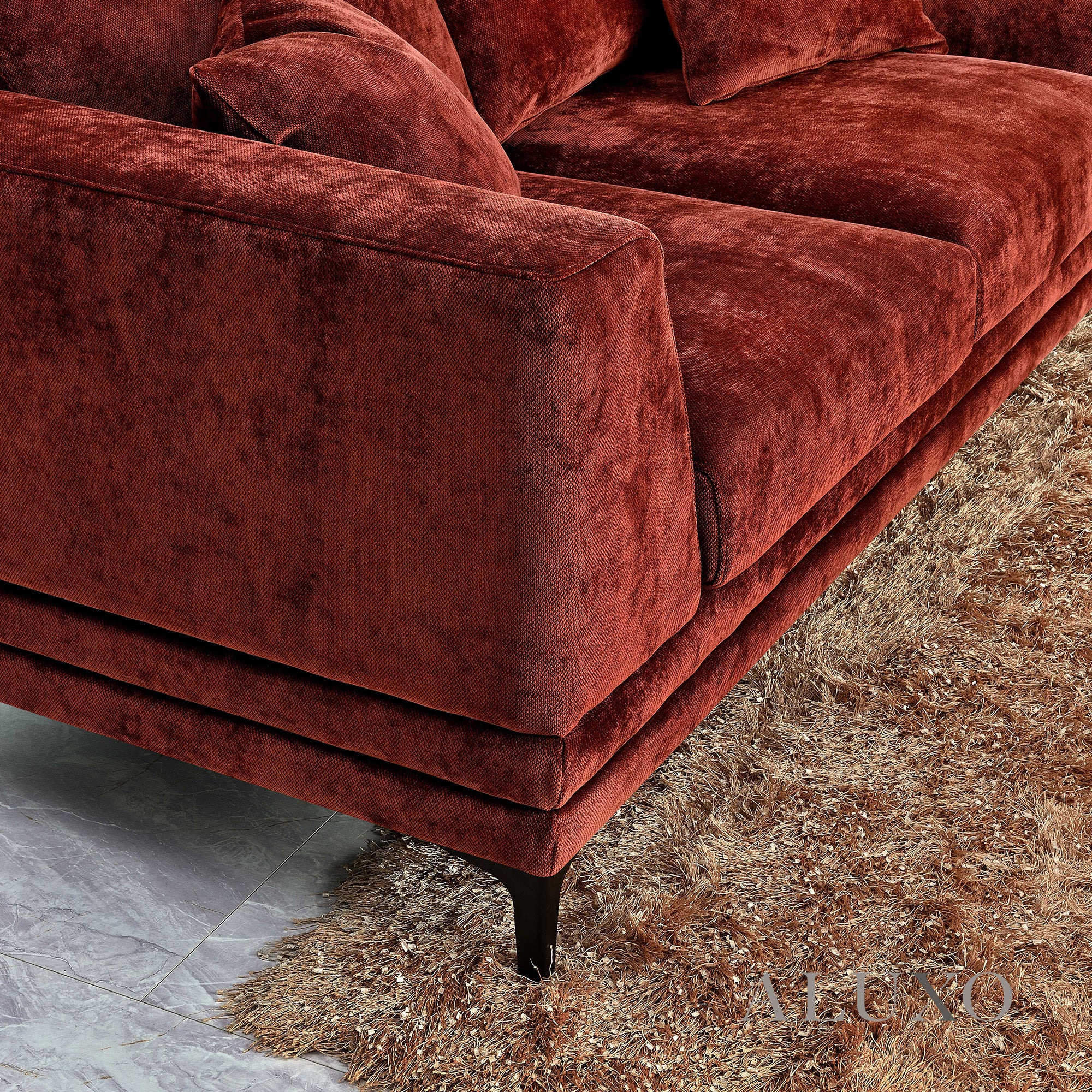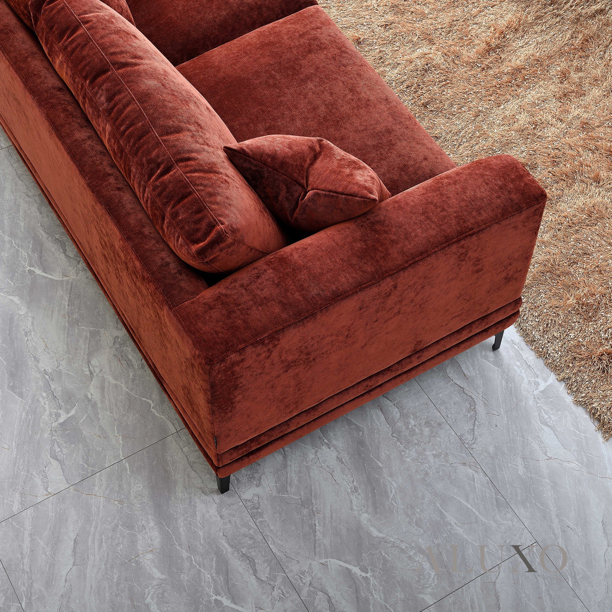 The ALUXO® Lenox Sofa Set in Rust Red Velvet captures the elegance of mid-century design with modern comfort. Elevated on a solid wood plinth, its squared edges and sleek silhouette make it a statement piece for contemporary homes. Aluxo-Track Aluxo-TrackCopy