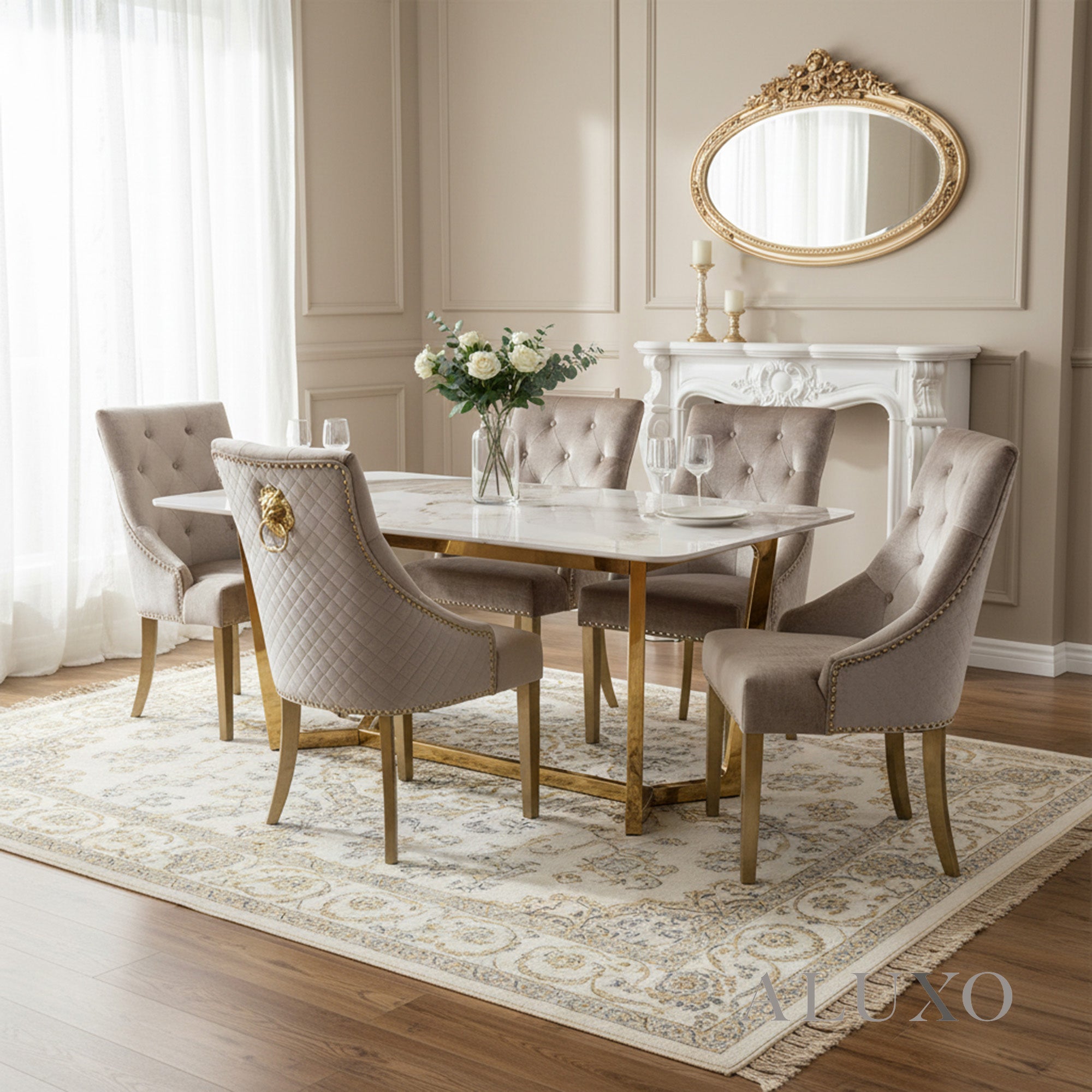 The Loki 1.8m Cream Sintered Stone Gold Dining Table Set with Henrik Beige Velvet Chairs perfectly blends luxury and functionality. Featuring a durable sintered stone top and striking gold angled base, this elegant dining set is ideal for stylish modern homes.Aluxo-Track