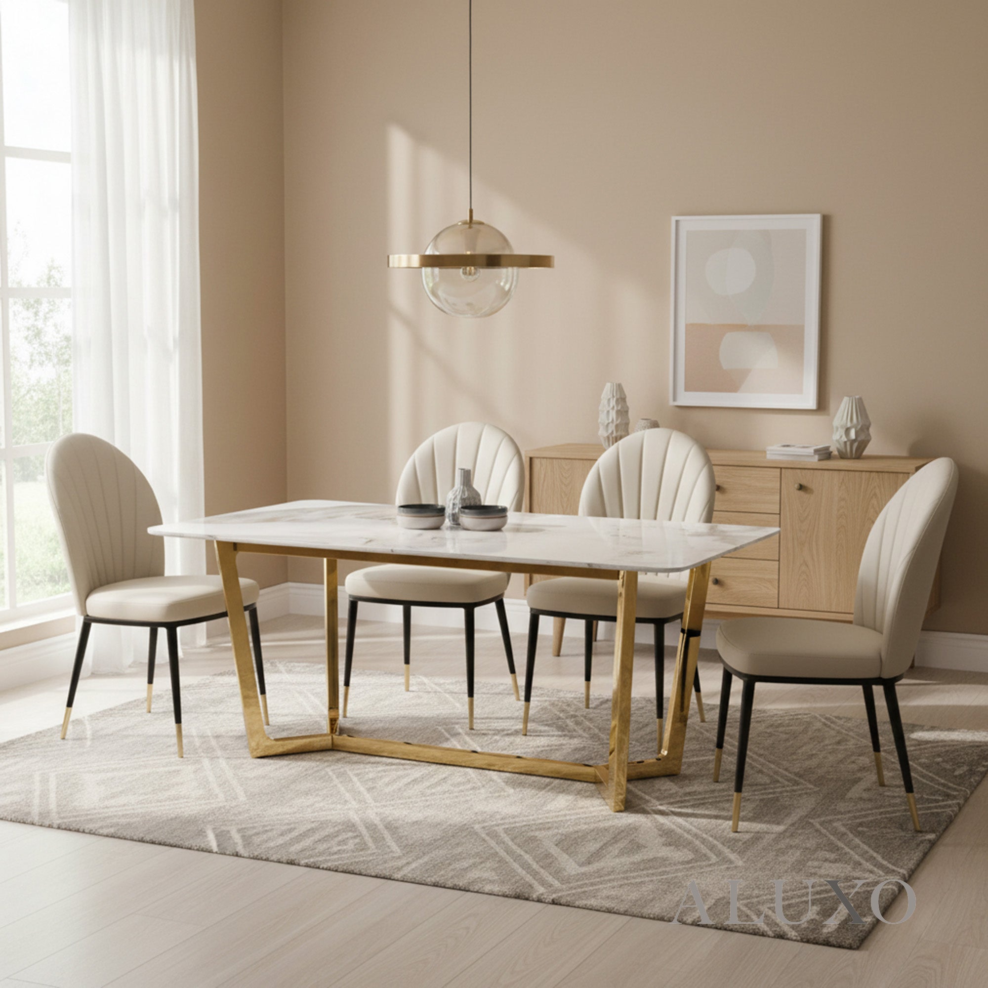 The Loki 1.8m Cream Sintered Stone Gold Dining Table Set paired with Olle Beige Leather Chairs brings together modern sophistication and timeless style. With its elegant gold base and durable sintered stone top, this dining set adds a luxurious yet practical touch to any dining space.LokiOlle-Intro