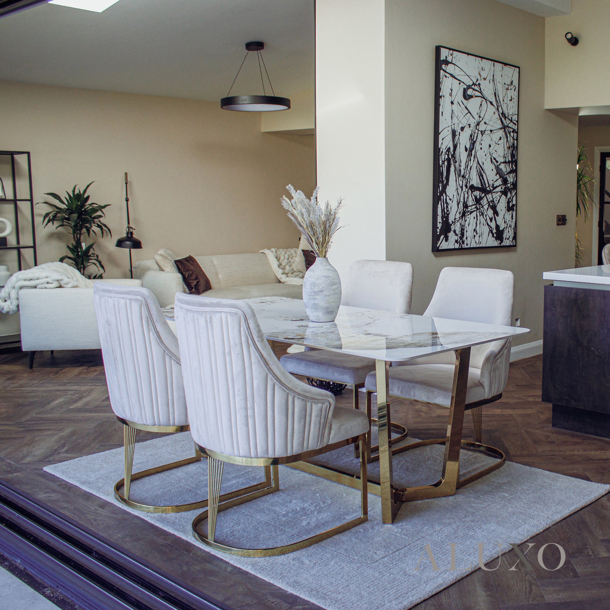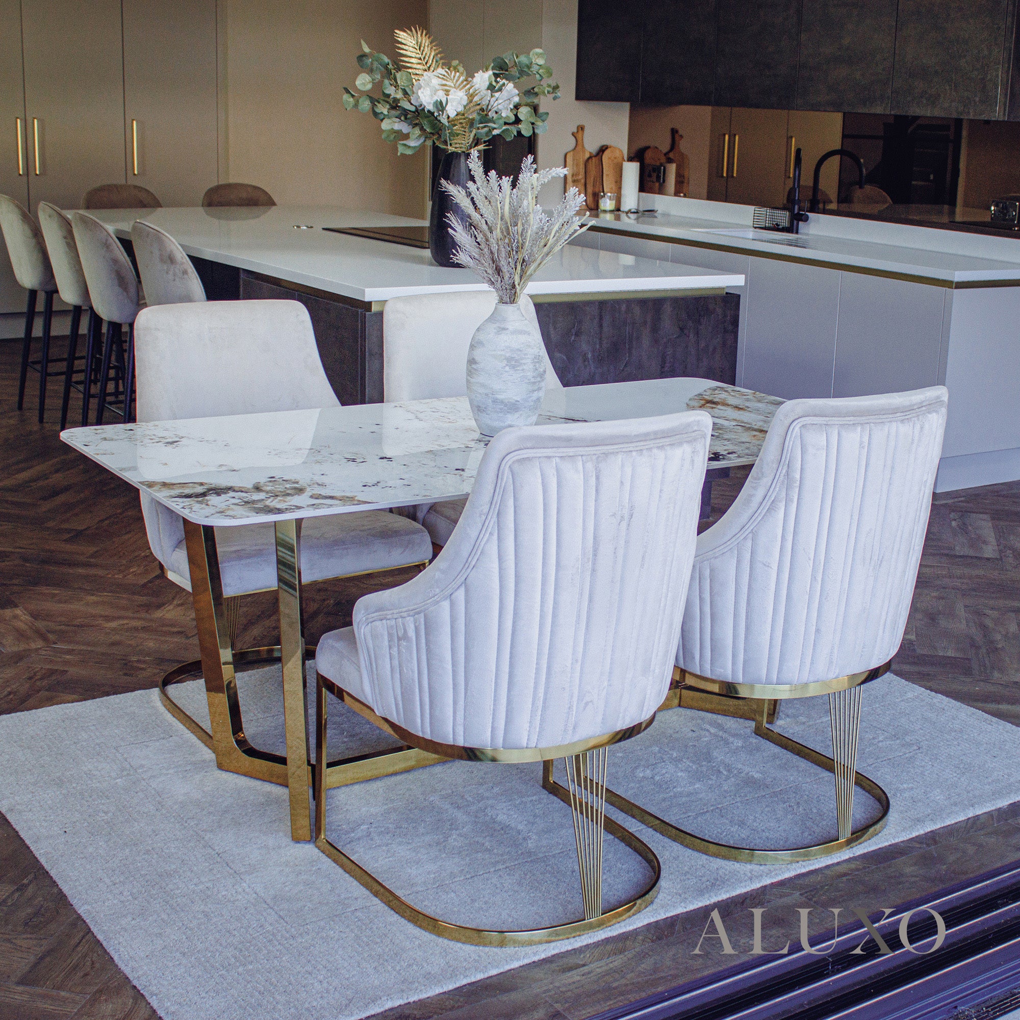 Discover the Loki 1.8m Rectangular Dining Set, combining a stunning 10mm cream sintered stone tabletop with an elegant gold angled base and paired with luxurious Olivia velvet dining chairs. Designed for modern living, this set blends style, comfort, and durability, perfect for small to large families.