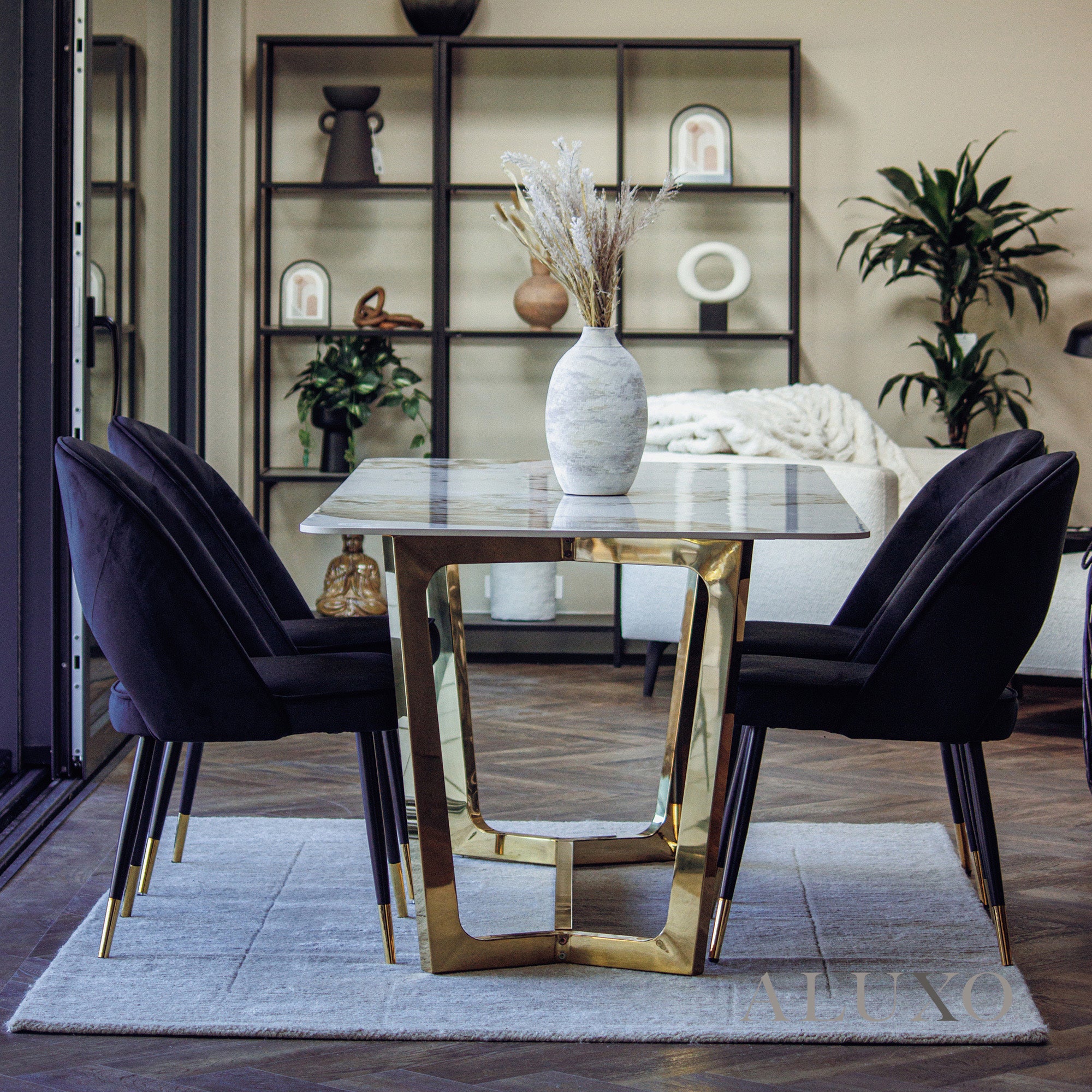 Discover the Loki 1.8m Rectangular Dining Set, combining a stunning 10mm cream sintered stone tabletop with a sophisticated gold angled base and paired with plush Bjorn velvet dining chairs. Perfectly blending modern elegance with Scandinavian comfort, this set is ideal for small to large families.
