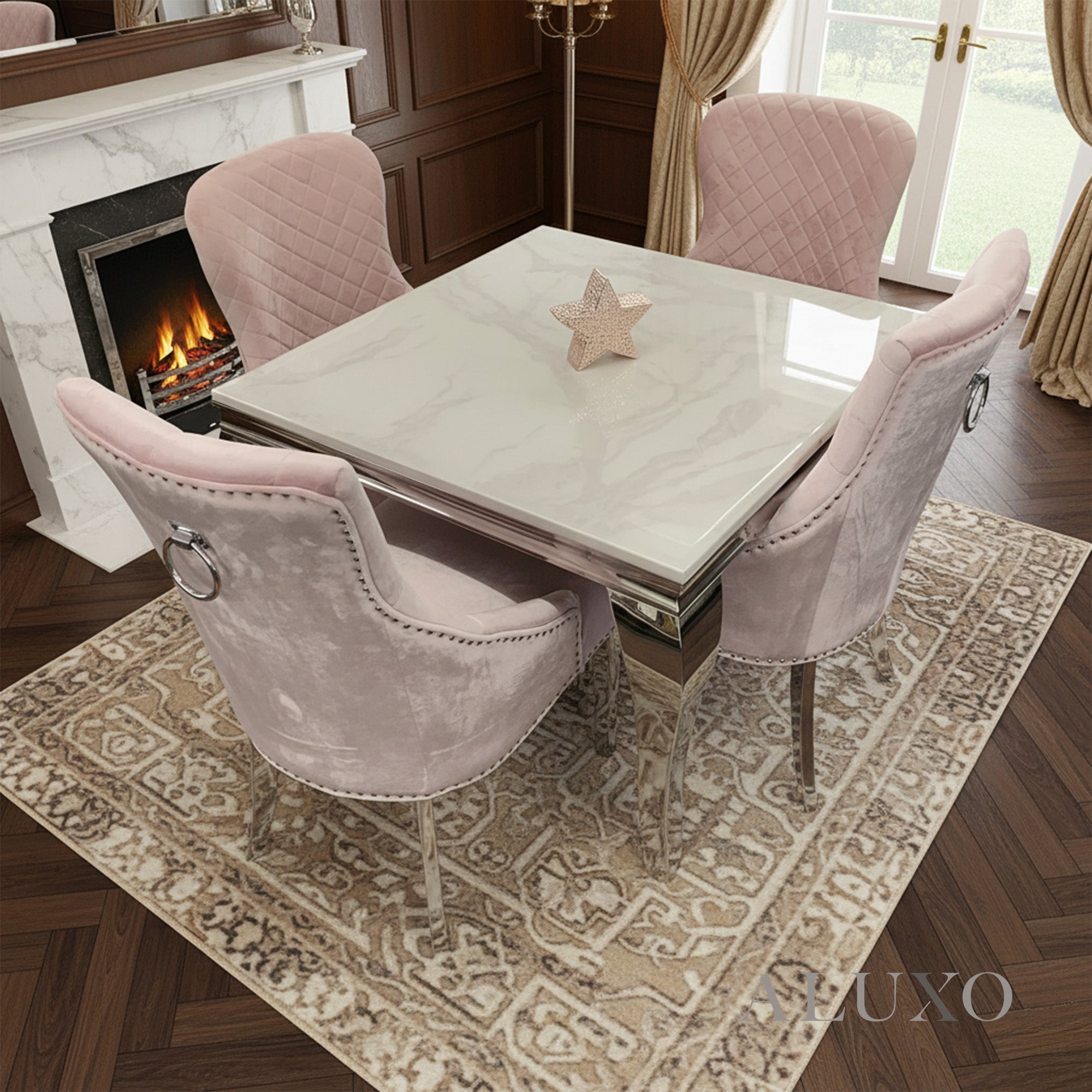 Elevate your dining space with the Lorens 1.0m Square Chrome Dining Table, featuring a sophisticated white marble effect top that blends timeless elegance with modern minimalist design. Its compact square shape comfortably accommodates up to four diners, making it perfect for couples or small families. LOR-Track:UK-02
