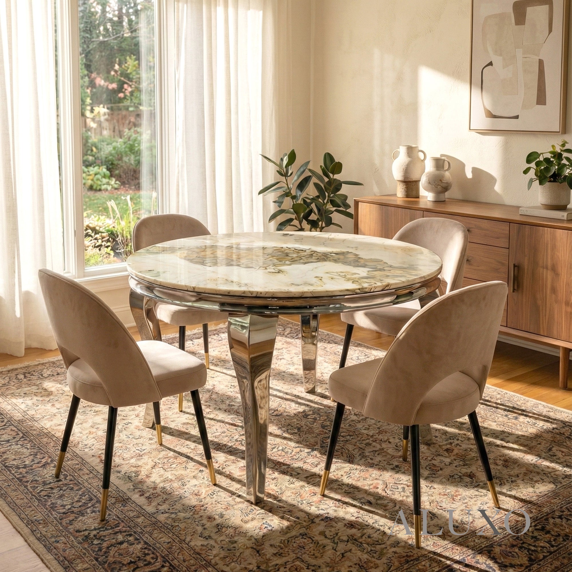 The Lorens 1.3m Round Chrome Dining Set pairs a stunning cream marble top with elegant curved chrome legs, completed with the beautifully upholstered Bjorn Beige Velvet Scandinavian Chairs. A compact luxury centrepiece perfect for 4 diners.LorensBjorn-Intro
