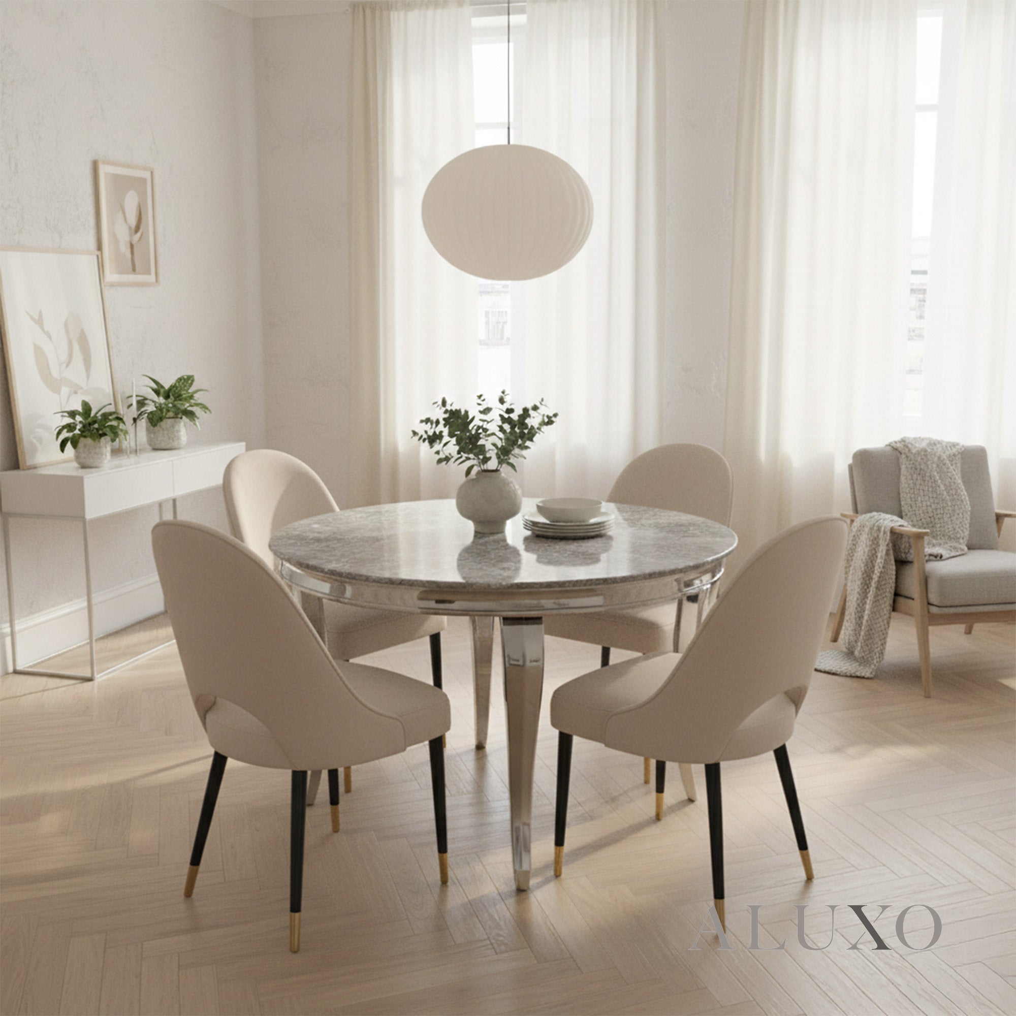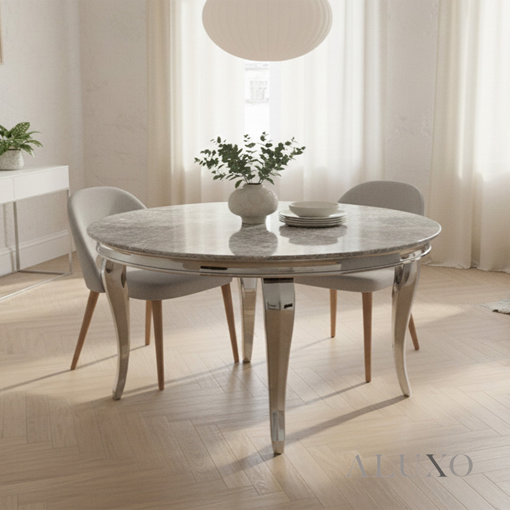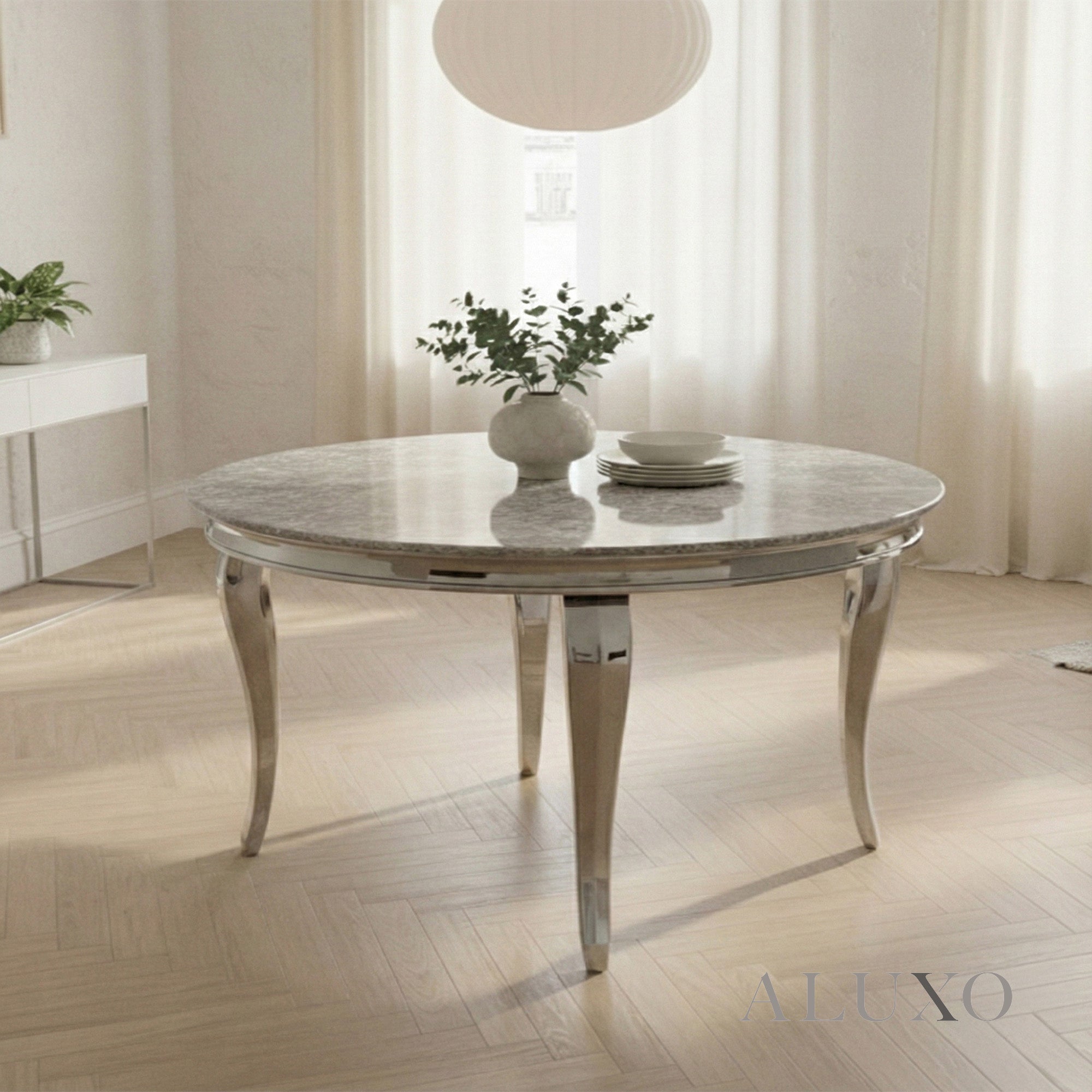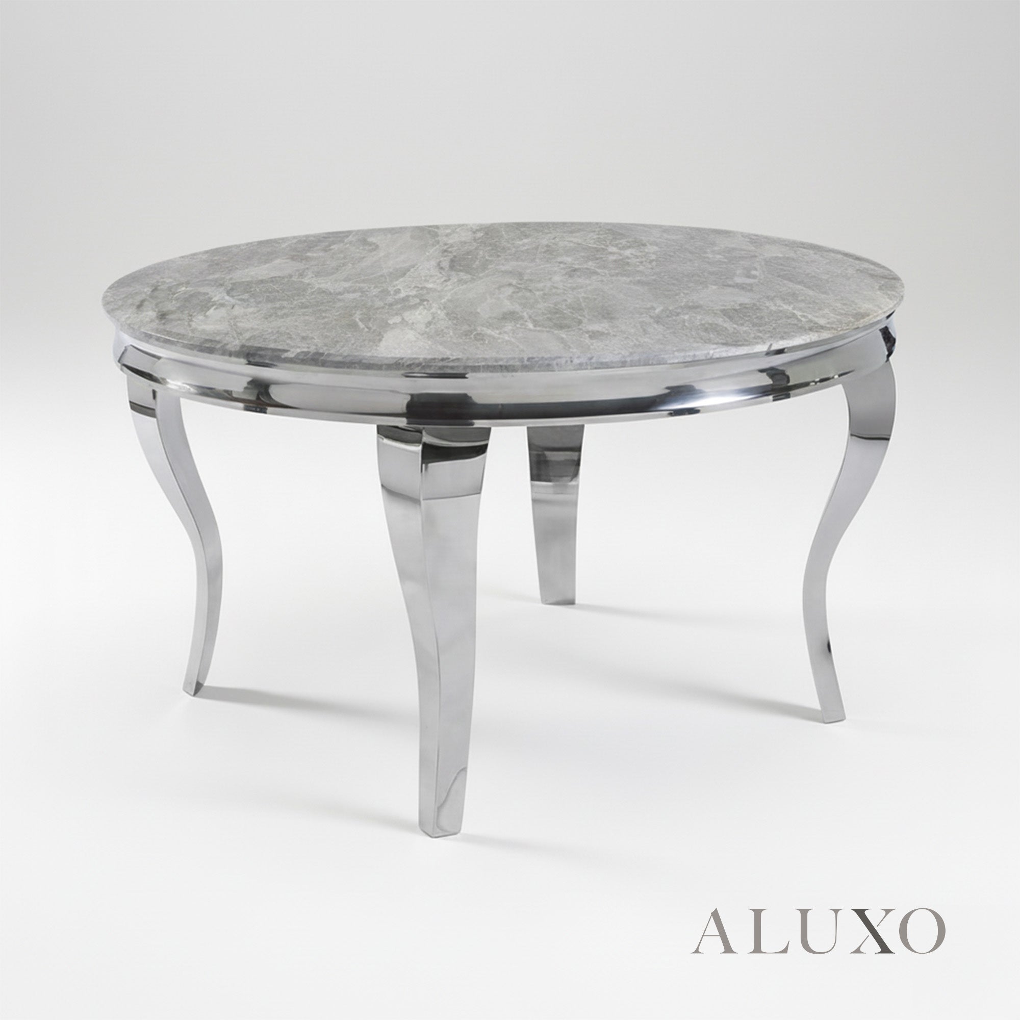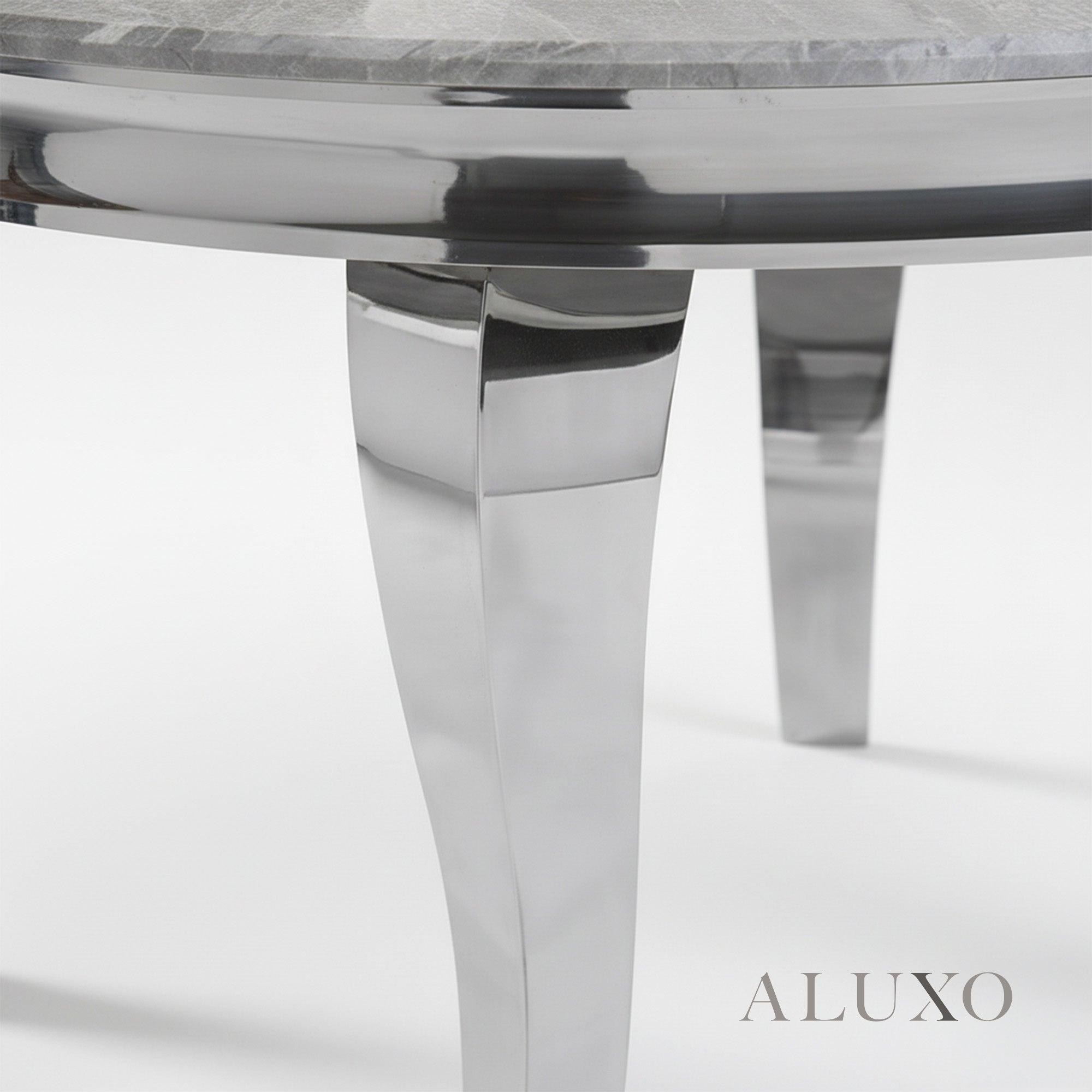 Featuring a 15β20mm marble laminate tabletop in grey, each piece has a unique marble pattern for a one-of-a-kind look. The table is supported by curved chrome metal legs, combining durability with a chic, contemporary style. LOR-RND-Key:UK-GRY