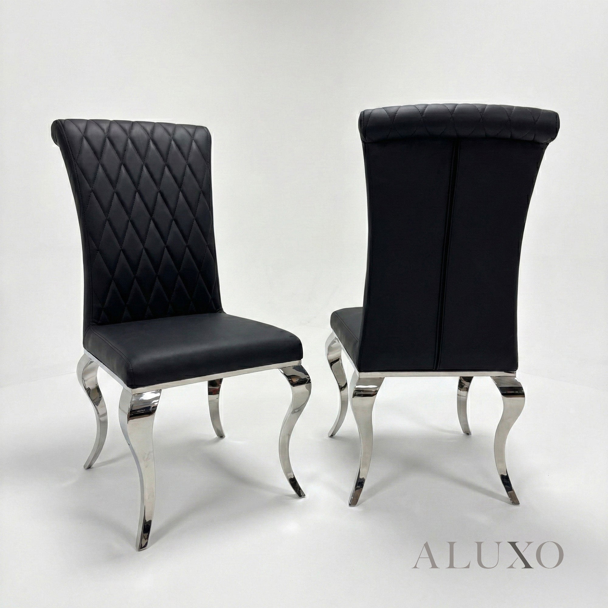 The Lorens 1.0m Square Chrome Dining Set showcases a striking black & gold marble tabletop paired with elegant curved chrome legs, complemented by the sleek Niklas Faux Leather Dining Chairs. A perfect choice for couples or compact dining spaces seeking modern luxury. LorensNiklasBG-Intro