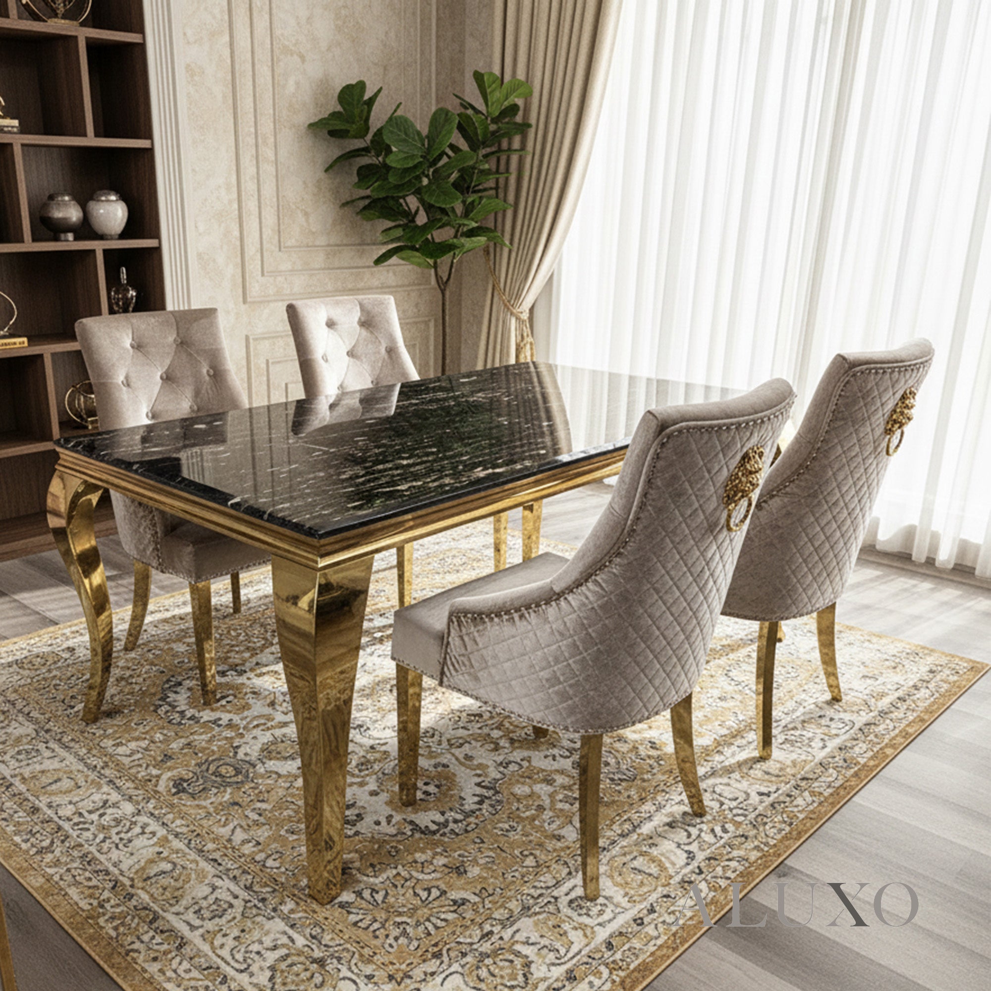 Experience luxury dining with the Lorens 1.8m Black & Gold Marble Dining Table Set, complete with elegant Henrik beige velvet chairs. Featuring a durable 15–25mm black & gold marble top and gold curved metal legs, this stunning set comfortably seats up to 8 and transforms any dining space into a sophisticated retreat.Aluxo-Track