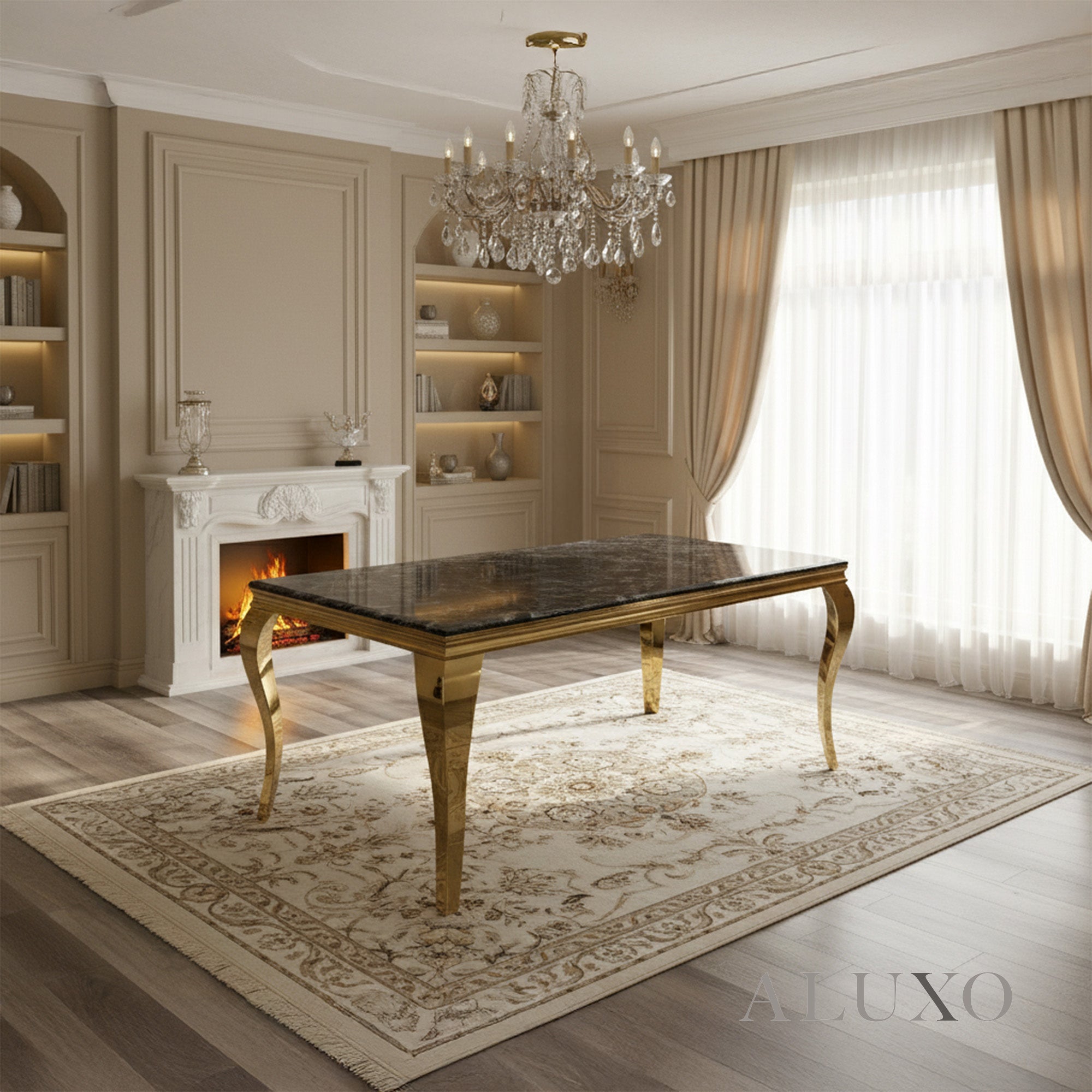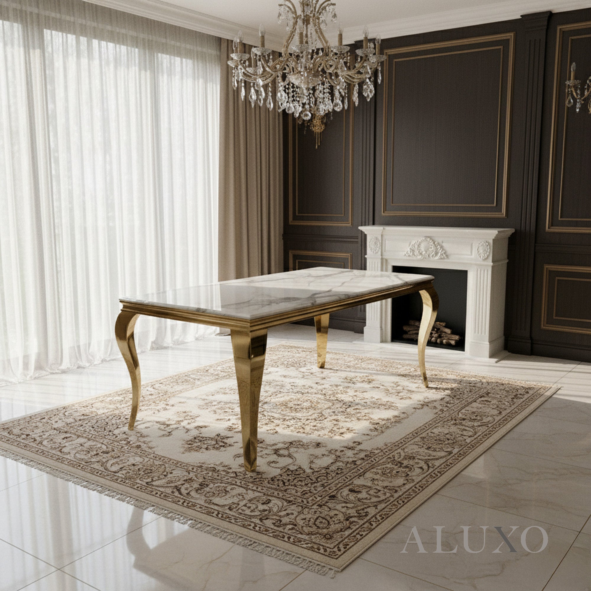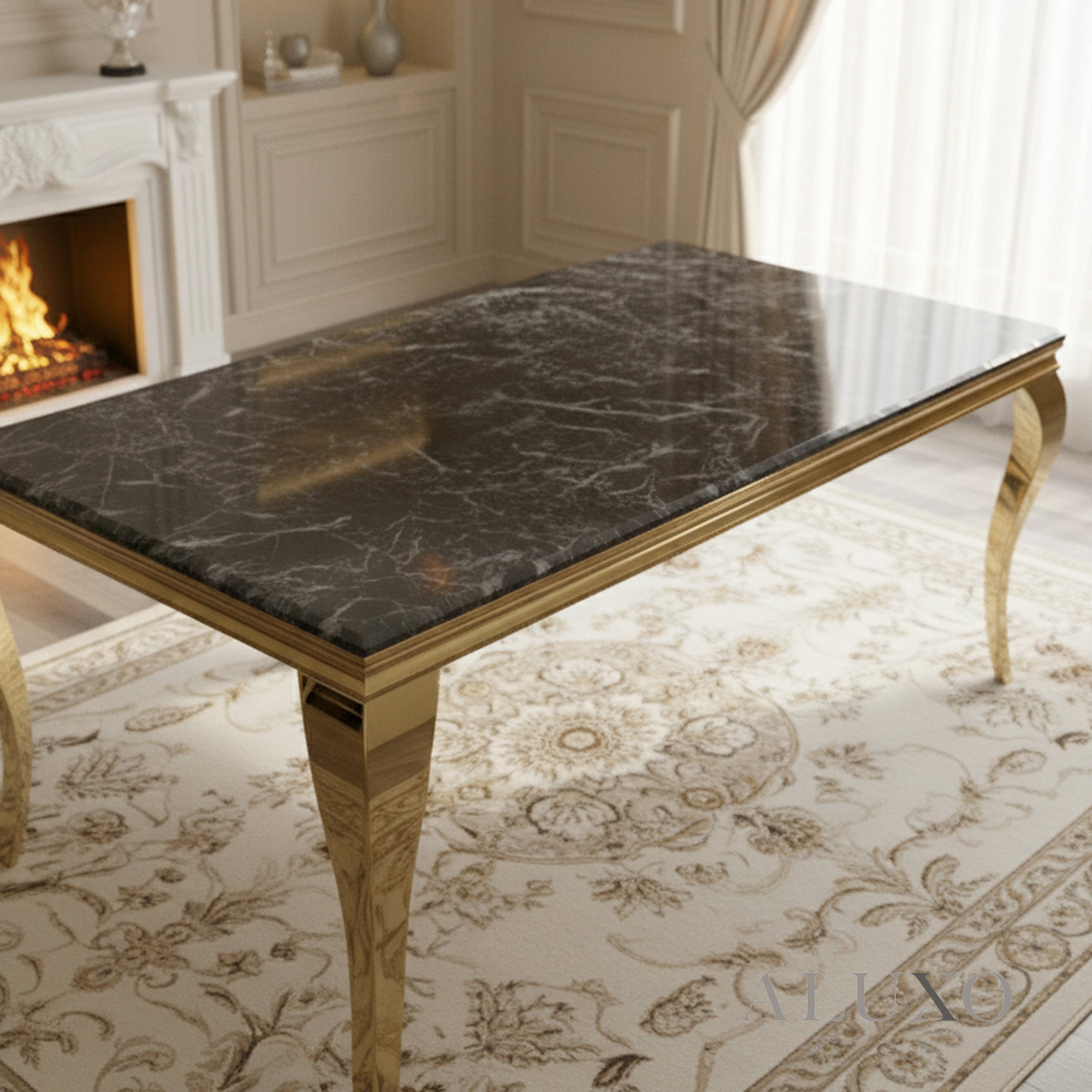 The striking curved gold metal legs and sturdy frame provide both strength and glamour, making this table not just practical but also a centrepiece that enhances your dining room instantly. LOR-G-Dim:UK-180