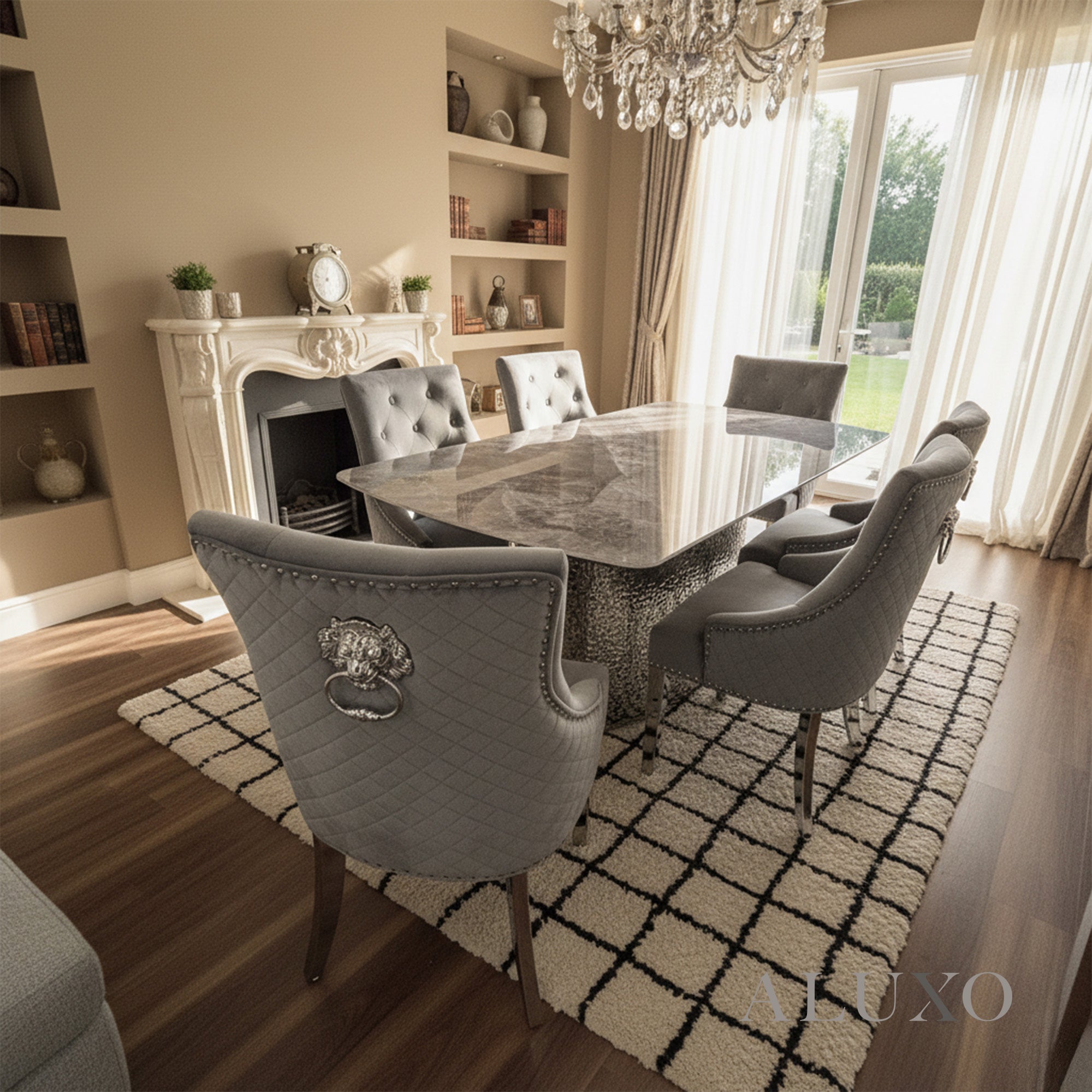 The 15mm thick natural marble top rests on a bold hammered metal block base for a sophisticated contrast that enhances contemporary interiors. Ideal for 4–6 guests (160cm) or 6–8 guests (180cm), this table brings both practicality and presence. Aluxo-MB