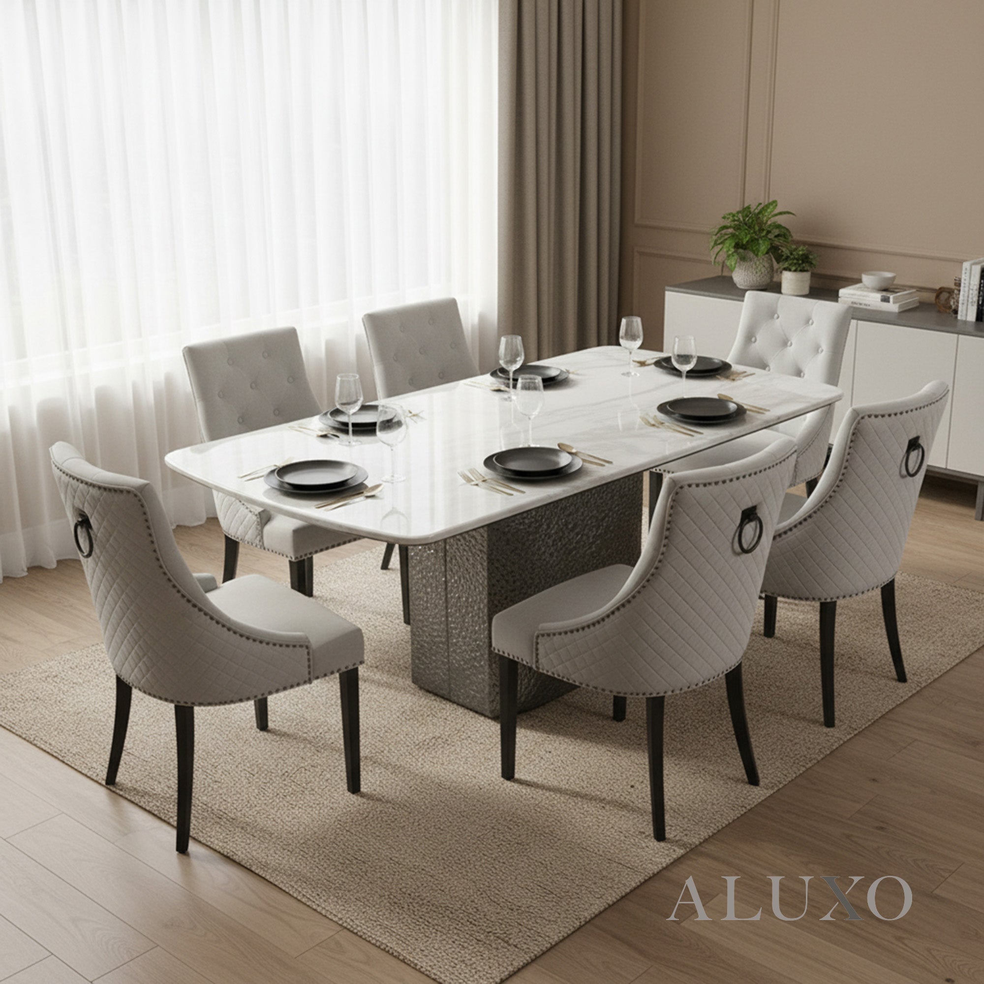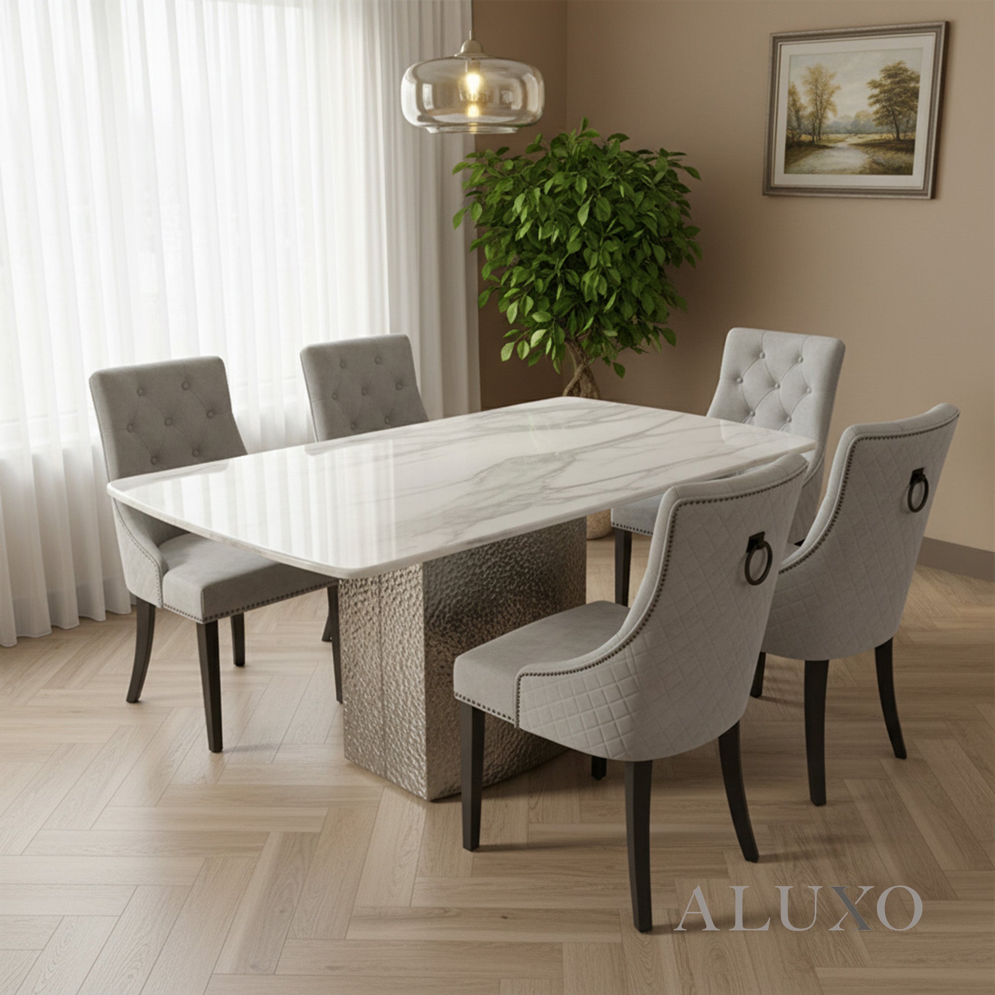 The Lucca 1.8m Rectangular Slimline Dining Set combines a luxurious marble tabletop with Gunnar Velvet Dining Chairs, creating a sophisticated and timeless dining experience. Its slimline form and hammered metal block base bring a modern edge to elegant living.LuccaGunnar-Intro