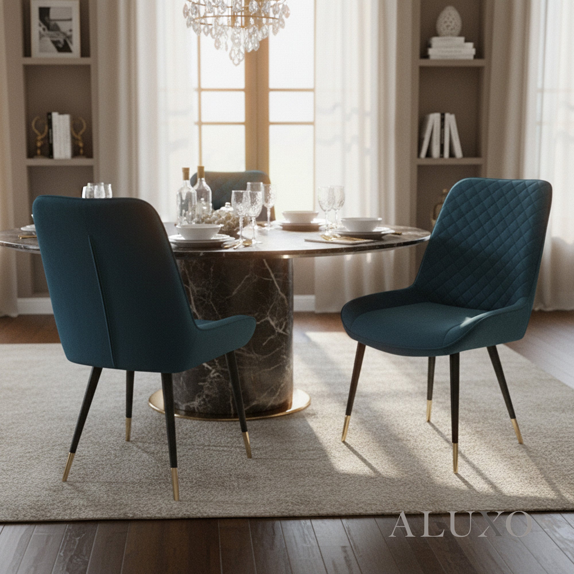 The Lyder Plush Velvet Dining Chair combines luxury comfort with a modern Scandinavian-inspired design. Crafted with a smooth plush velvet finish and accented with a distinctive cross-stitch detail, Lyder brings elegance and refinement to your dining space Aluxo-Track Aluxo-TrackCopy.