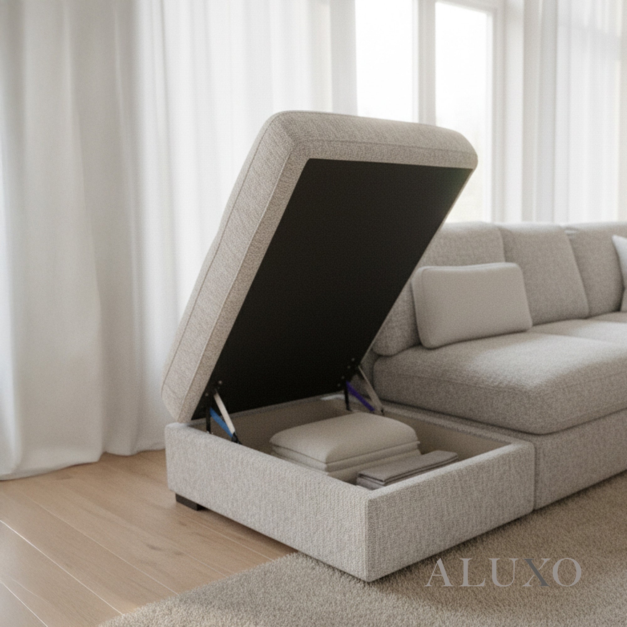 The included storage stool adds extra functionality, providing both seating and discreet storage. Completed with solid wood legs and four plush scatter cushions, the Madison combines practicality with modern sophistication.