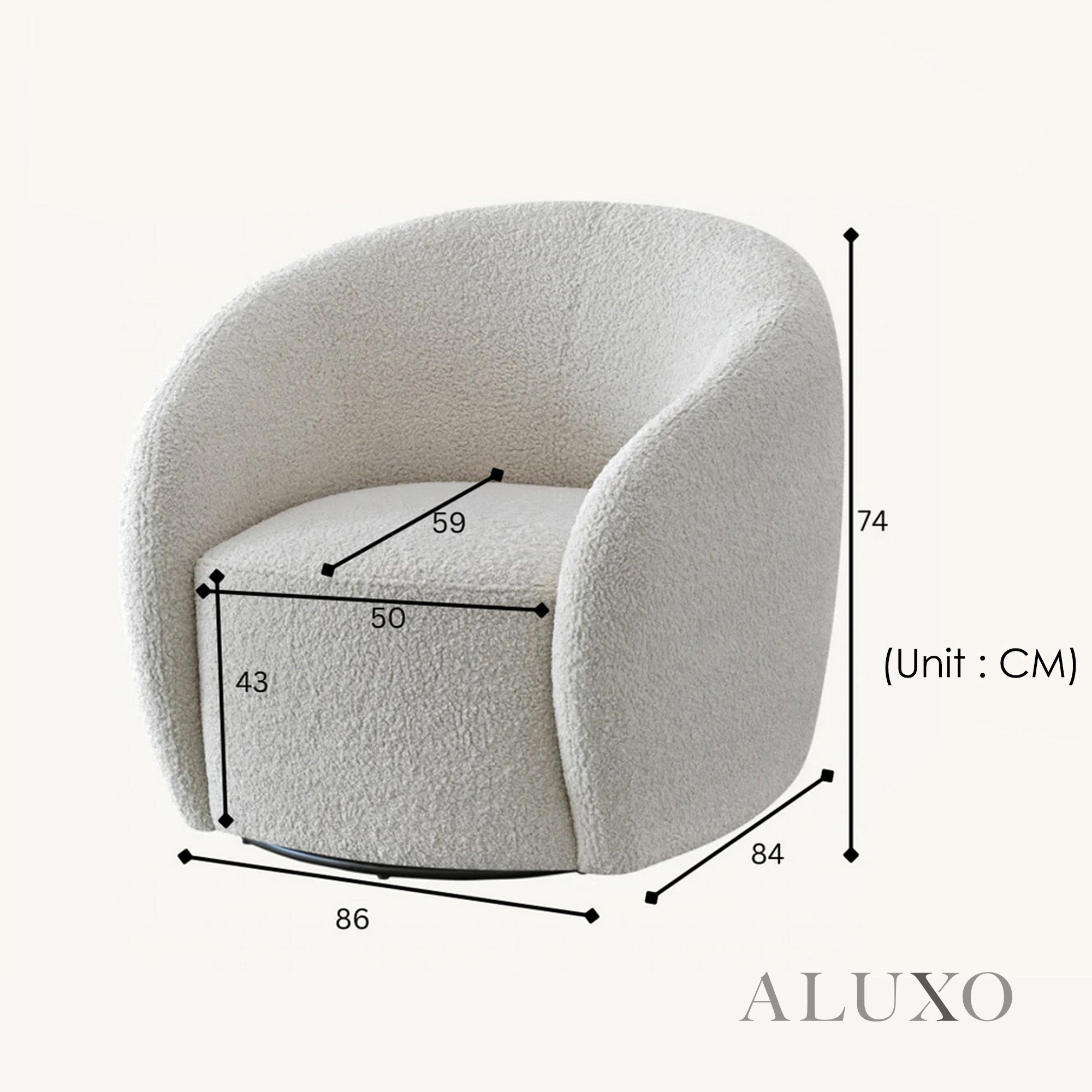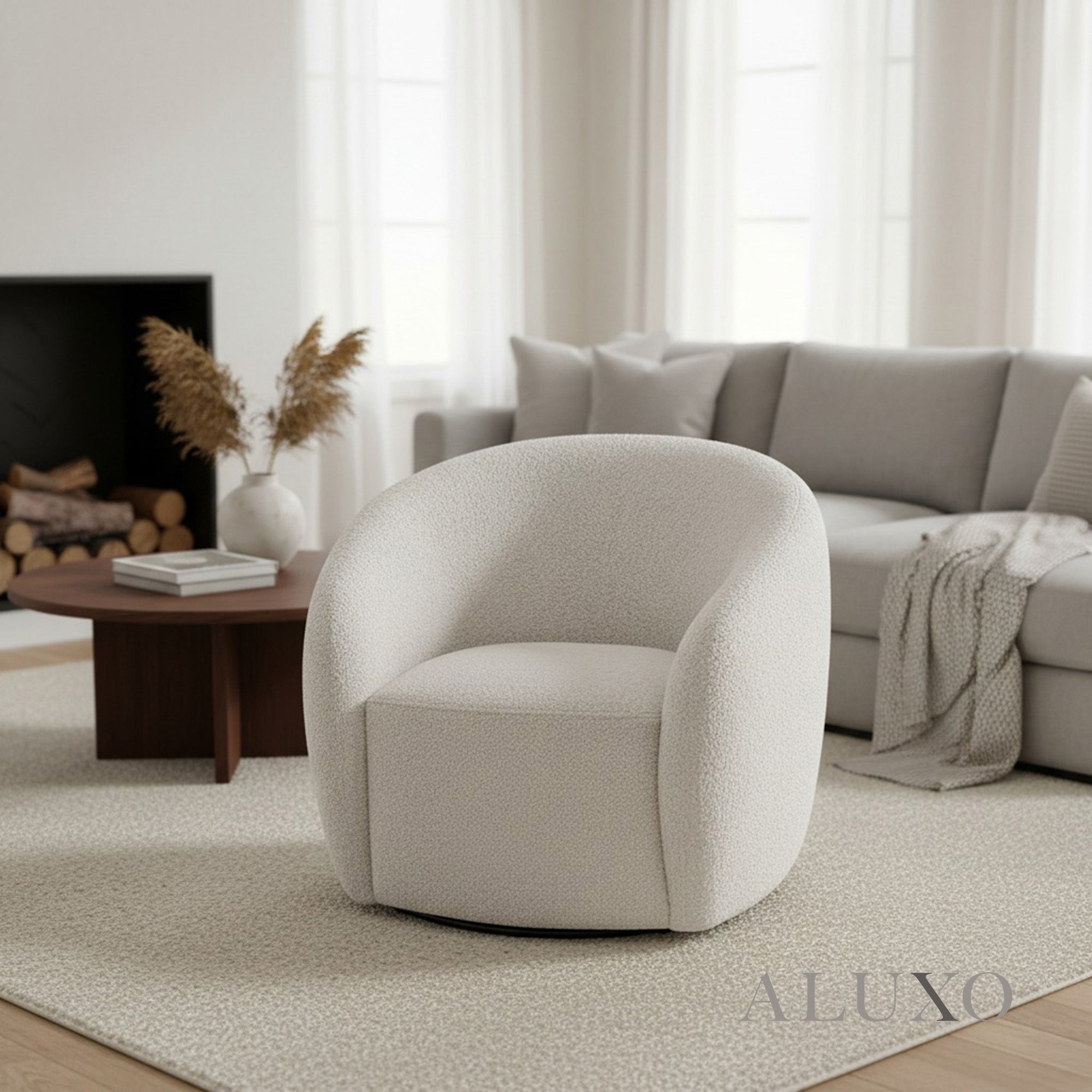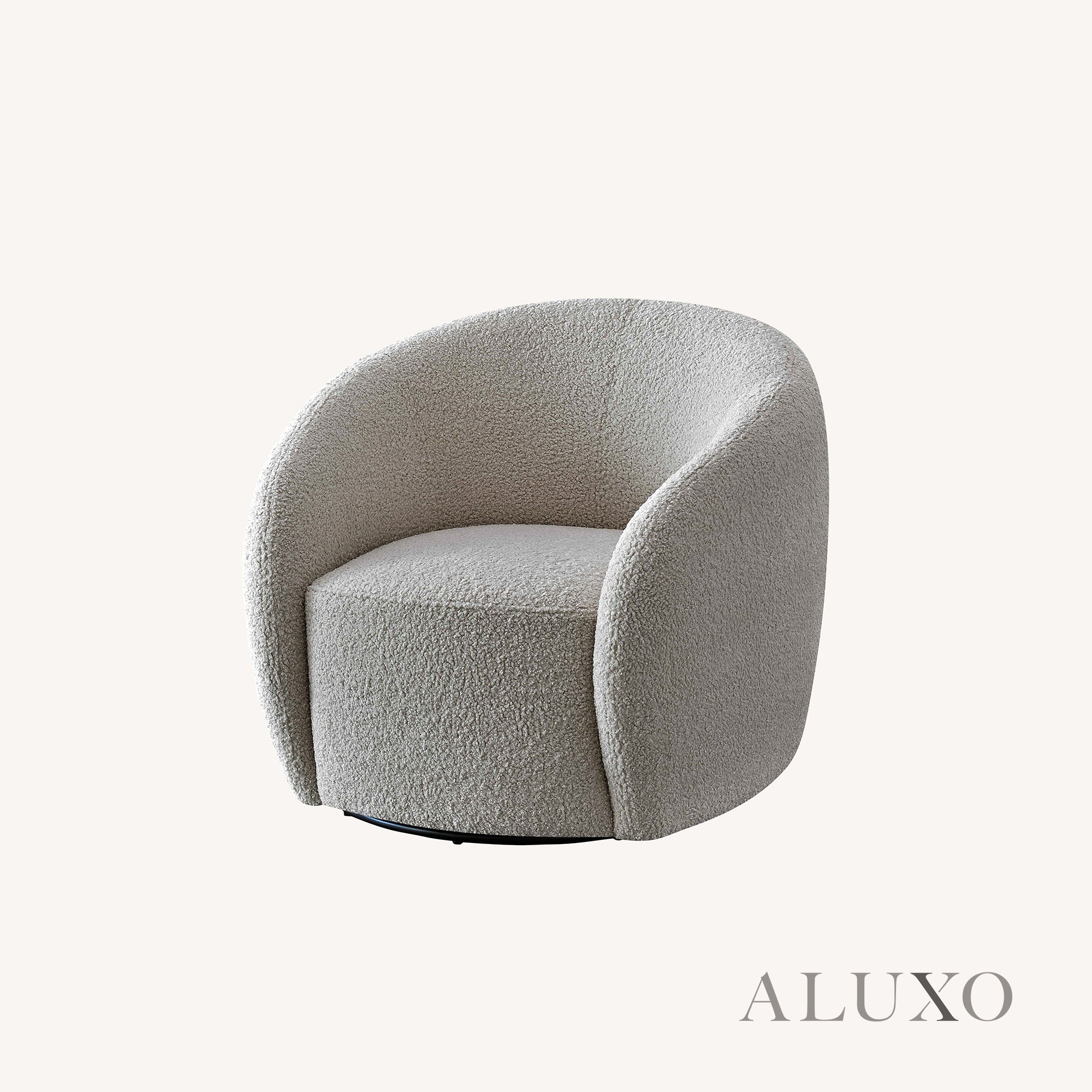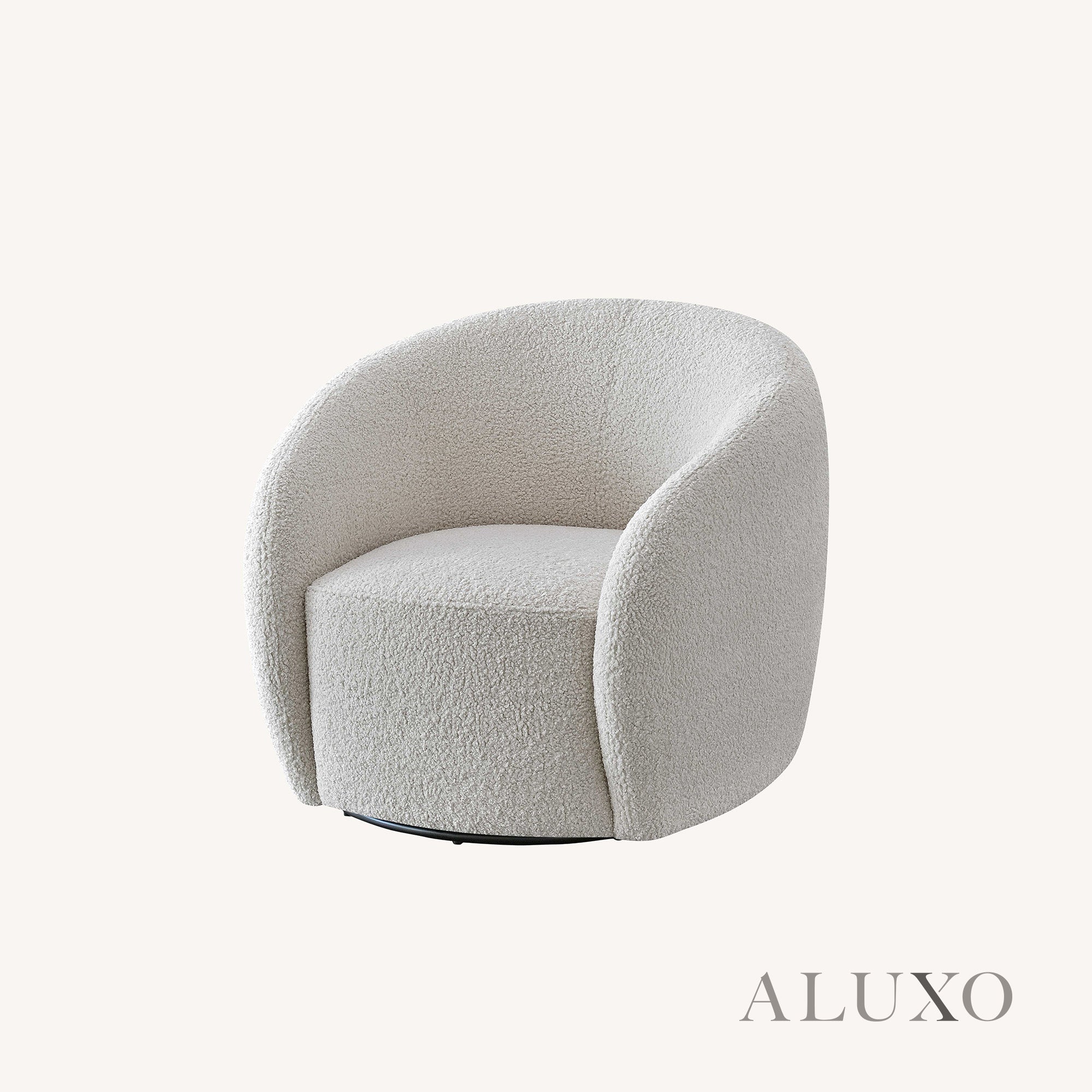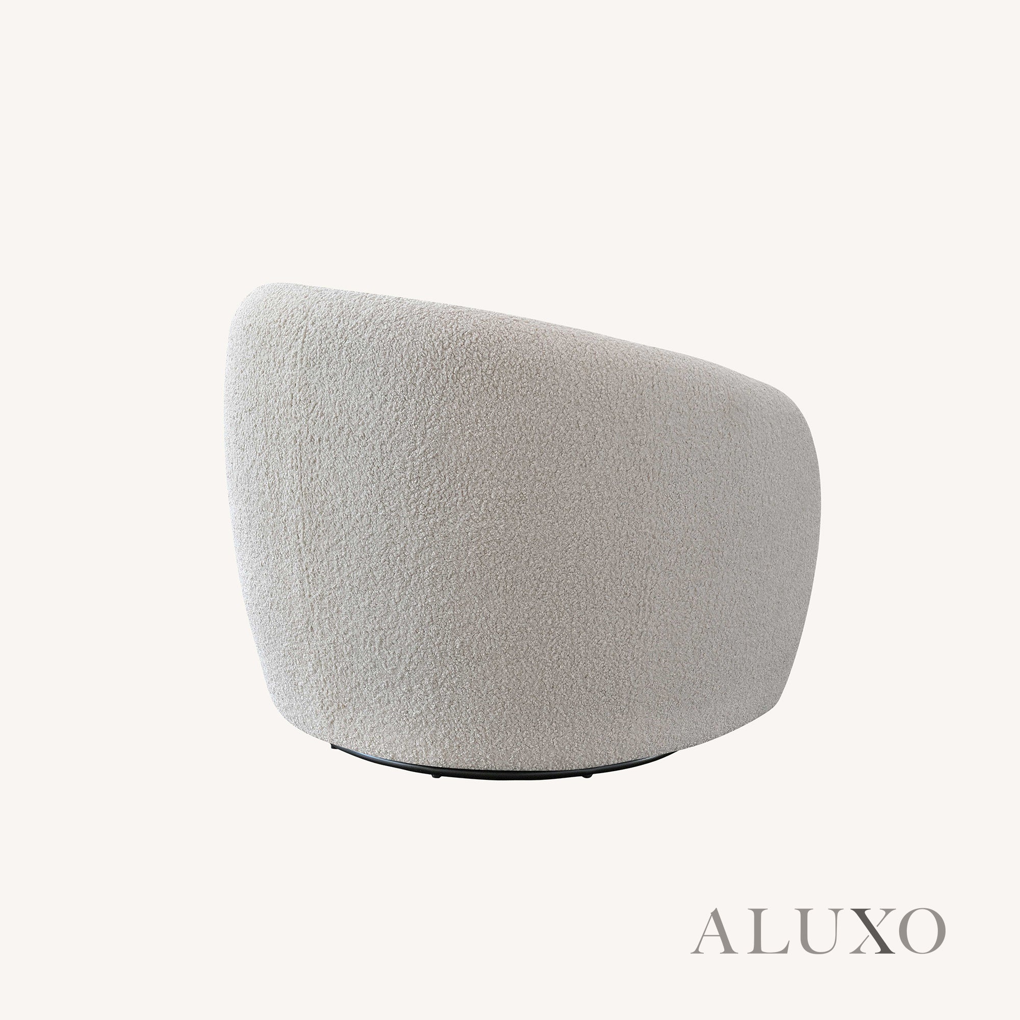 The ALUXO® Nolita Swivel Chair brings plush texture and sculptural elegance to any modern space. Wrapped in teddy-style bouclé, its curved back hugs you in cosiness while the organic form offers a contemporary aesthetic. Aluxo-Track Aluxo-TrackCopy